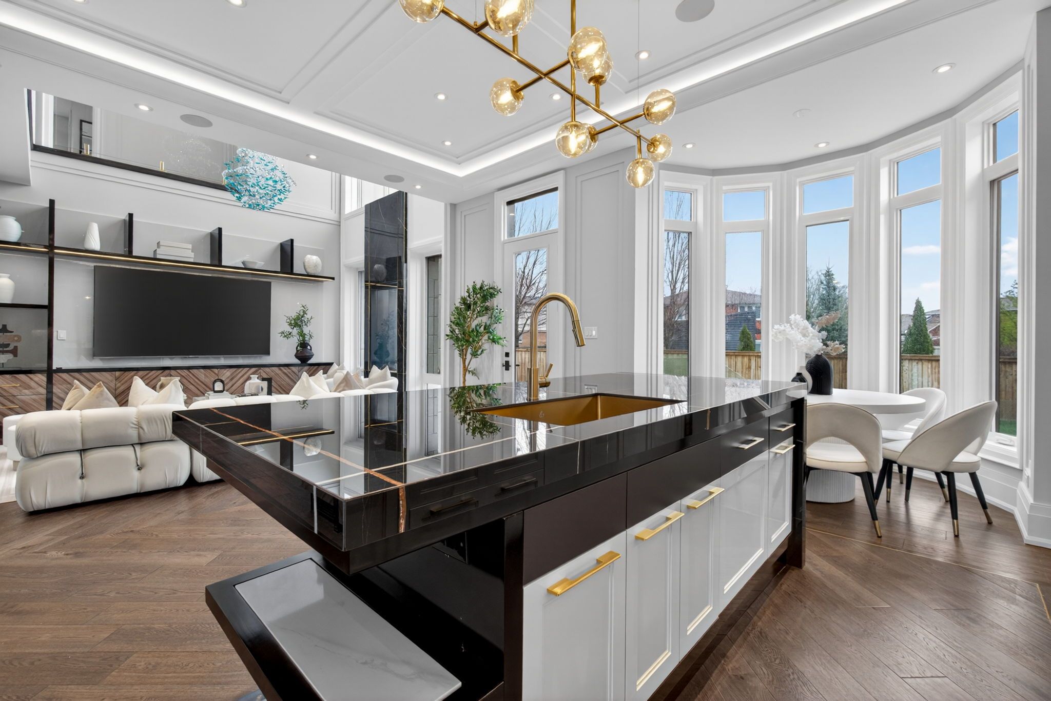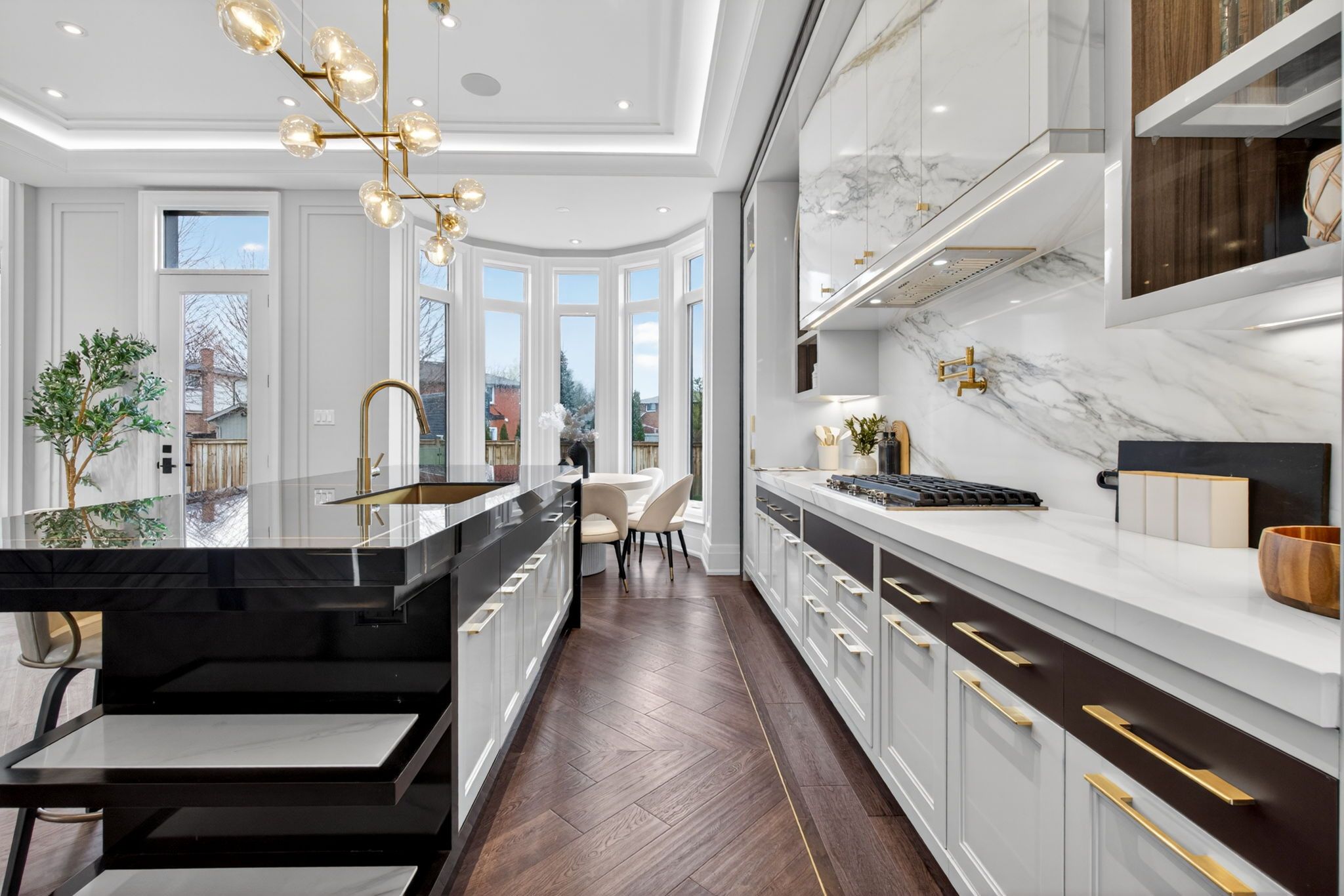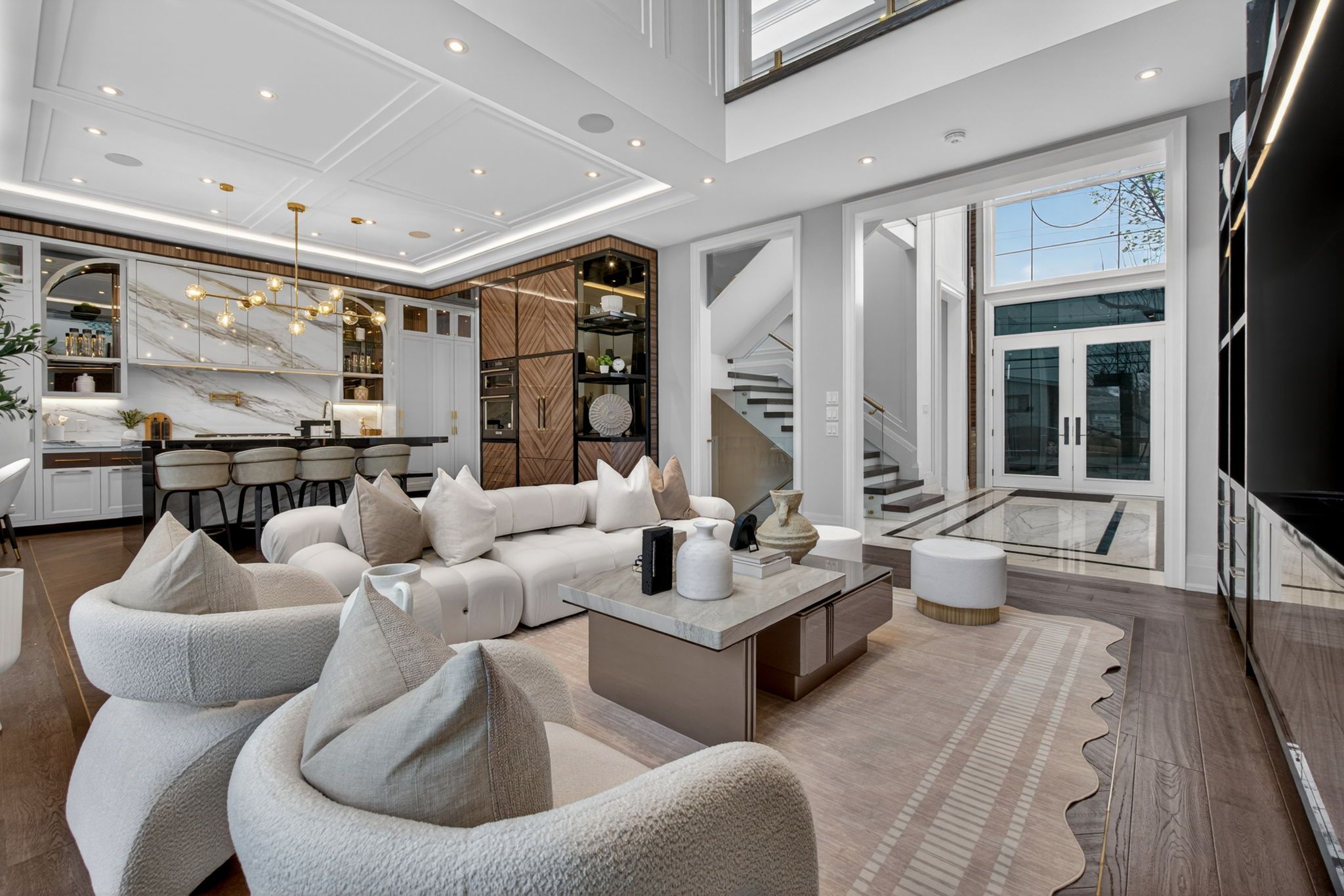 • Gourmet kitchen with built-in appliances and oversized island for gatherings.