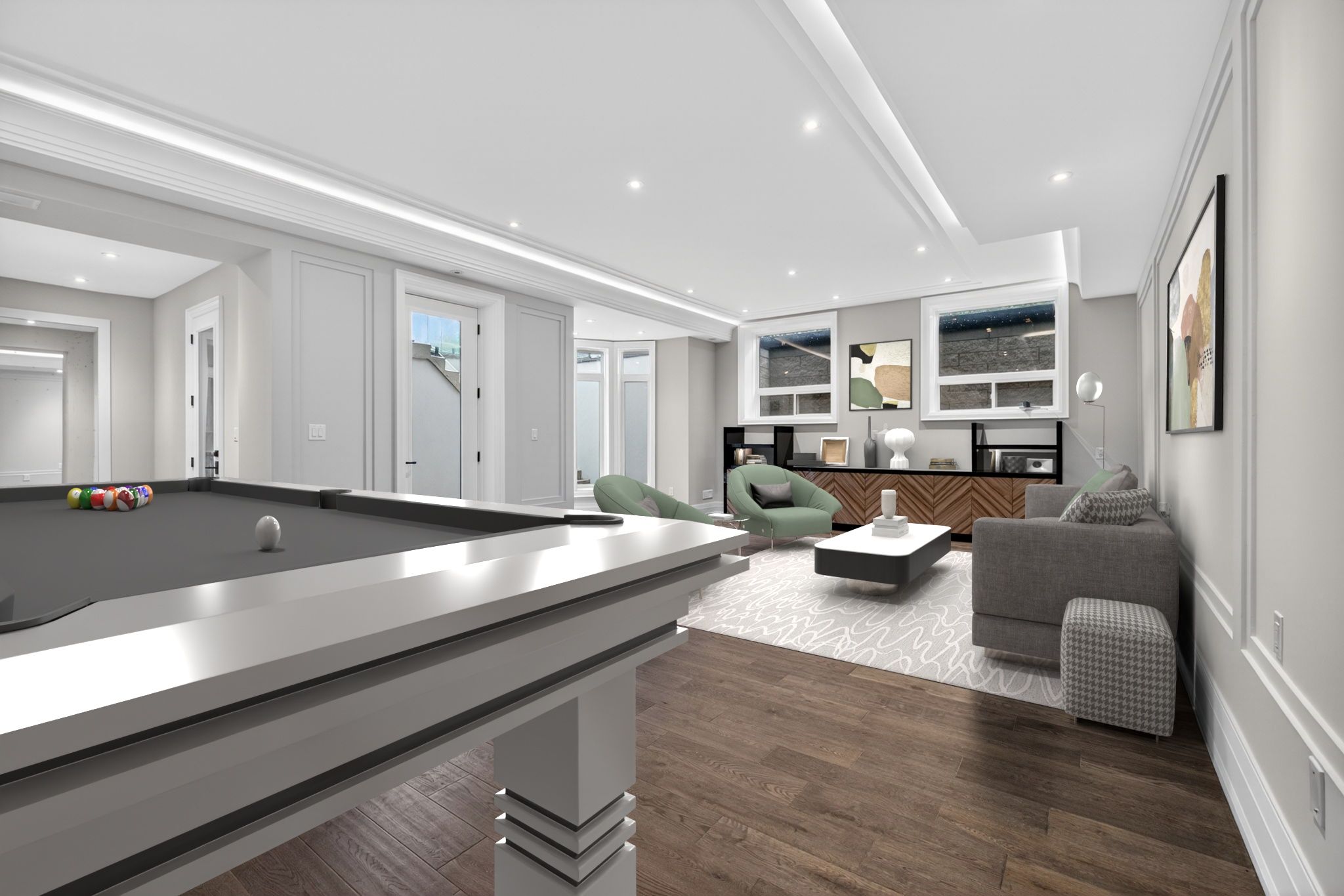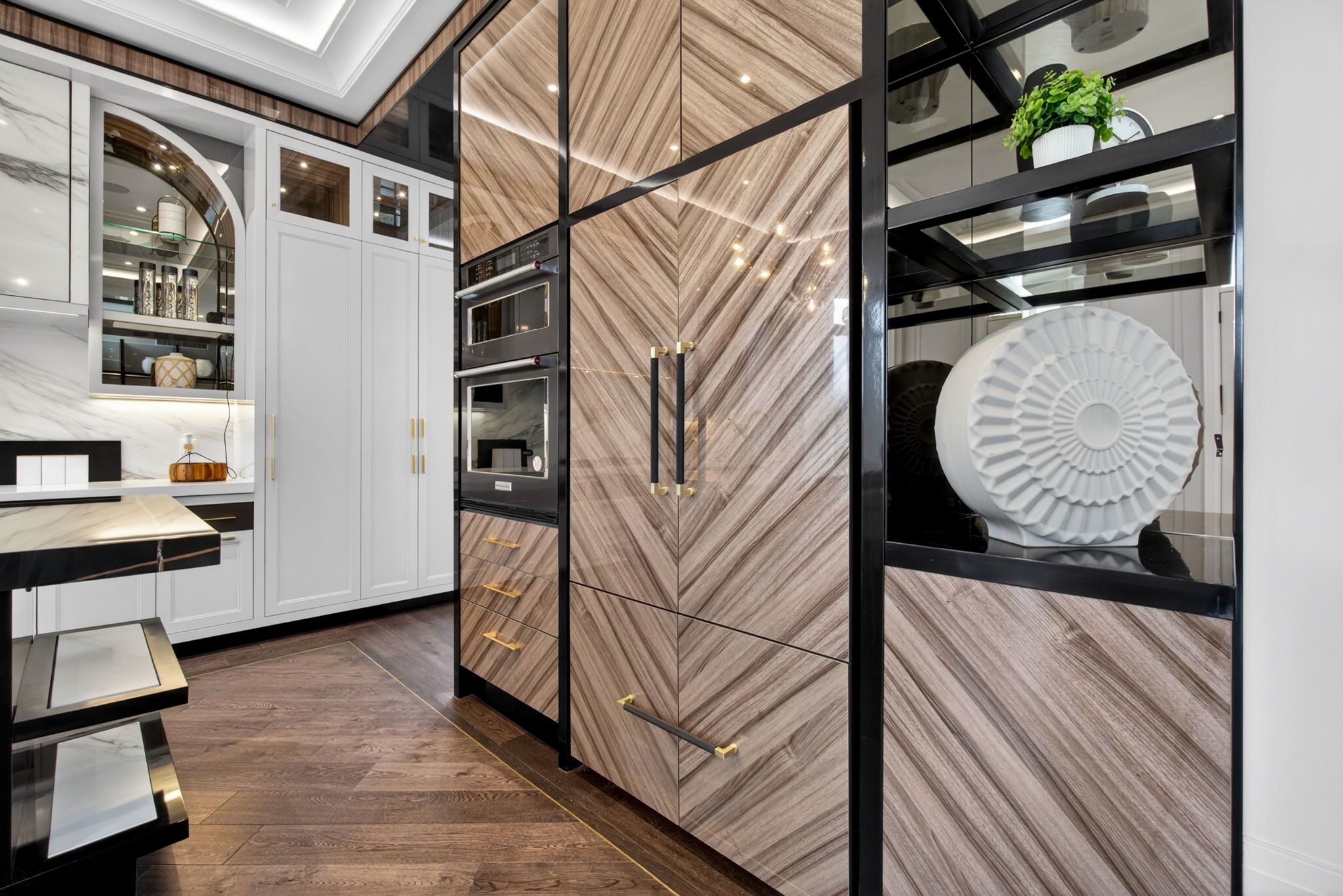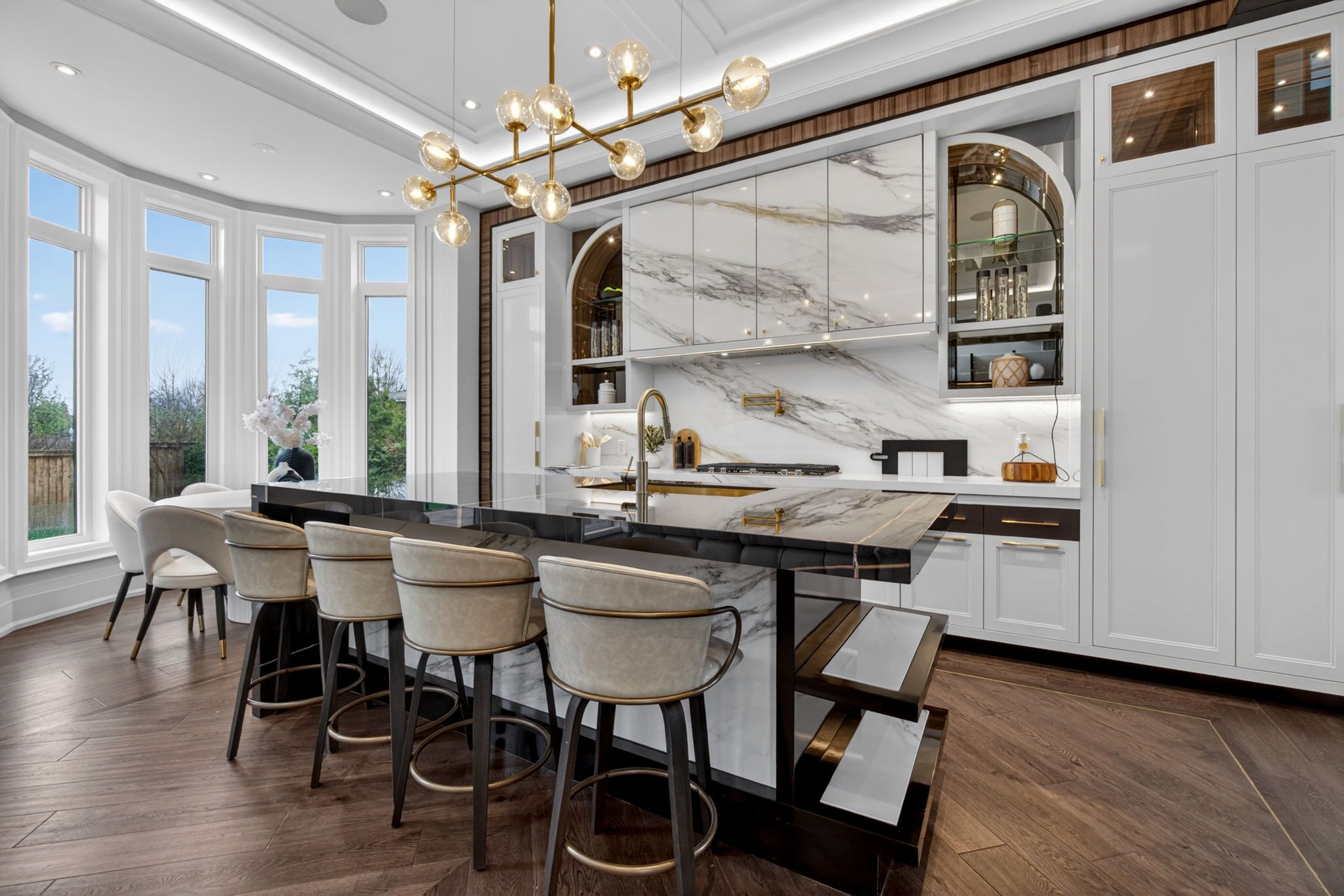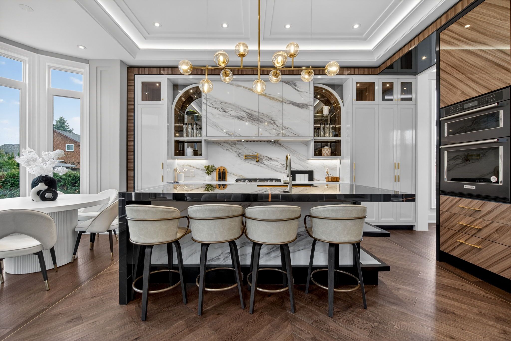 • Gourmet kitchen with built-in appliances and oversized island for gatherings.