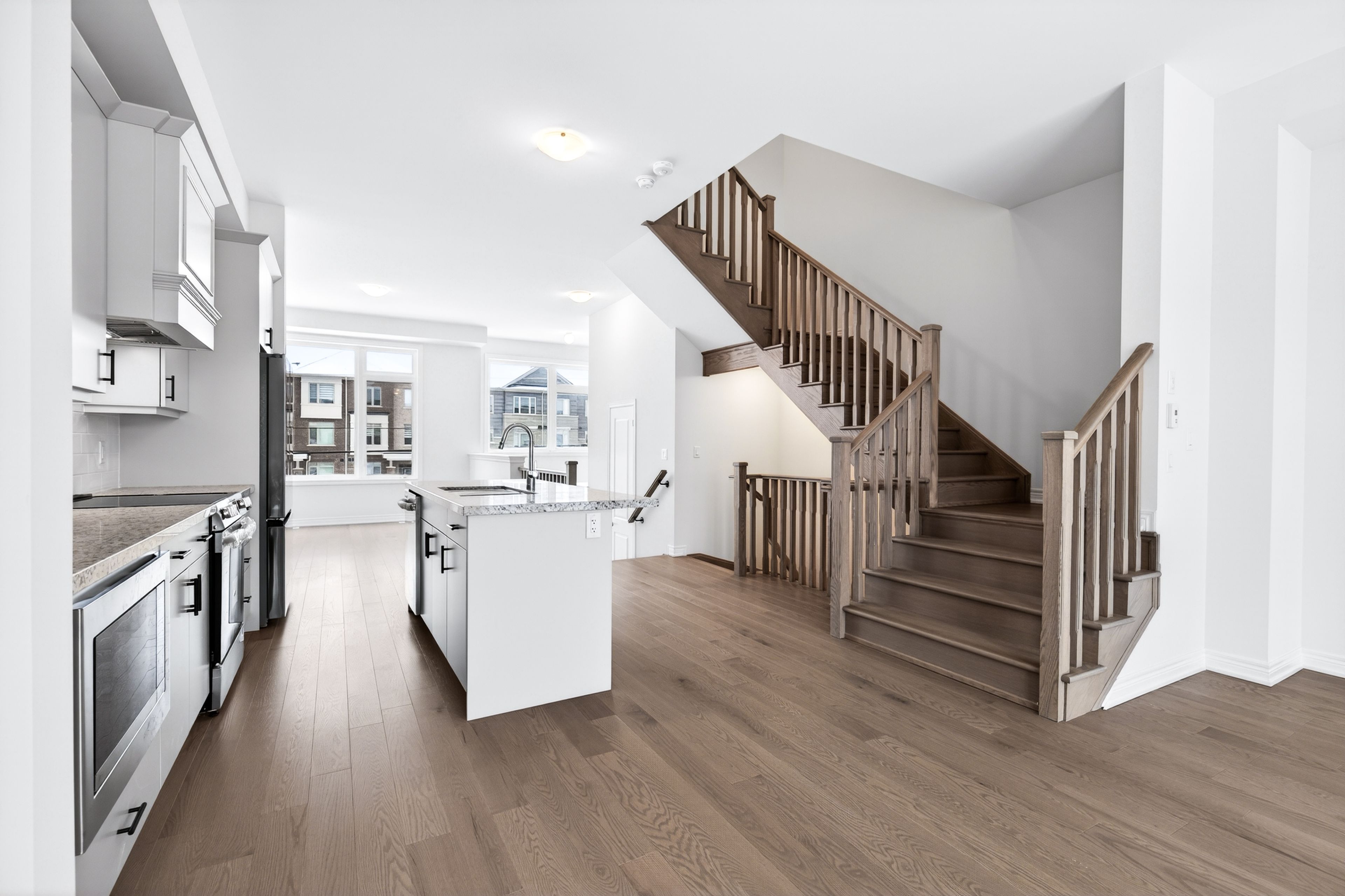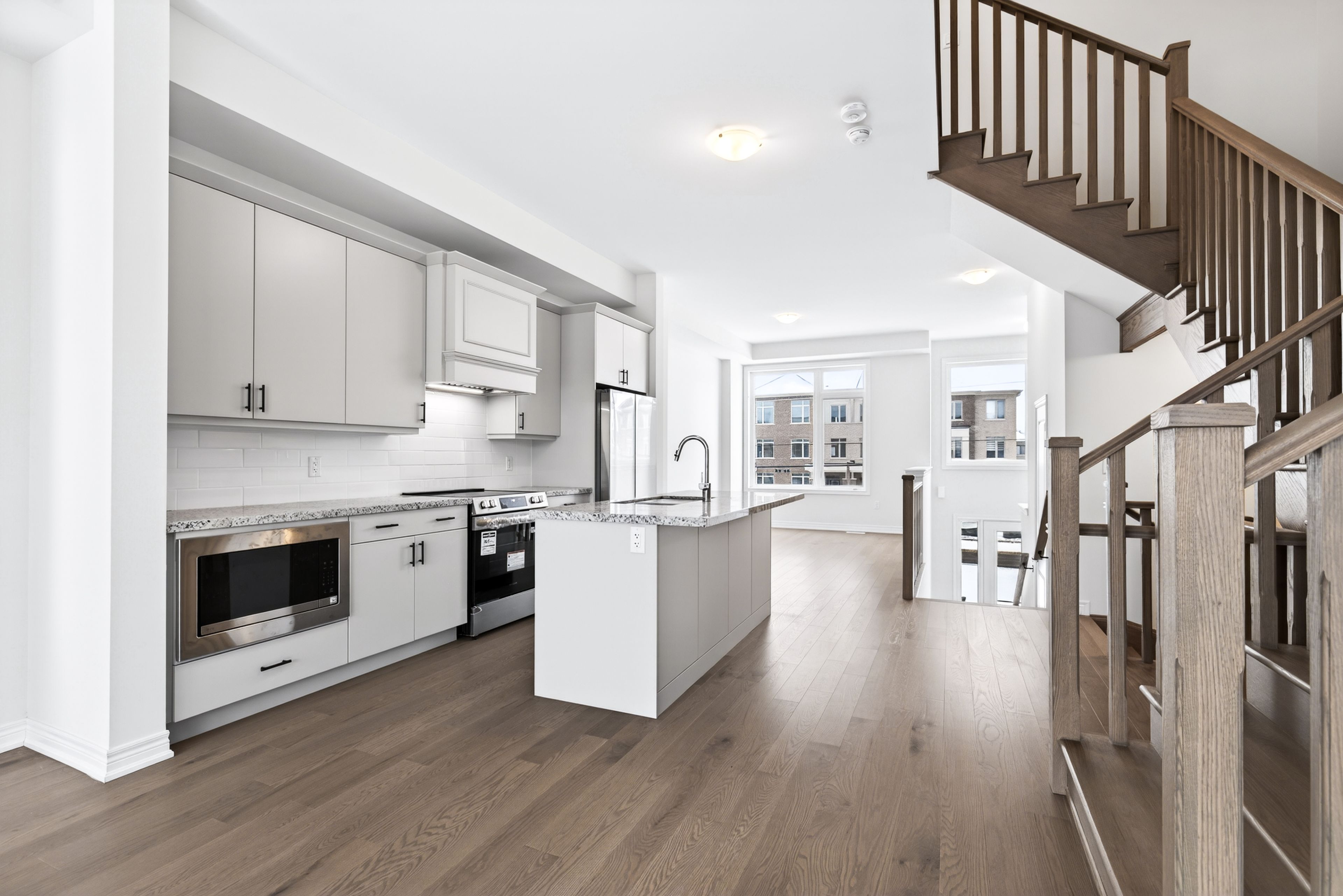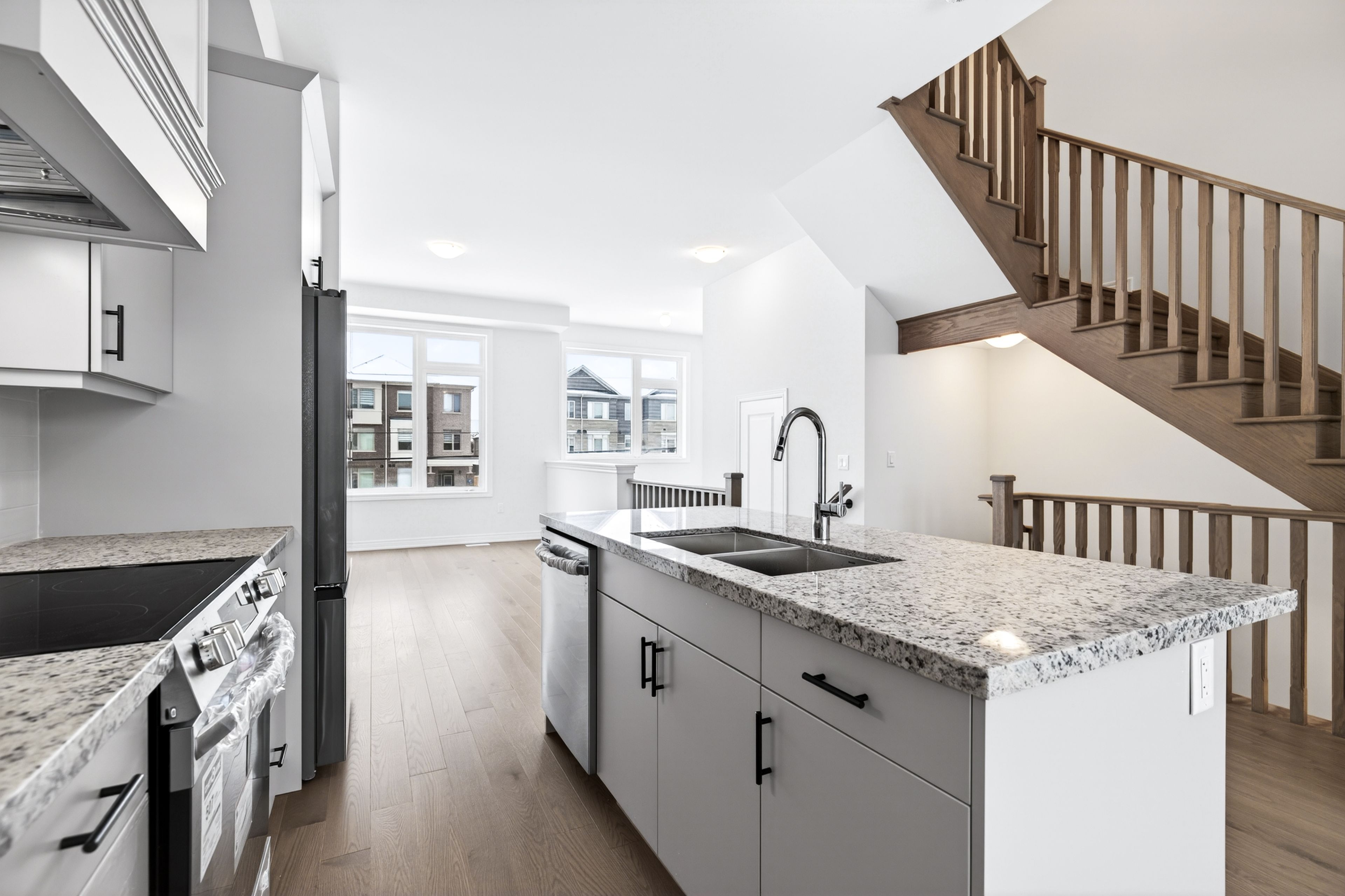 • Functional open-concept layout with a modern kitchen and large island.