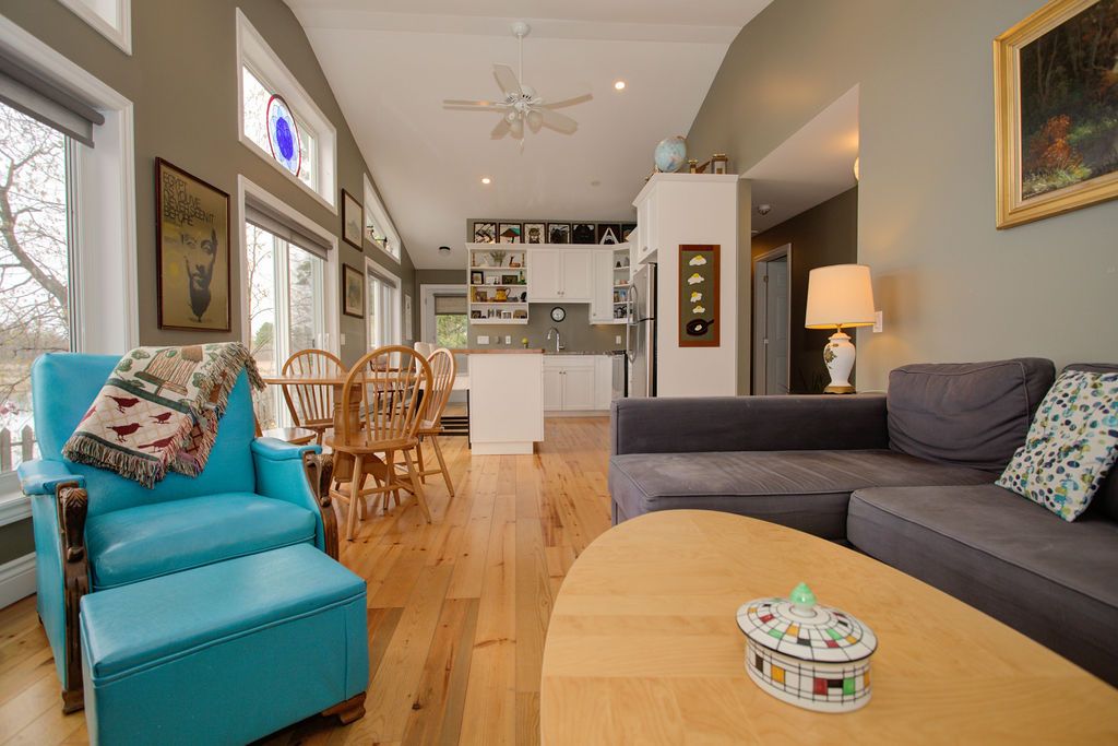 • Bright open-concept layout with a functional kitchen and living space.