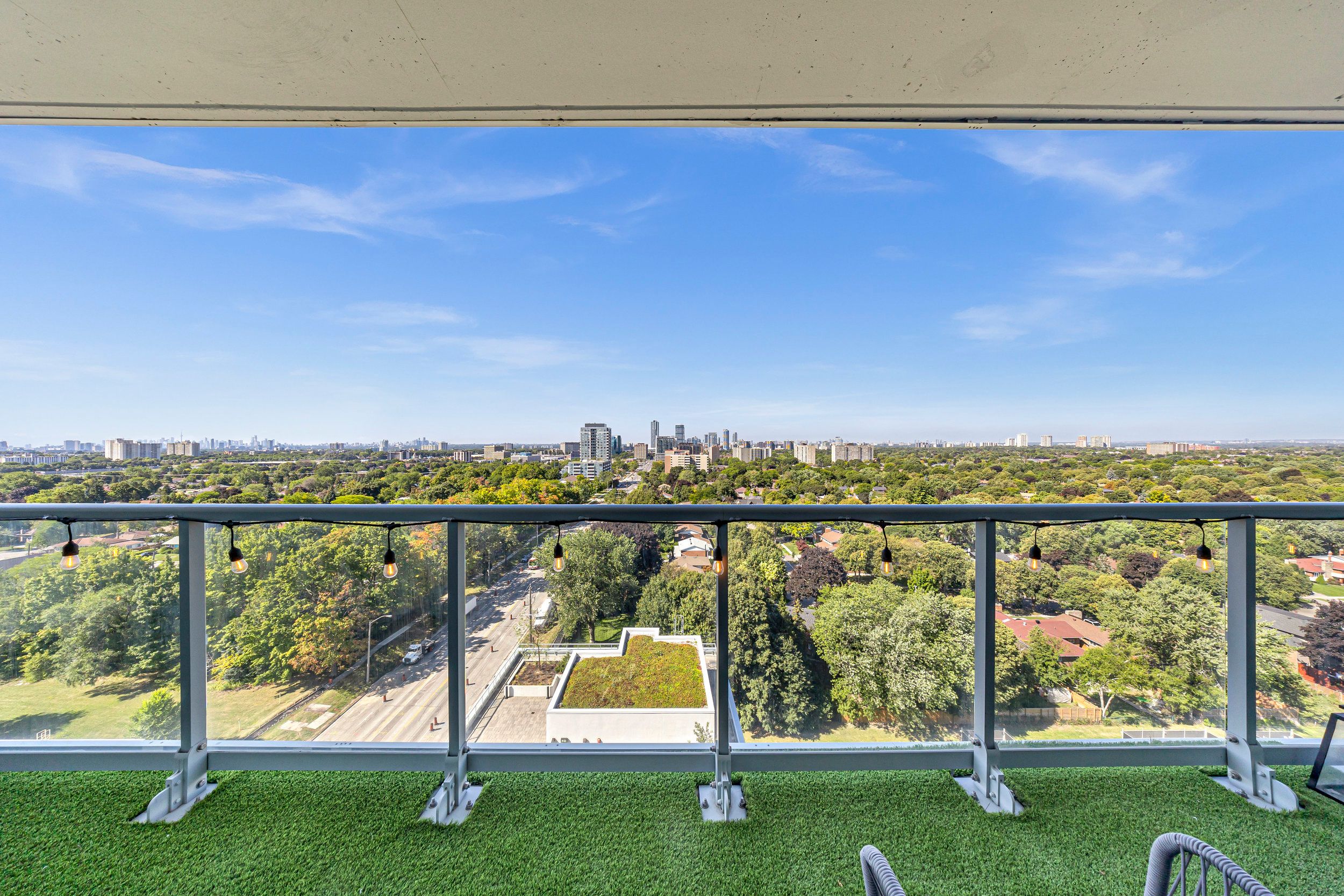 Total 944 sq. Welcome to this stunning 2-bedroom, 2-bathroom condo, ideally situated in the centre of toronto. This beautifully upgraded end unit features expansive floor-to-ceiling windows that bathe the space in natural light, while offering unobstructed views of the toronto skyline. The living room is enhanced by pot lights and remote motorized blinds, allowing you to adjust the ambiance. The open-concept living and dining area is ideal for both entertaining and relaxing. All ceiling upgraded light fixtures allows you to change the lighting to one of three colours. The full-size kitchen is designed for both function and style, with ample counter space and storage. Step outside onto your private balcony, which spans over 115 square feet and is laid with lush turf grass. The space is complemented by garden lights along the edges, creating a cozy, inviting outdoor oasis where you can enjoy breathtaking views of the city skyline and sunsets. The building offers exceptional convenience with a ttc bus stop right at your doorstep, less than 3 minutes to the 401, 404, and dvp. For added comfort, the building has a 24-hour concierge service. This unit has access to the buildings ev parking, making it ideal for modern living. 1 parking space and 2 lockers.
