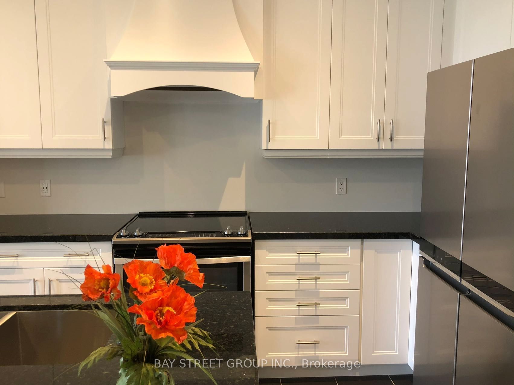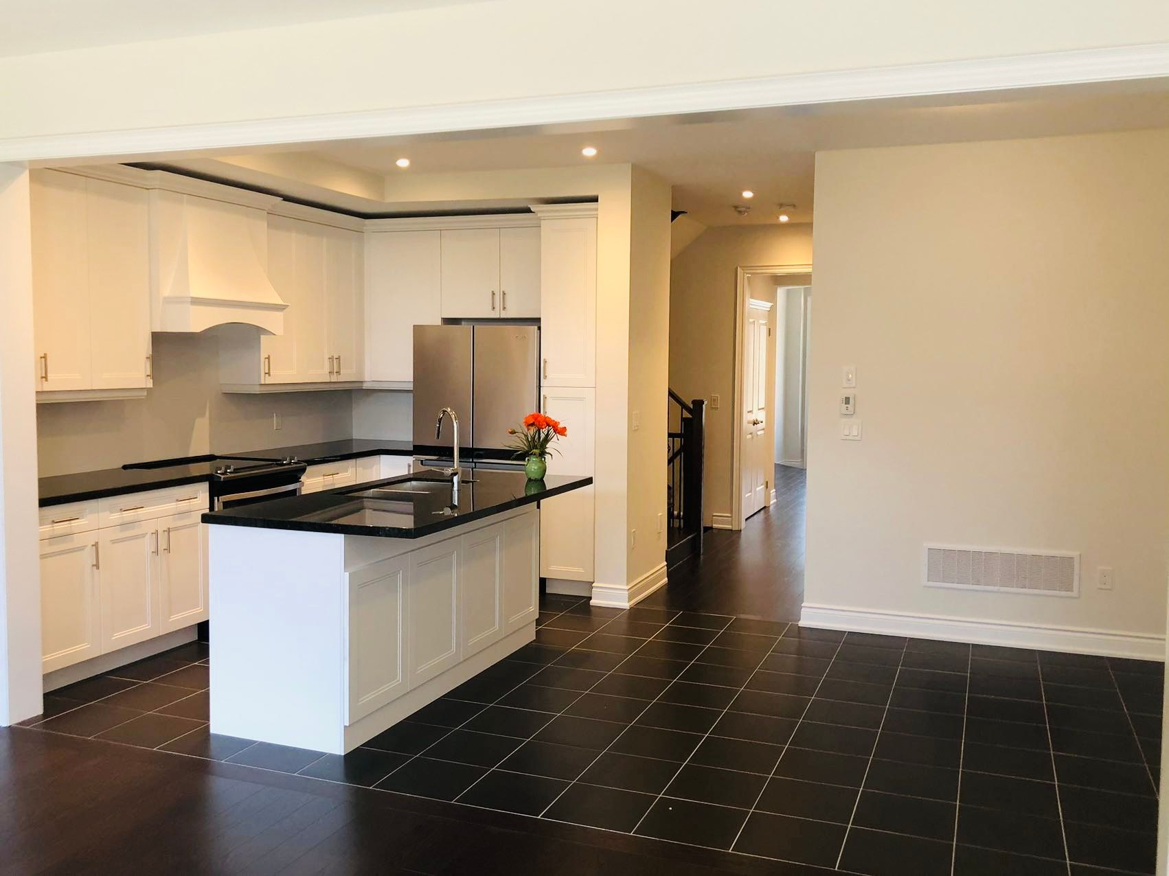• Modern kitchen features a center island and beautiful granite countertops.