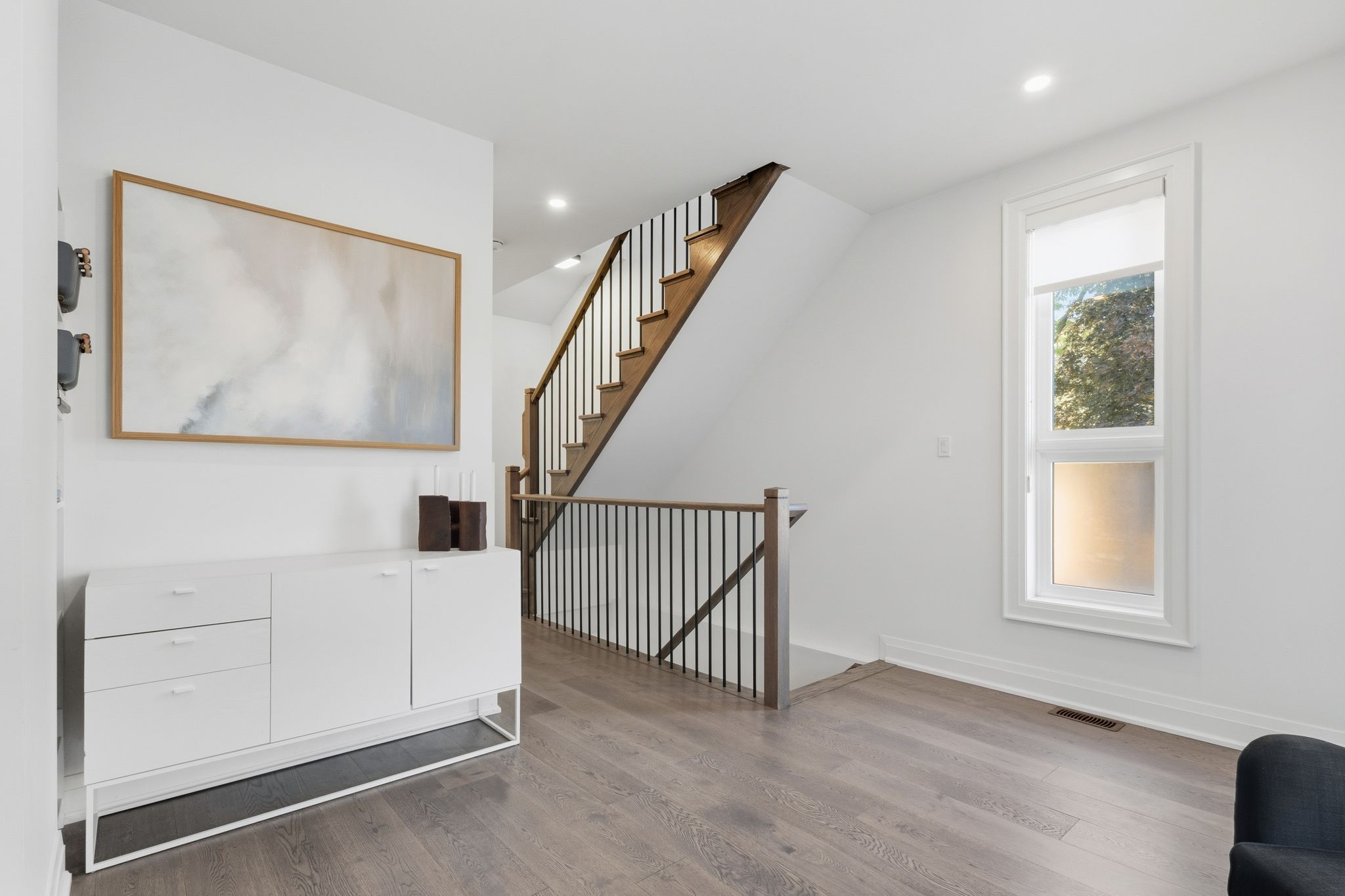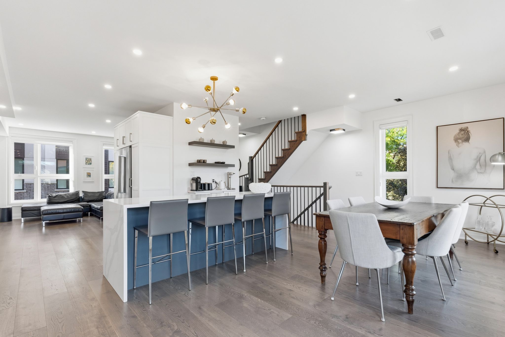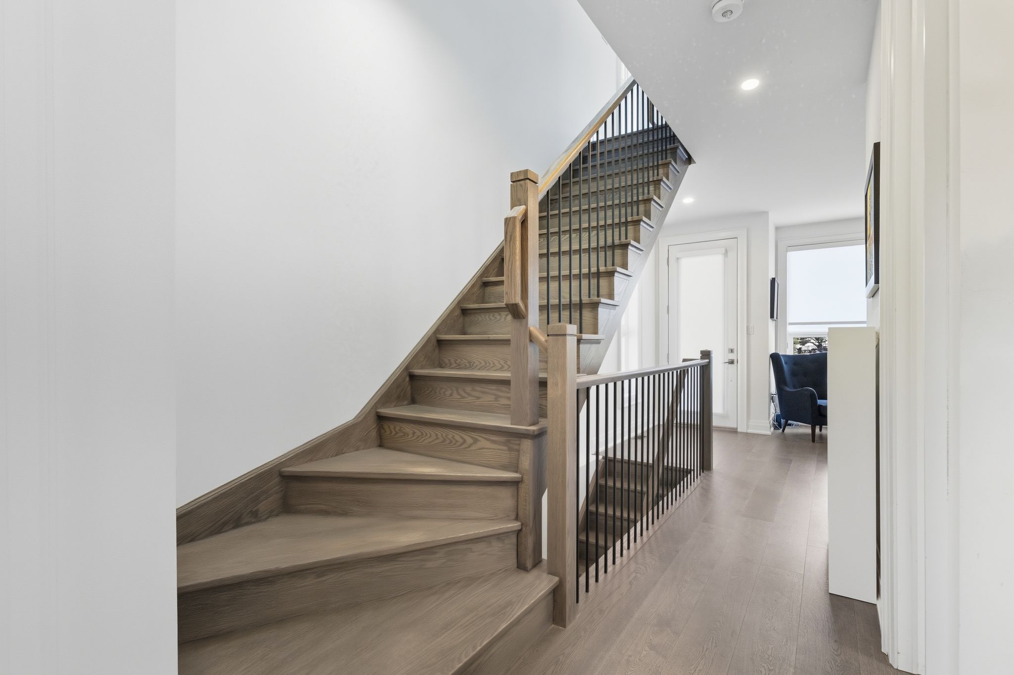 A one-of-a-kind freehold townhome in a sought-after community, exceptional in both design and scale, this beautiful three-bedroom home stands apart as the largest and widest floorplan in this exclusive ten-residence enclave. Every detail has been carefully chosen, creating a bright, refined living space filled with natural light from its extra-large windows. The exterior blends brick, stone, and stucco with a striking 8-foot modern entrance door. Inside, you'll find 9-foot ceilings on every level, 8-foot solid interior wood doors, upgraded trim, and hardwood floors throughout no carpet anywhere. The custom kitchen is the heart of the home, featuring soft-close cabinetry, quartz countertops and backsplash, a waterfall island with undermount sink, kitchenaid appliances including a gas stove, and a built-in beverage fridge. The open-concept living area flows seamlessly and features a gas fireplace and juliette balcony, creating a space that feels both stylish and inviting. The oak staircase with metal pickets and hunter douglas blinds continue the homes attention to detail. Upstairs, the primary suite offers a spa-like retreat with heated floors, a frameless glass shower, and double comfort-height vanities. Additional thoughtful upgrades such as custom closet organizers, led pot lights, and a full-sized washer and dryer finishes the space beautifully. The appeal extends outdoors with a rare 375-square-foot rooftop terrace finished in cedar and complete with a gas line for barbecuing perfect for relaxing or entertaining under the open sky. Additional conveniences include inside garage entry, a large window in the garage, a covered second parking space, and an owned hot water tank. Located close to downtown burlington, shopping, schools, parks, the burlington centennial bike path, public transportation, major highways and the go train. This is a home worth seeing... You will truly be impressed.