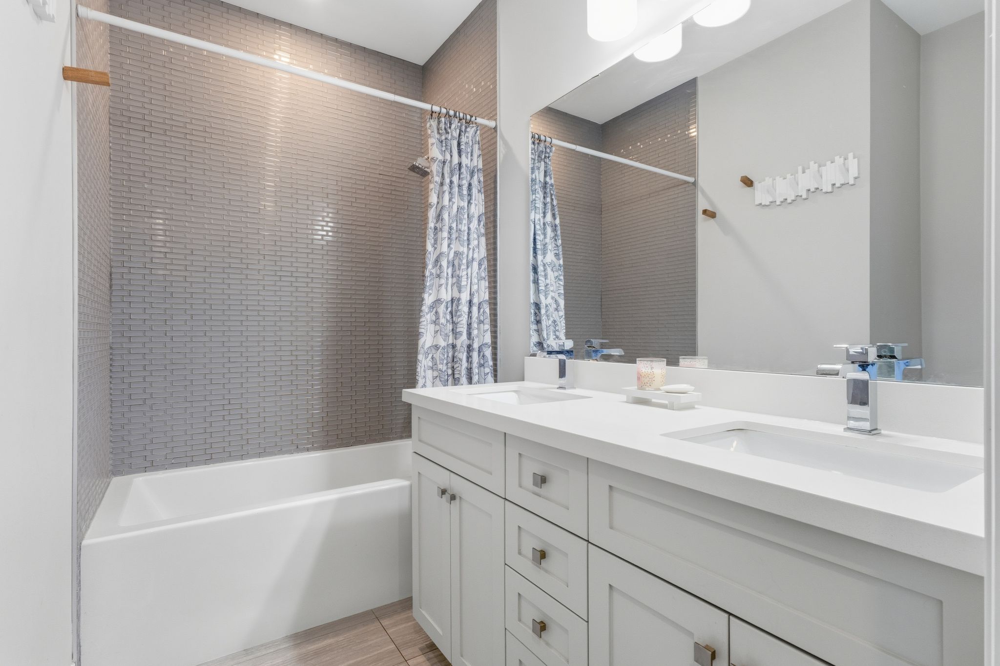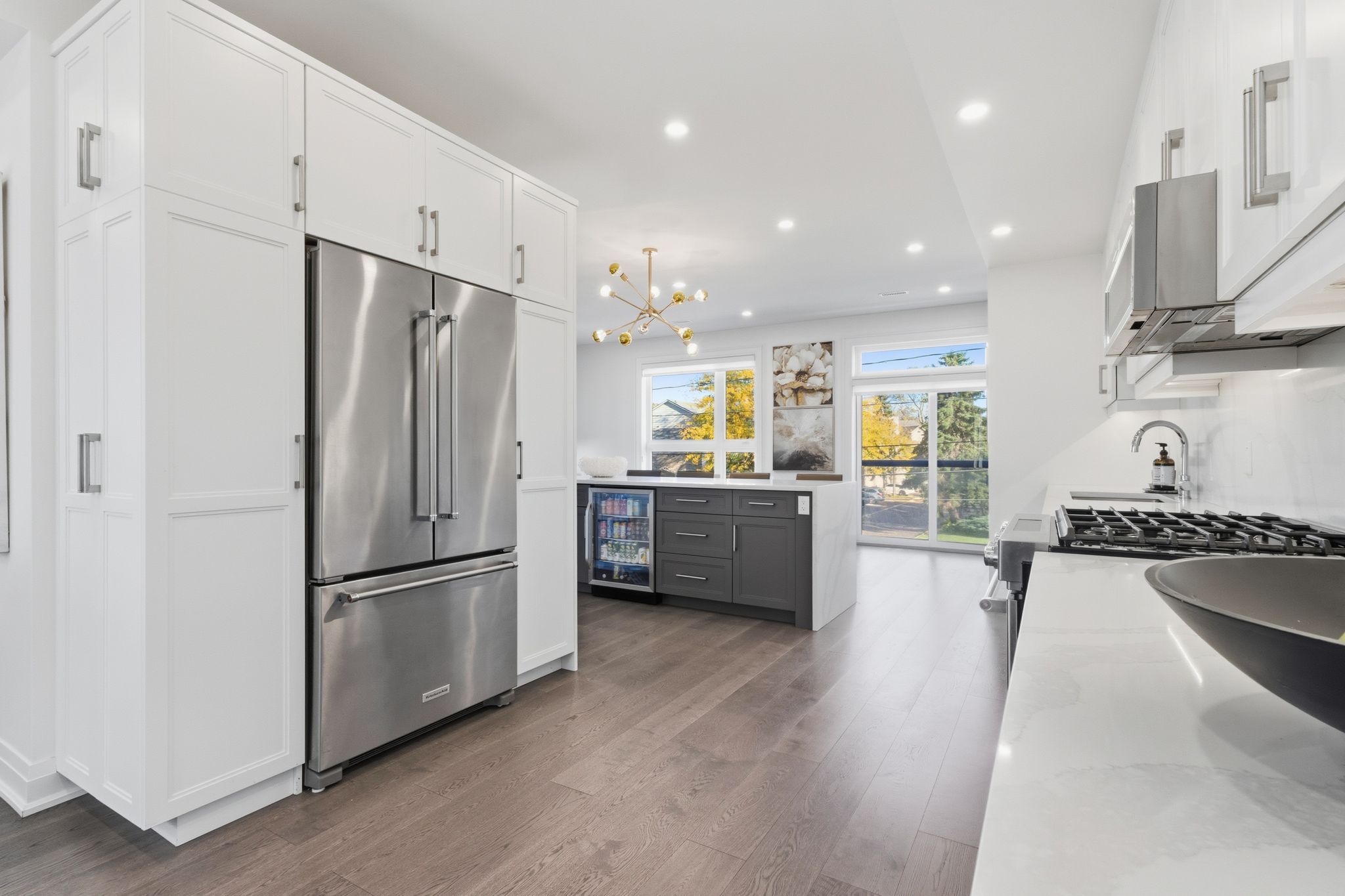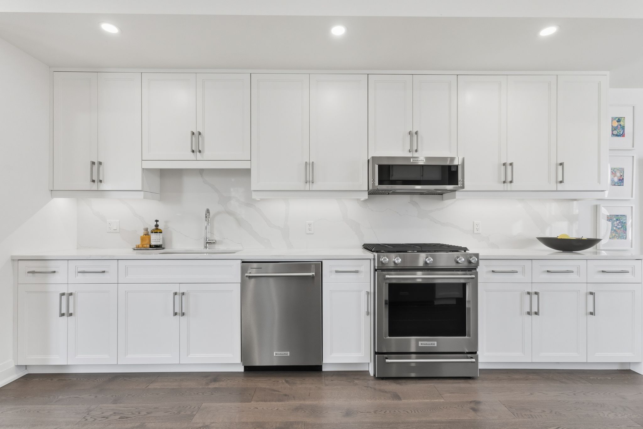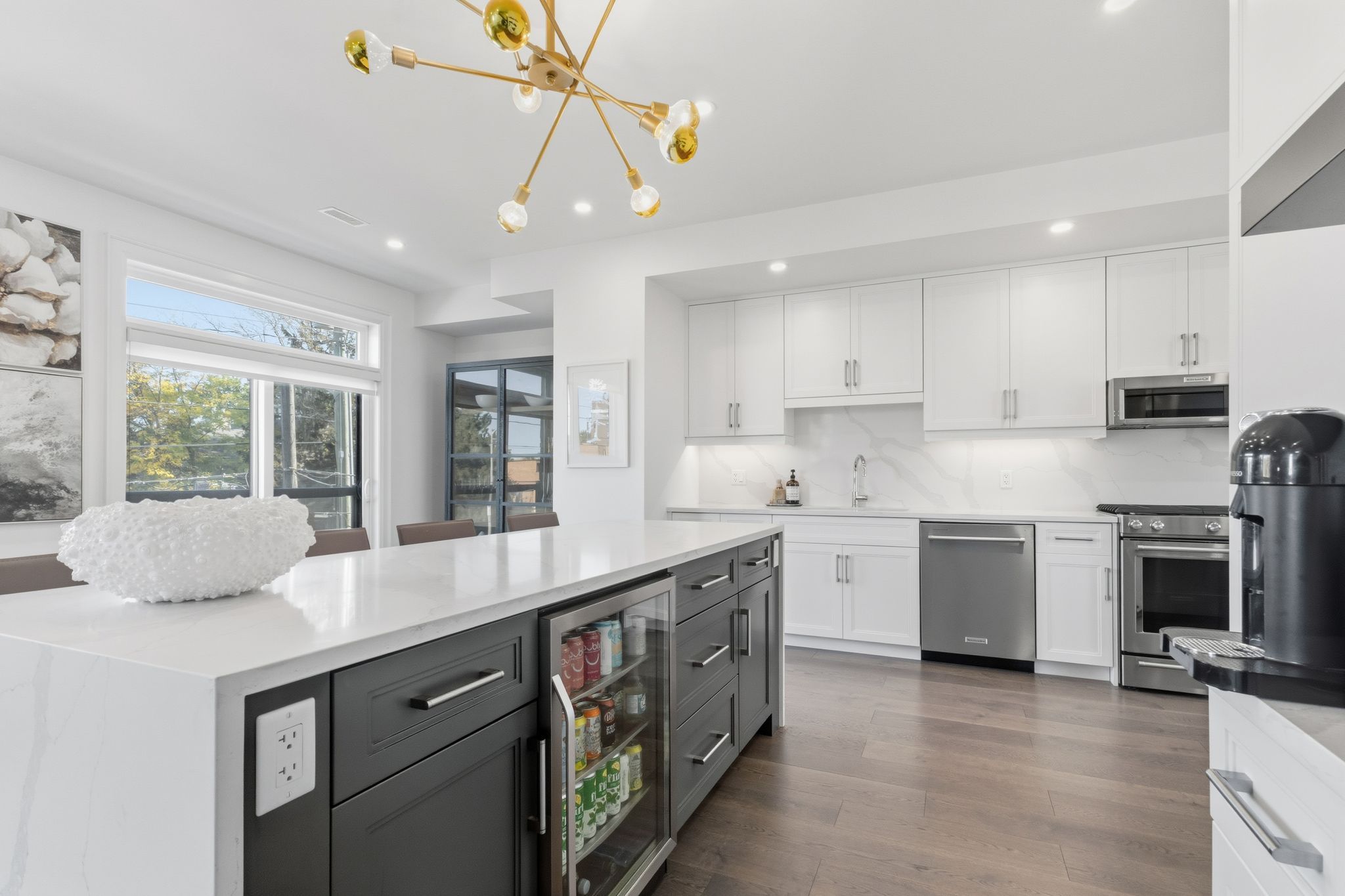• Custom kitchen with quartz countertops and KitchenAid appliances.