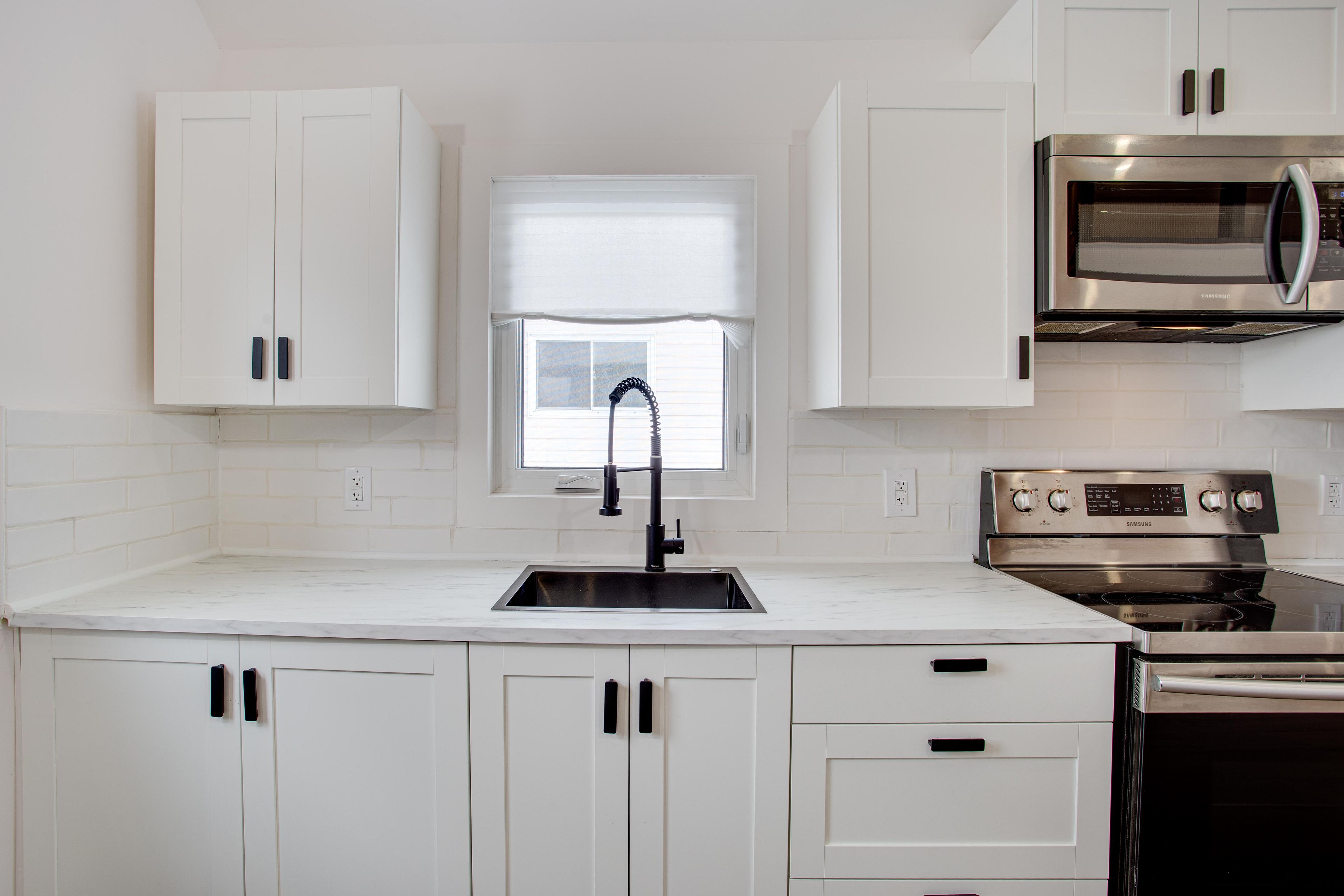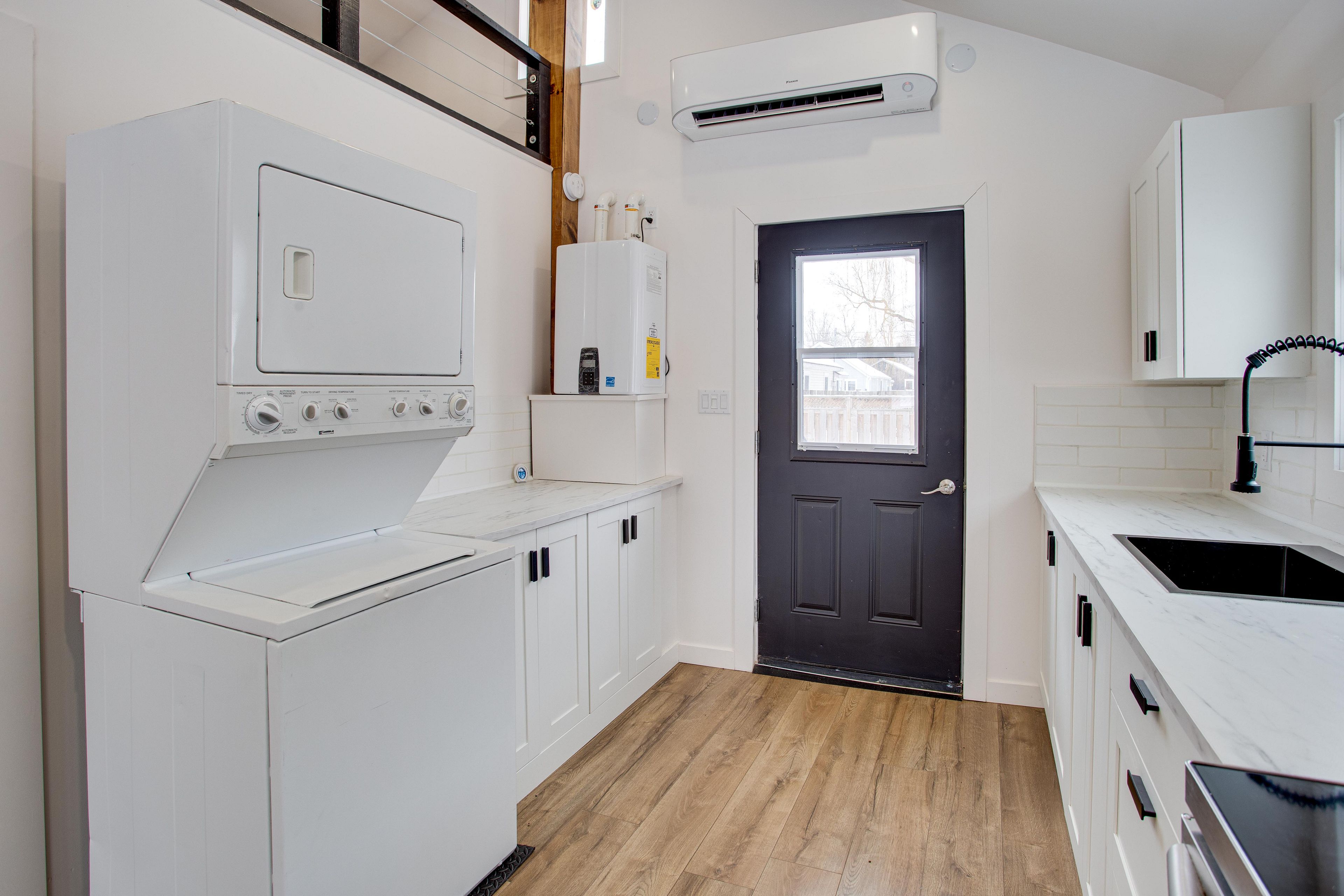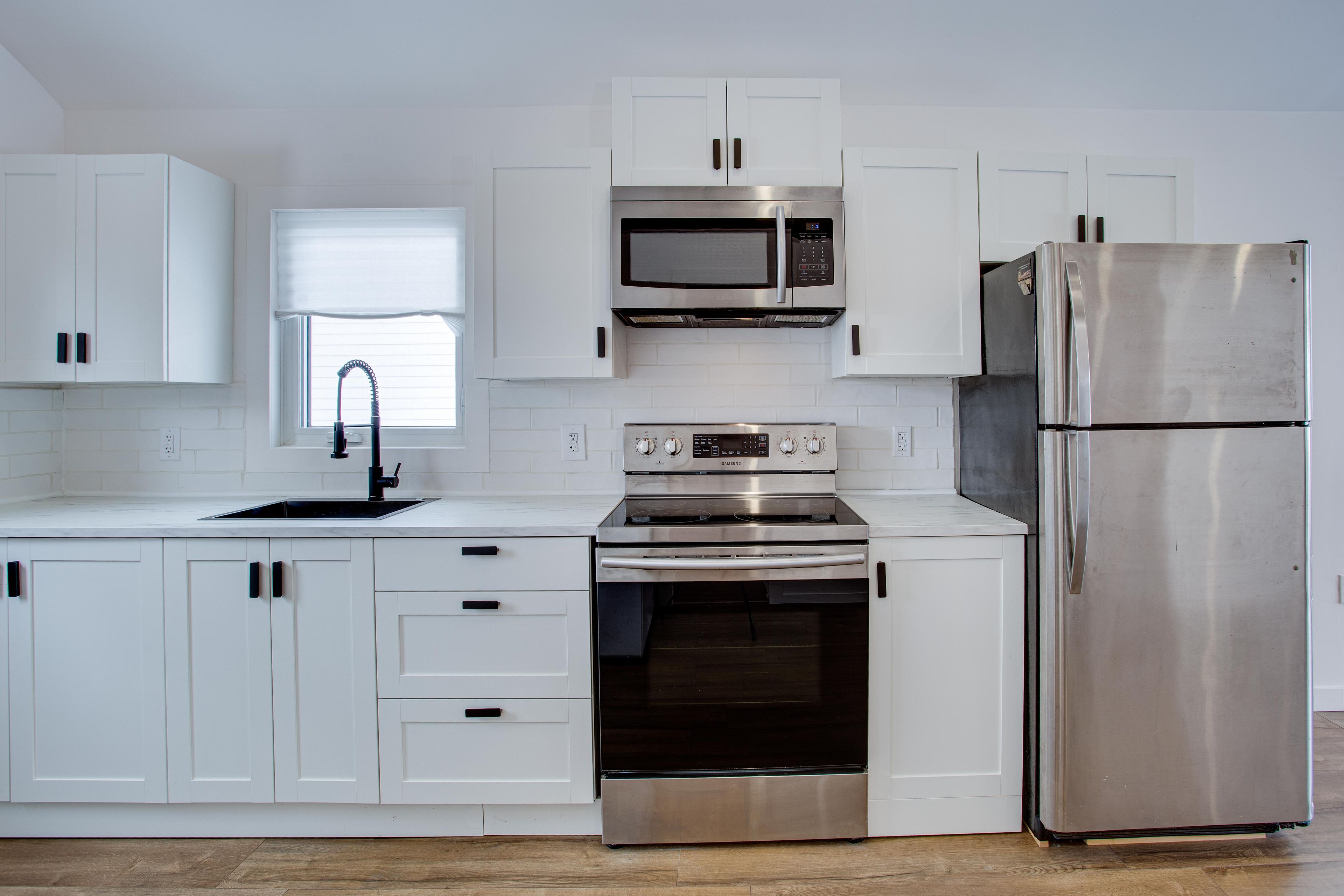 • Modern kitchen with stainless steel appliances, great for cooking and entertaining.