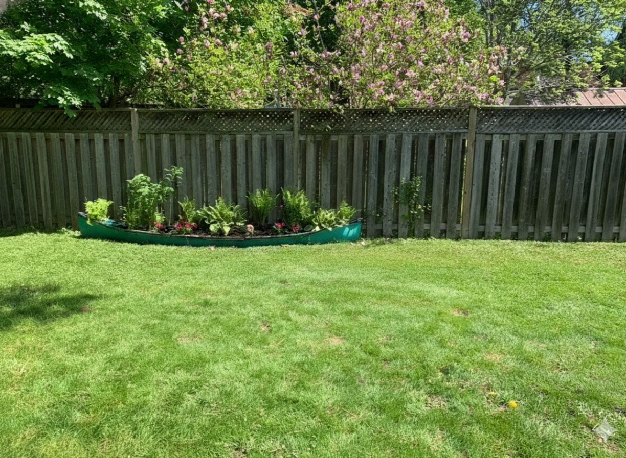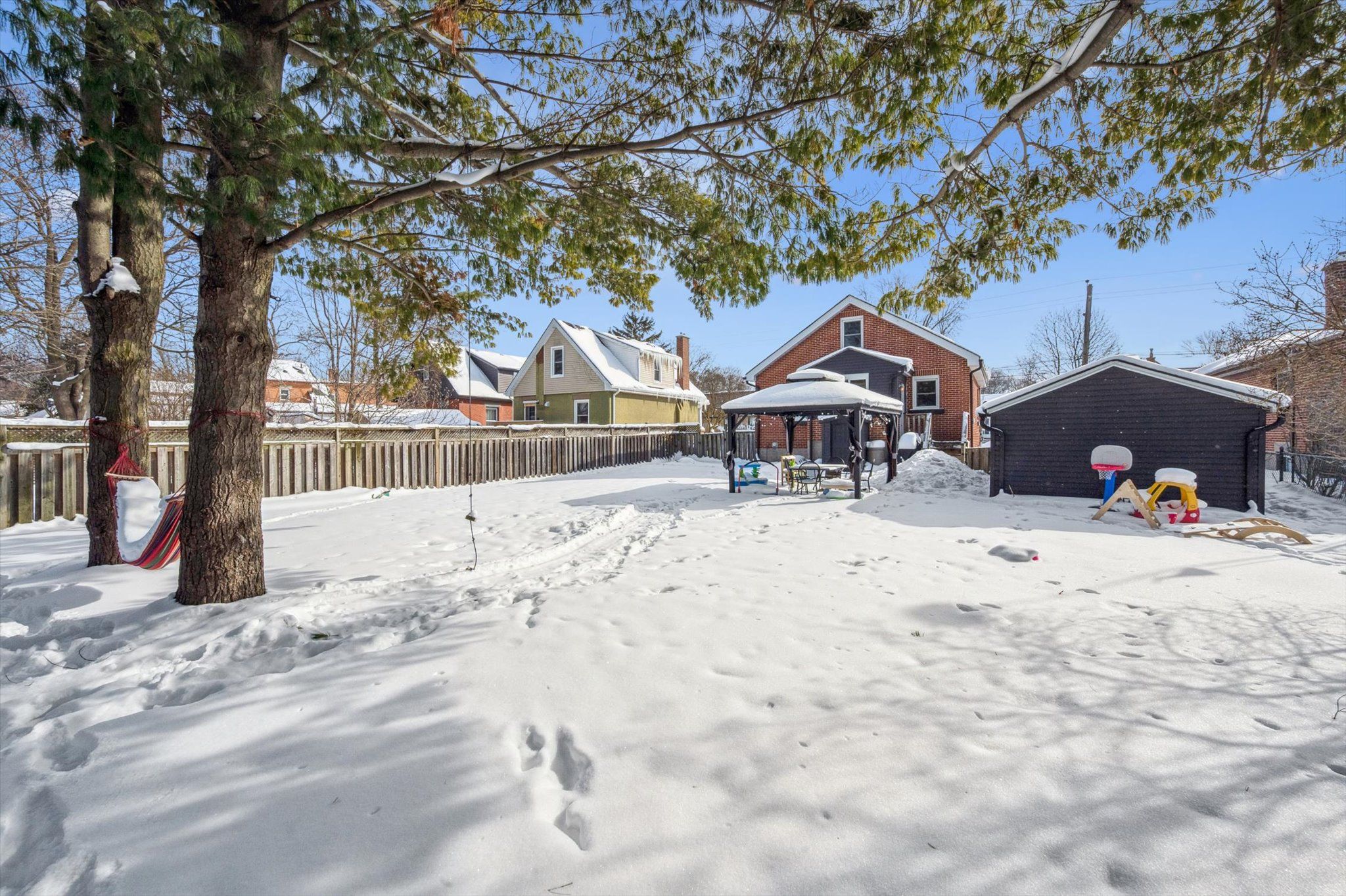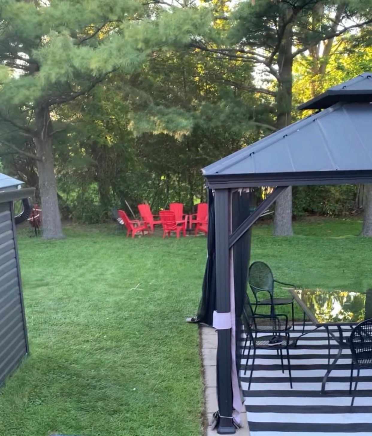 • Private backyard with mature trees, firepit, and plenty of parking.