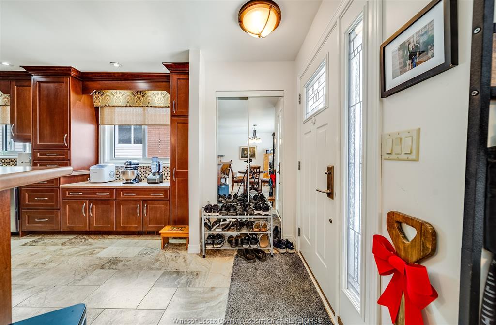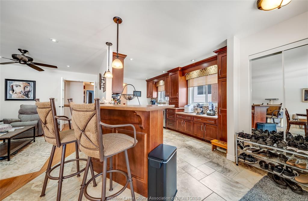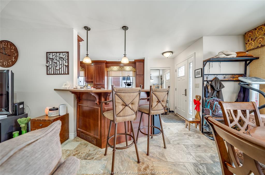 • Bright living area featuring timeless cherry cabinetry and an eating island.