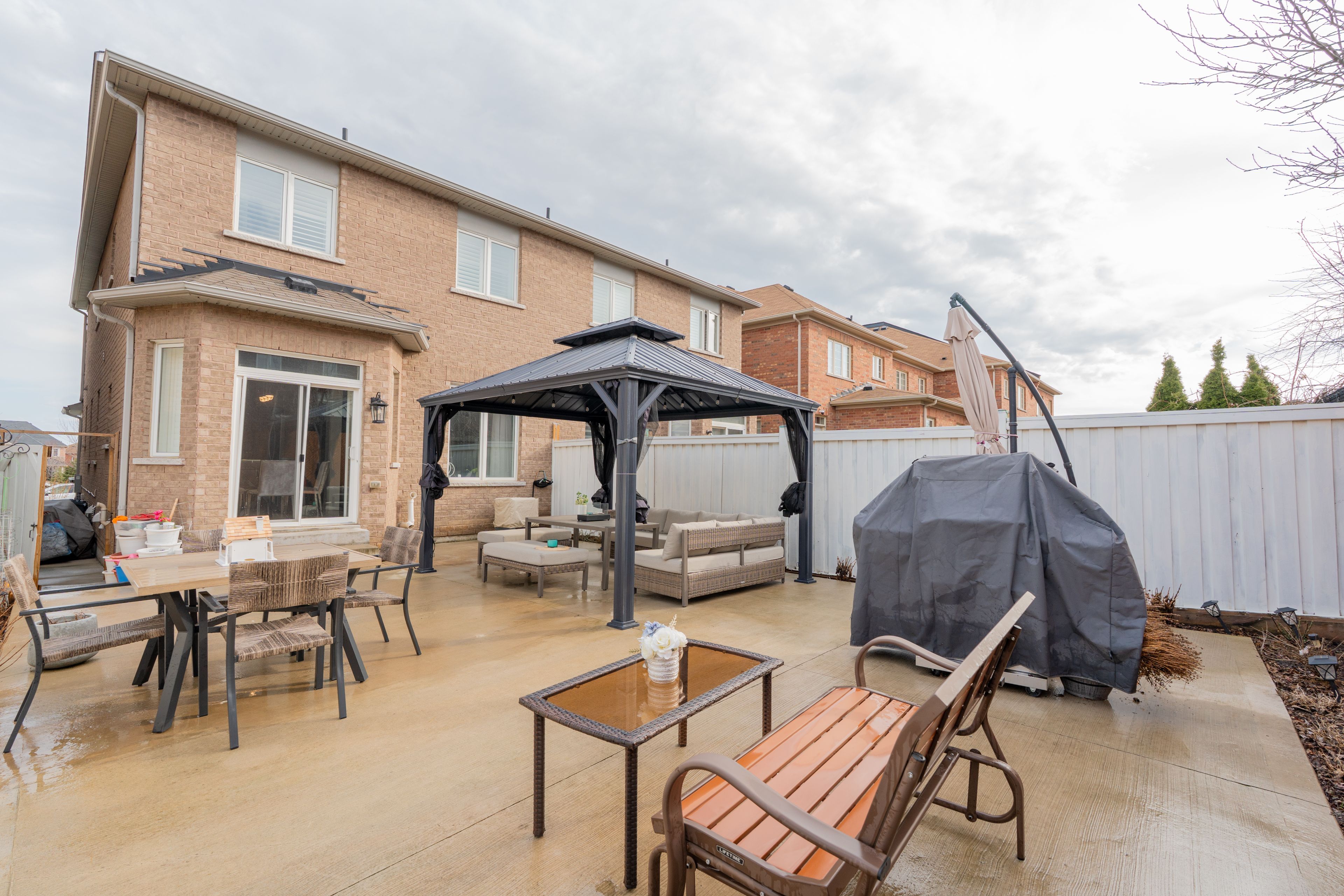 • Low-maintenance concrete backyard with a gazebo for gatherings.