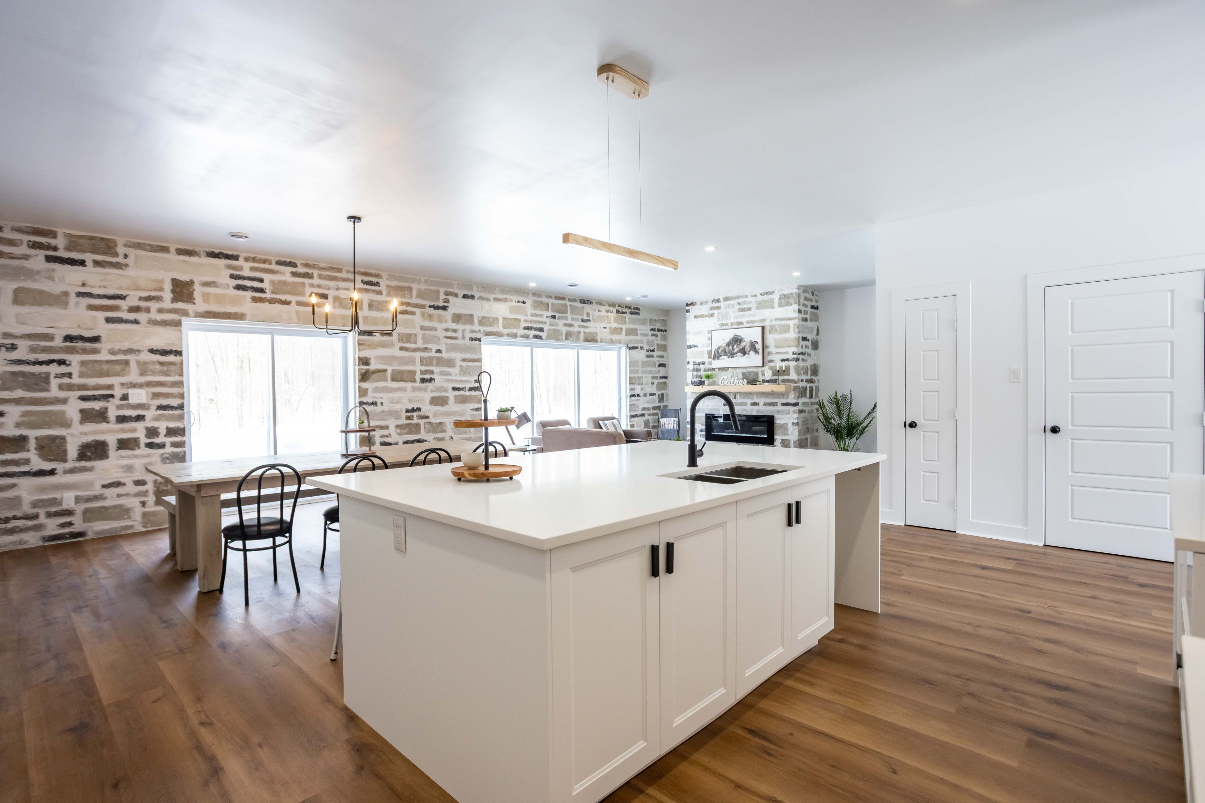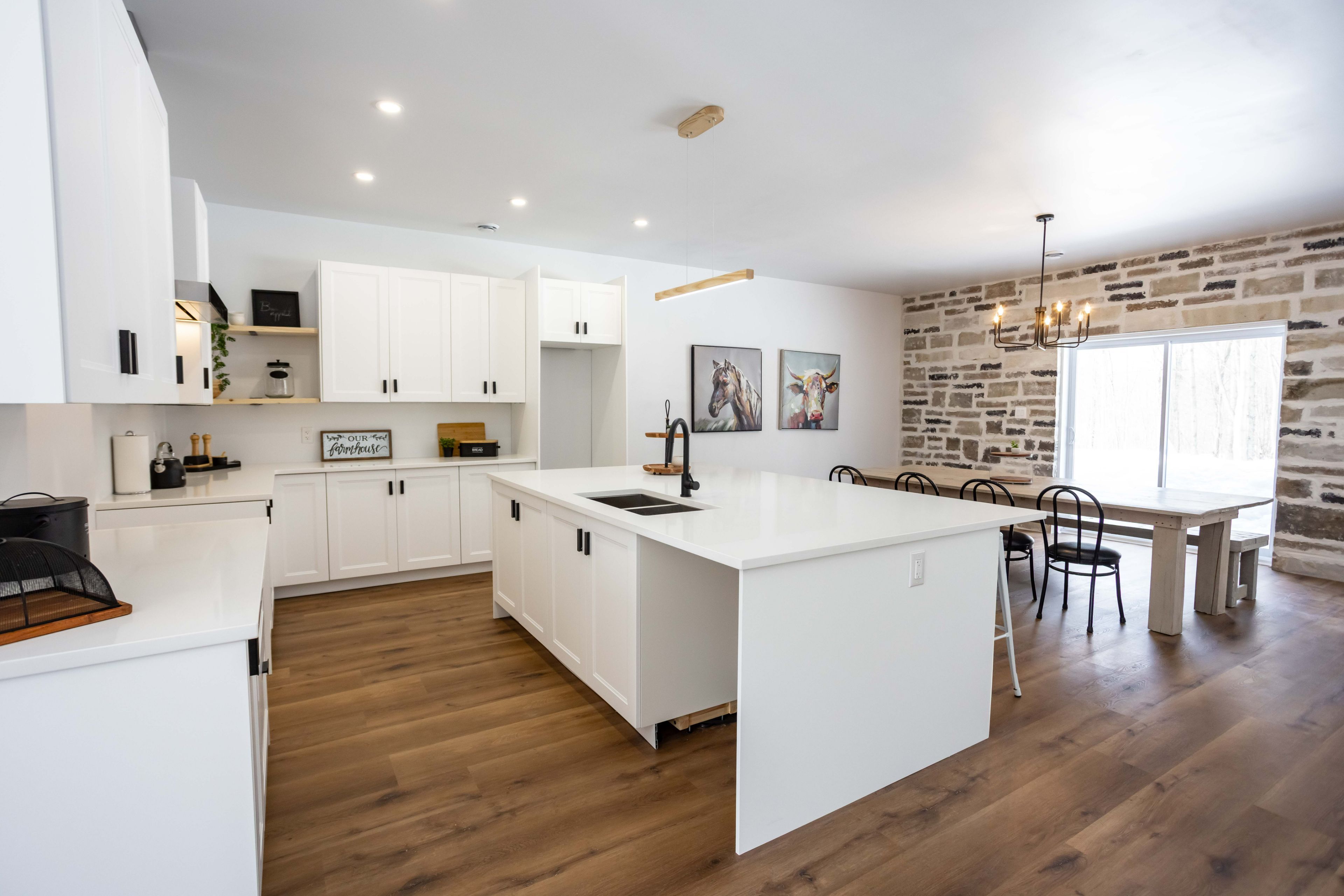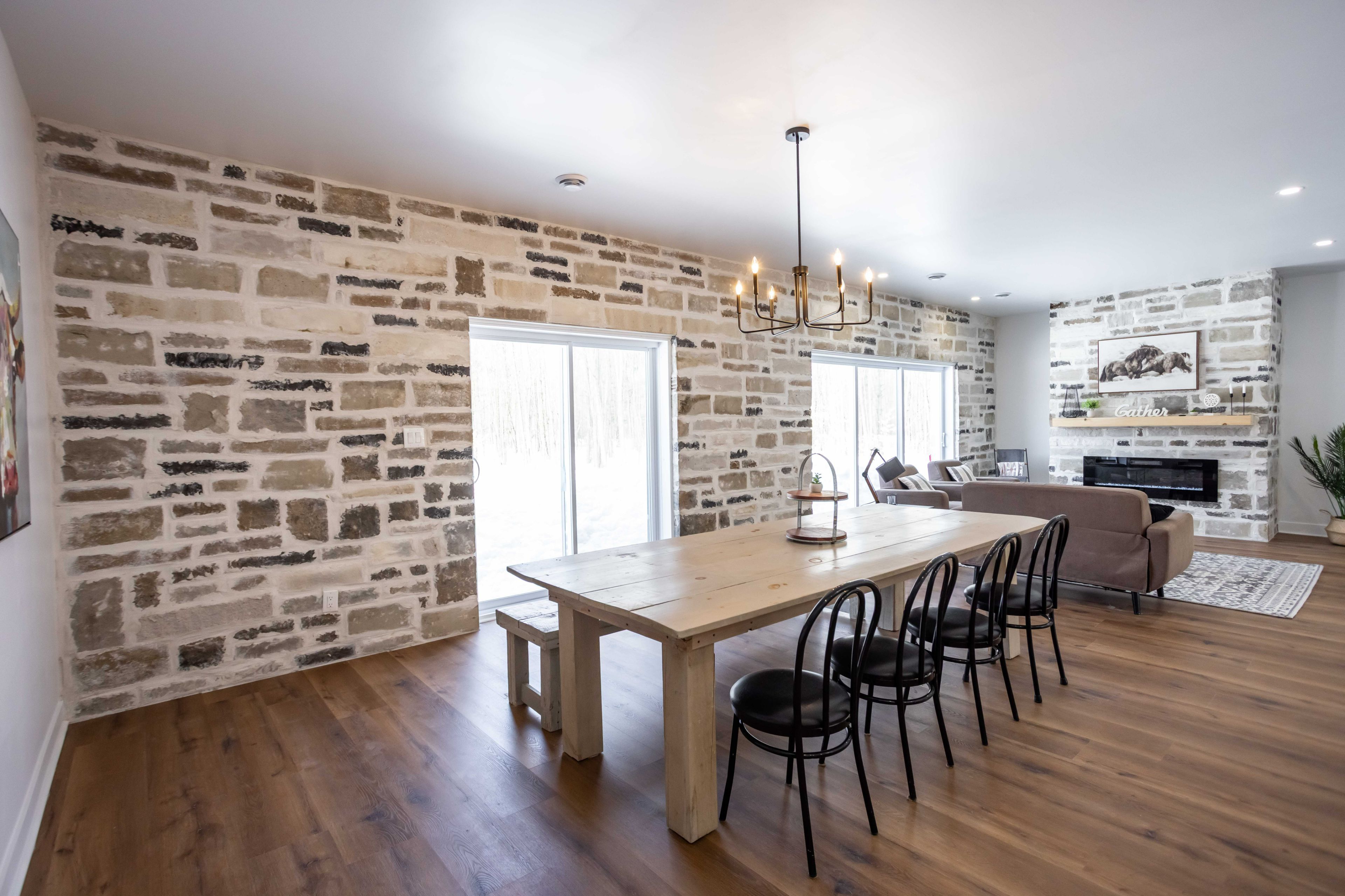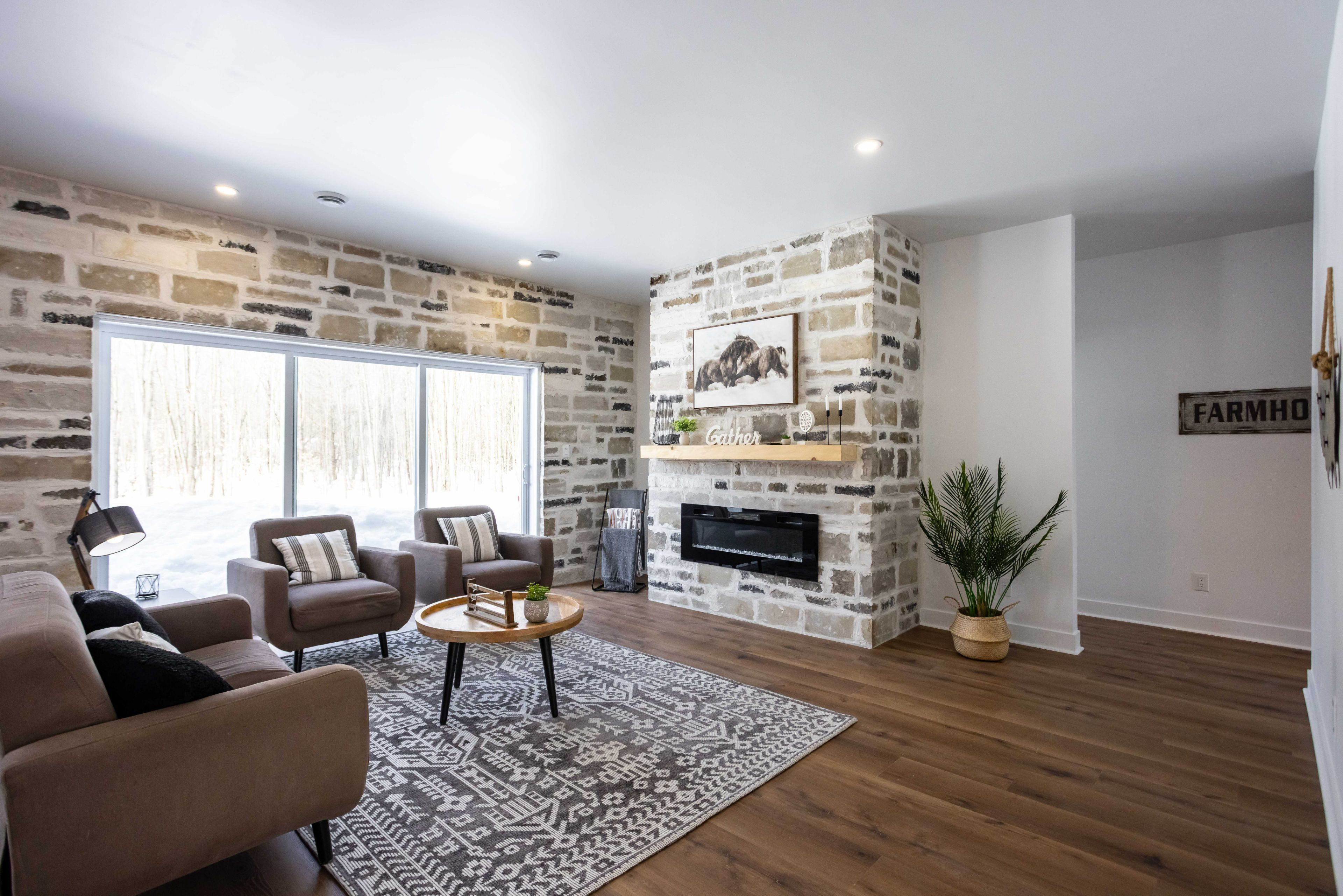 Welcome to this stunning brand new custom-built stone bungalow set on 3. 2 private acres, offering a rare blend of luxury, craftsmanship & peaceful country living surrounded by nature. Tucked among mature trees with a natural creek running along the back of the property, this home offers exceptional privacy & a tranquil setting that feels like your own private retreat. Inside, the home showcases striking architecture with 10 ft ceilings, expansive windows, & extensive use of natural stonework that adds warmth and timeless character throughout. High-end luxury vinyl flooring with a durable anti-scratch finish flows seamlessly across the entire home. The open-concept living & dining space is designed to capture the beauty of the surrounding landscape. A stunning stone feature wall with fireplace anchors the room and serves as the focal point, while large sliding doors invite natural light inside & create a seamless connection between indoor living and the peaceful outdoor setting. The kitchen features premium cabinetry, quartz countertops, & a clean modern design that blends functionality with refined style while remaining perfectly connected to the main living space for entertaining. The home offers 3 spacious bedrooms and 2 beautifully finished bathrooms, including a serene primary suite with a walk-in closet and spa-inspired ensuite featuring a double vanity and glass shower. The primary bedroom also offers direct access to the backyard, allowing you to step outside and enjoy the quiet natural surroundings. Comfort and efficiency are enhanced by a high-end heating system valued at approximately $45,000, featuring heated floors throughout the home combined with a thermal heat pump and furnace system. Additional features include an hrv air exchange system and tankless hot water heater. The impressive heated garage offers approximately 1,400 sq ft of space and features a heated garage floor, providing excellent flexibility for vehicles, storage, hobbies, or workshop use.