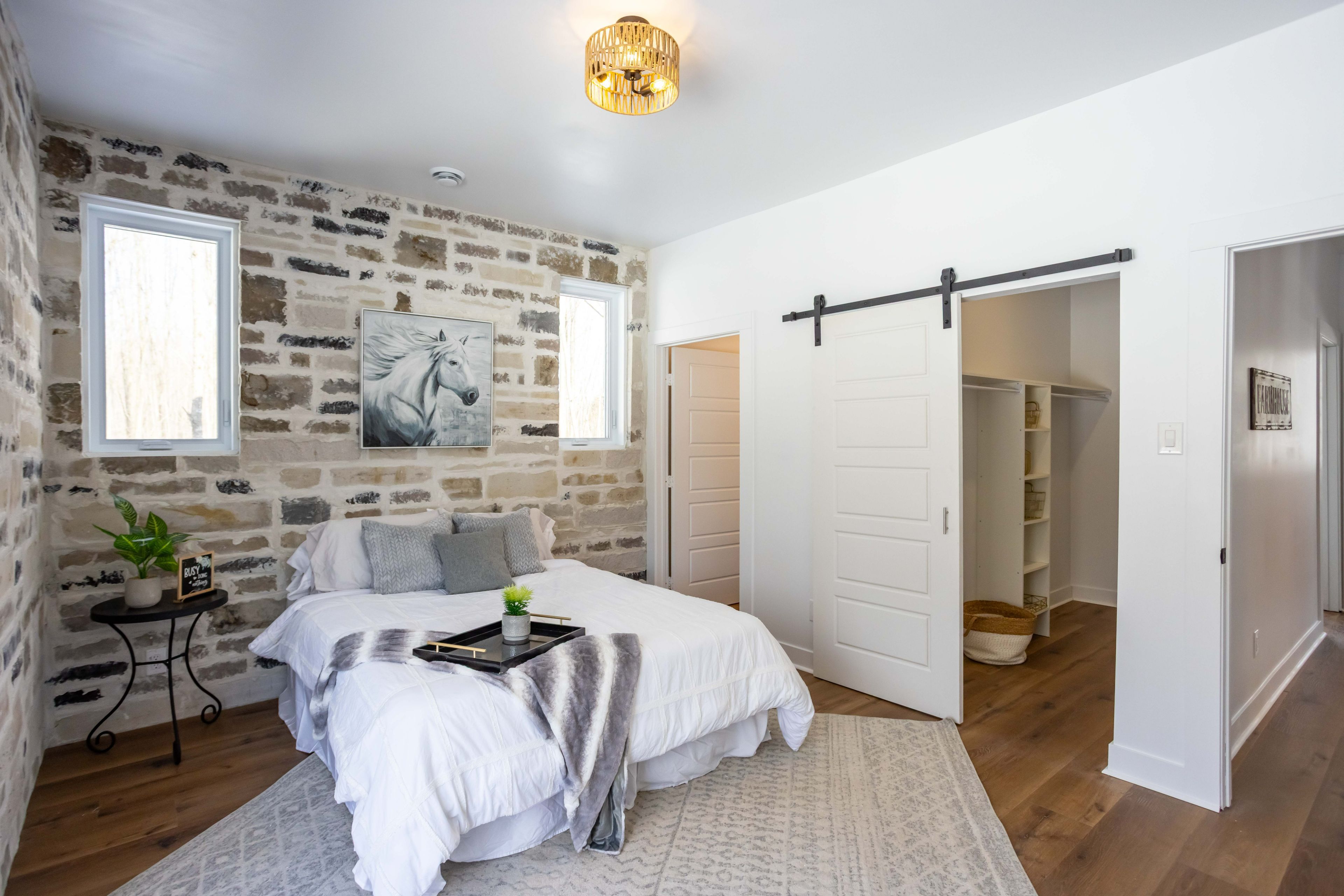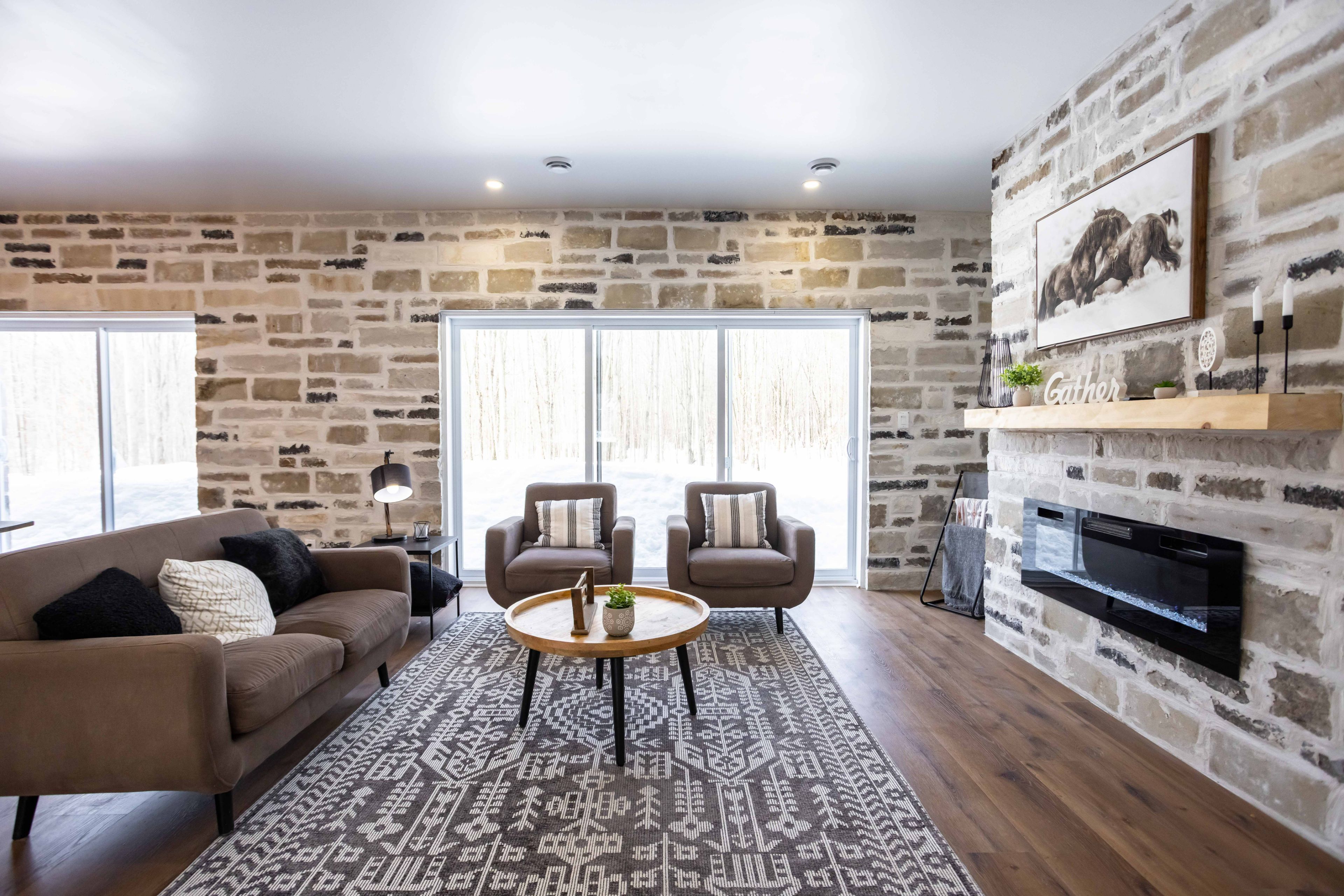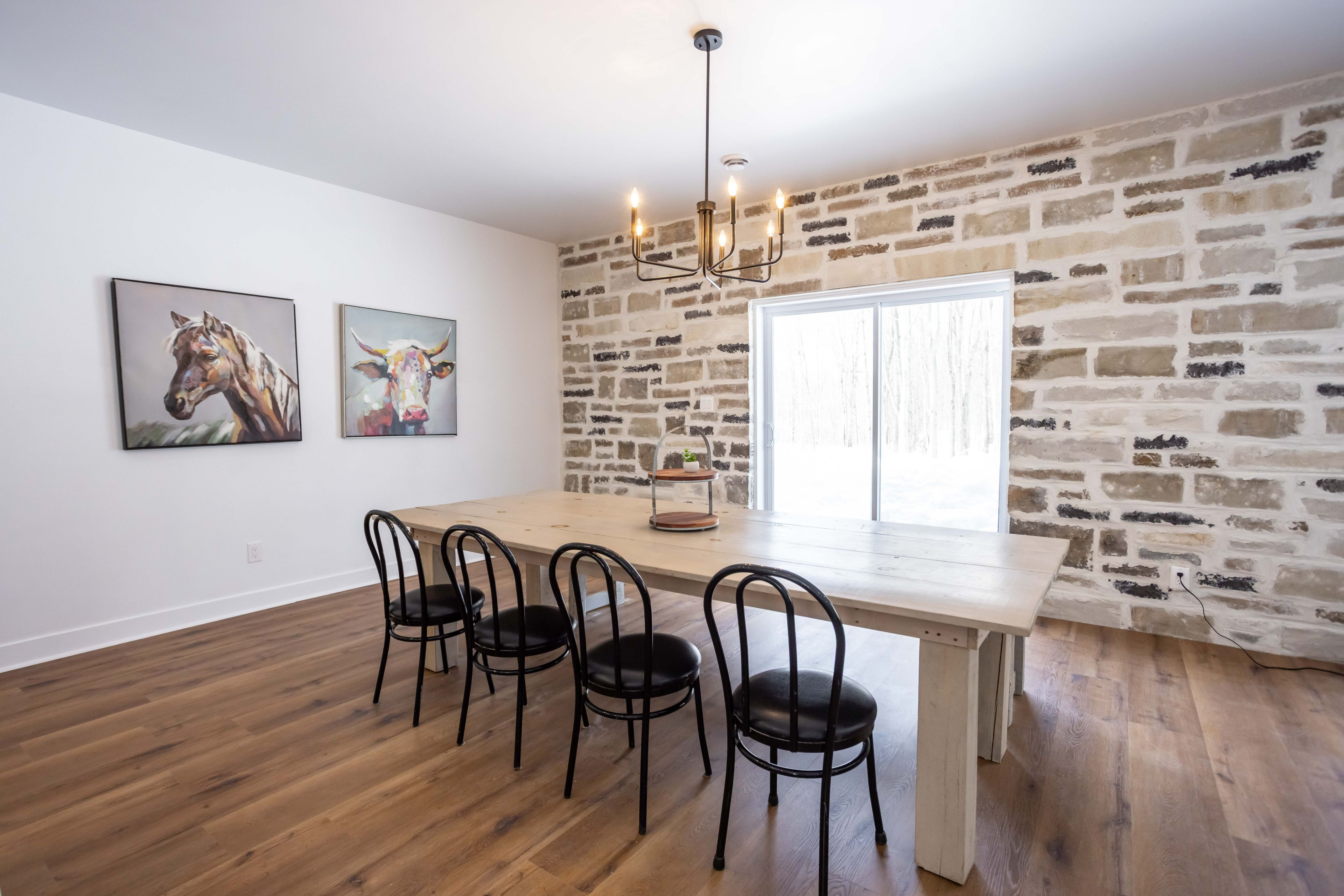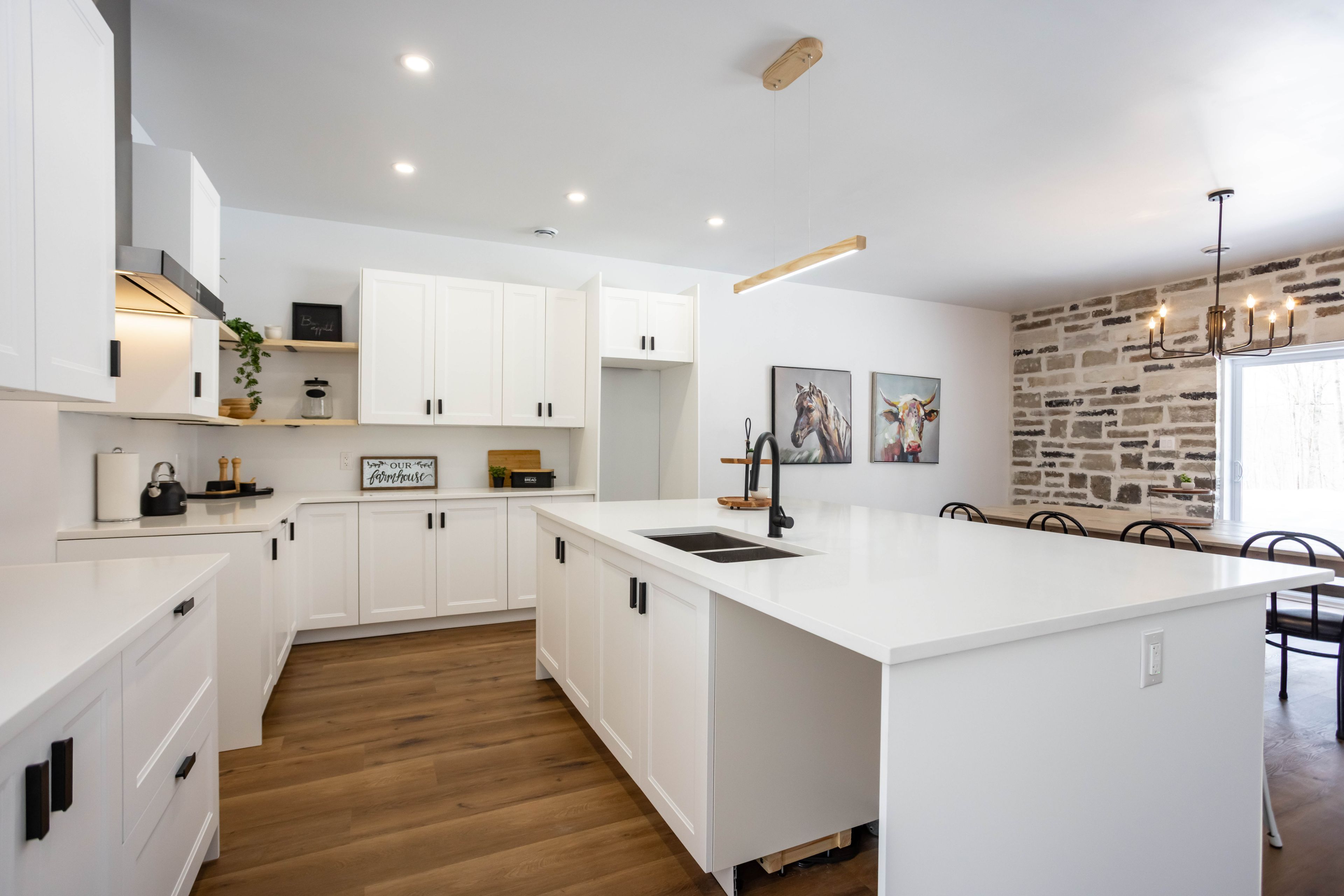 Welcome to this stunning brand new custom-built stone bungalow set on 3. 2 private acres, offering a rare blend of luxury, craftsmanship & peaceful country living surrounded by nature. Tucked among mature trees with a natural creek running along the back of the property, this home offers exceptional privacy & a tranquil setting that feels like your own private retreat. Inside, the home showcases striking architecture with 10 ft ceilings, expansive windows, & extensive use of natural stonework that adds warmth and timeless character throughout. High-end luxury vinyl flooring with a durable anti-scratch finish flows seamlessly across the entire home. The open-concept living & dining space is designed to capture the beauty of the surrounding landscape. A stunning stone feature wall with fireplace anchors the room and serves as the focal point, while large sliding doors invite natural light inside & create a seamless connection between indoor living and the peaceful outdoor setting. The kitchen features premium cabinetry, quartz countertops, & a clean modern design that blends functionality with refined style while remaining perfectly connected to the main living space for entertaining. The home offers 3 spacious bedrooms and 2 beautifully finished bathrooms, including a serene primary suite with a walk-in closet and spa-inspired ensuite featuring a double vanity and glass shower. The primary bedroom also offers direct access to the backyard, allowing you to step outside and enjoy the quiet natural surroundings. Comfort and efficiency are enhanced by a high-end heating system valued at approximately $45,000, featuring heated floors throughout the home combined with a thermal heat pump and furnace system. Additional features include an hrv air exchange system and tankless hot water heater. The impressive heated garage offers approximately 1,400 sq ft of space and features a heated garage floor, providing excellent flexibility for vehicles, storage, hobbies, or workshop use.