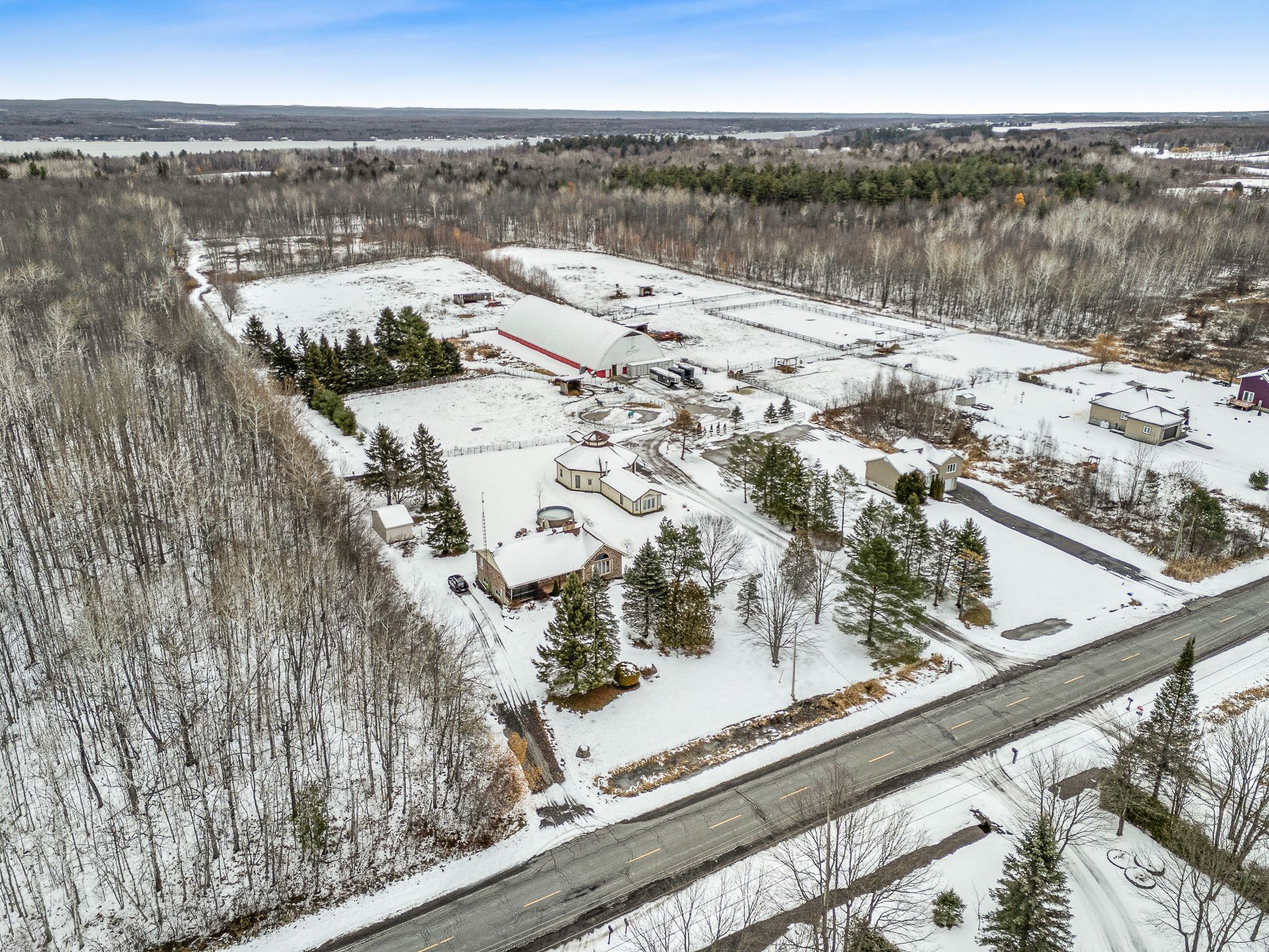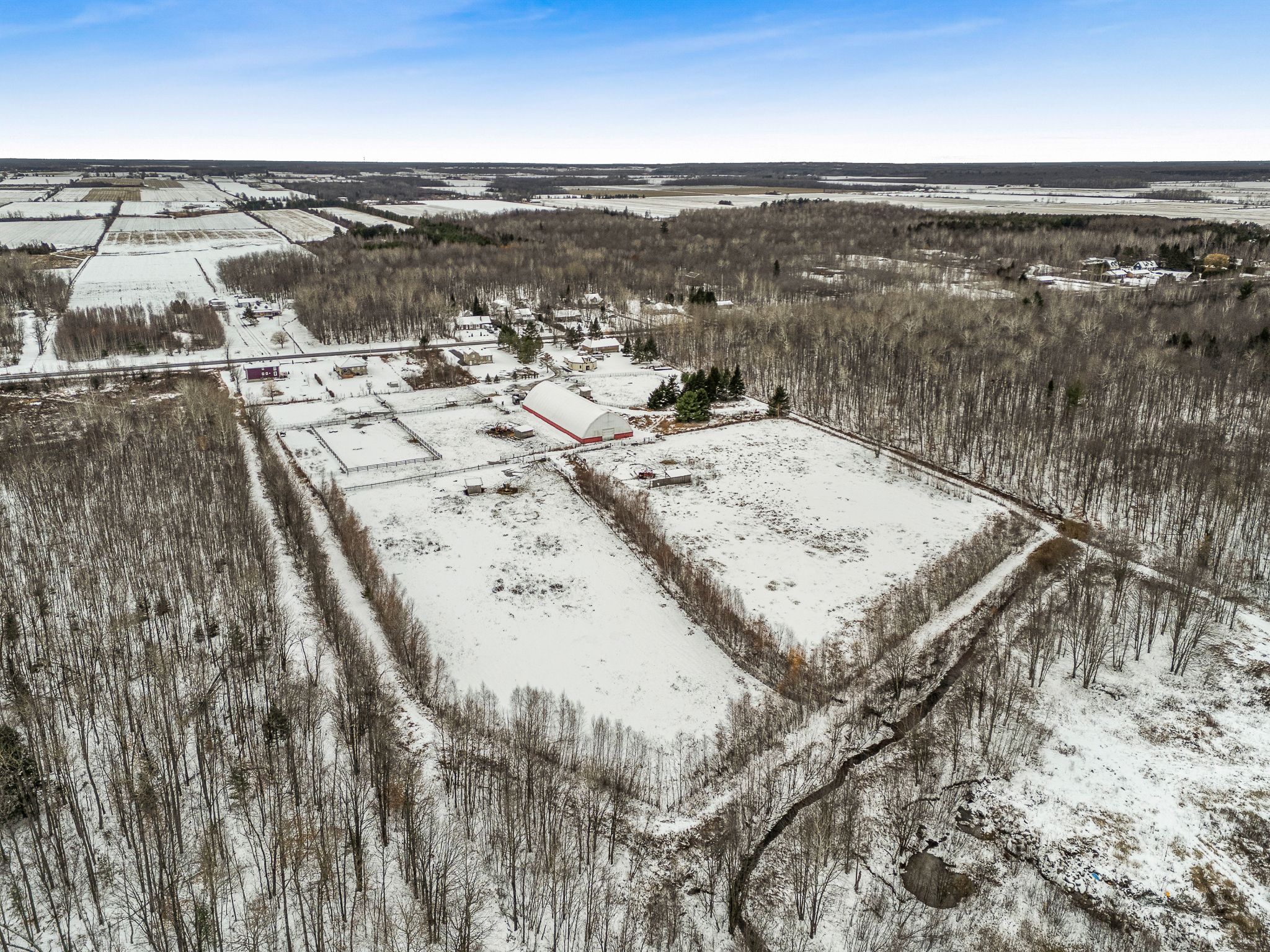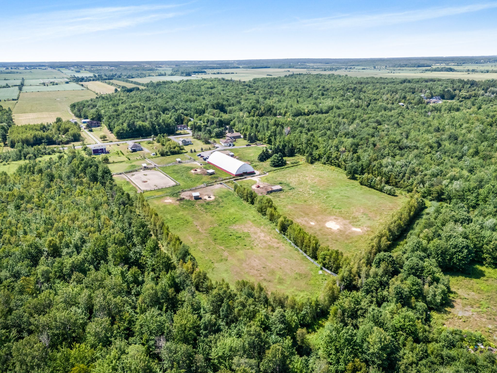 • Spacious barn features an indoor riding ring and multiple stalls for horses.