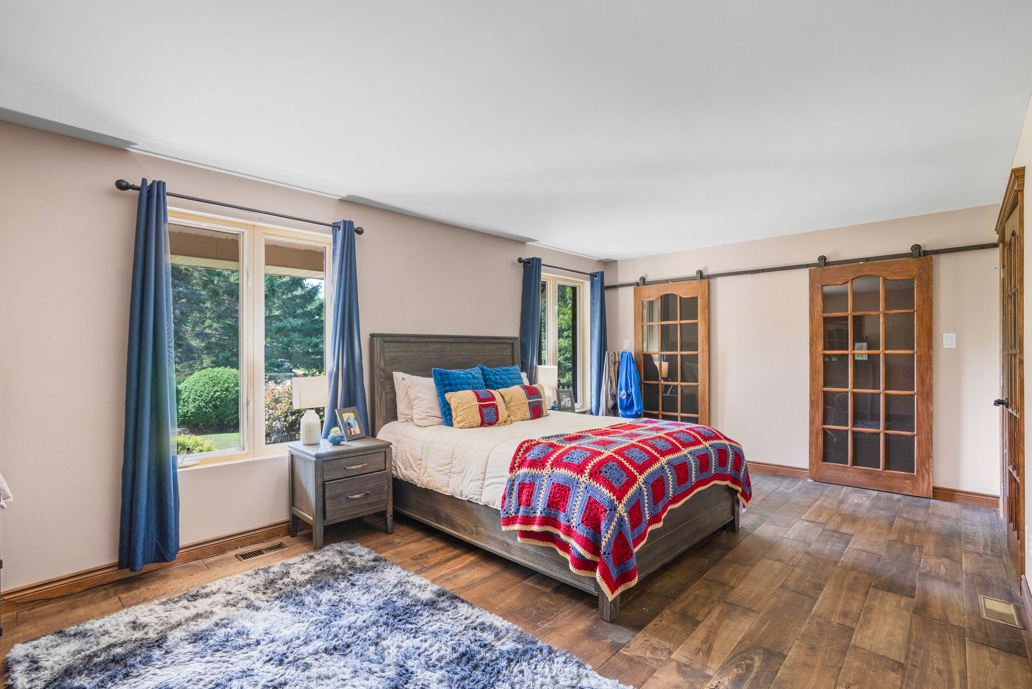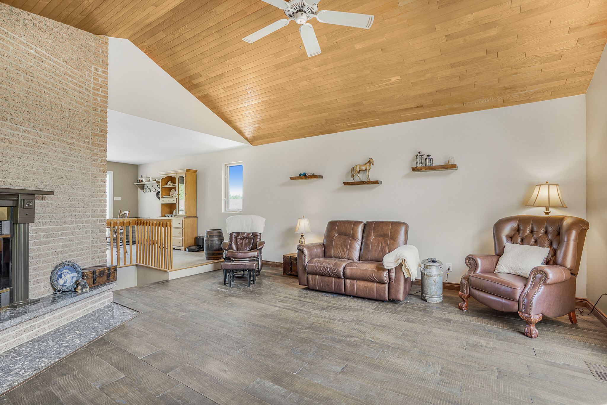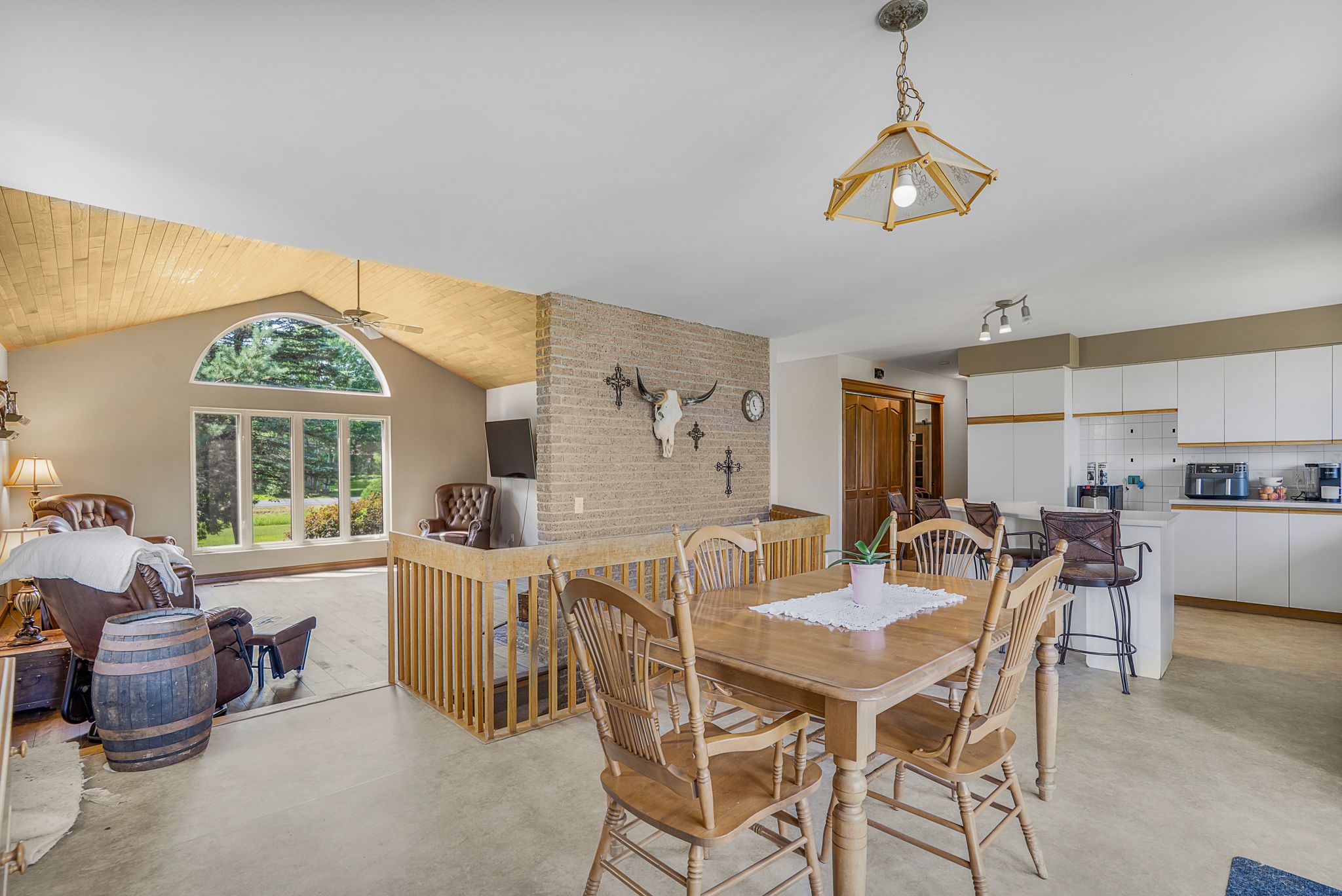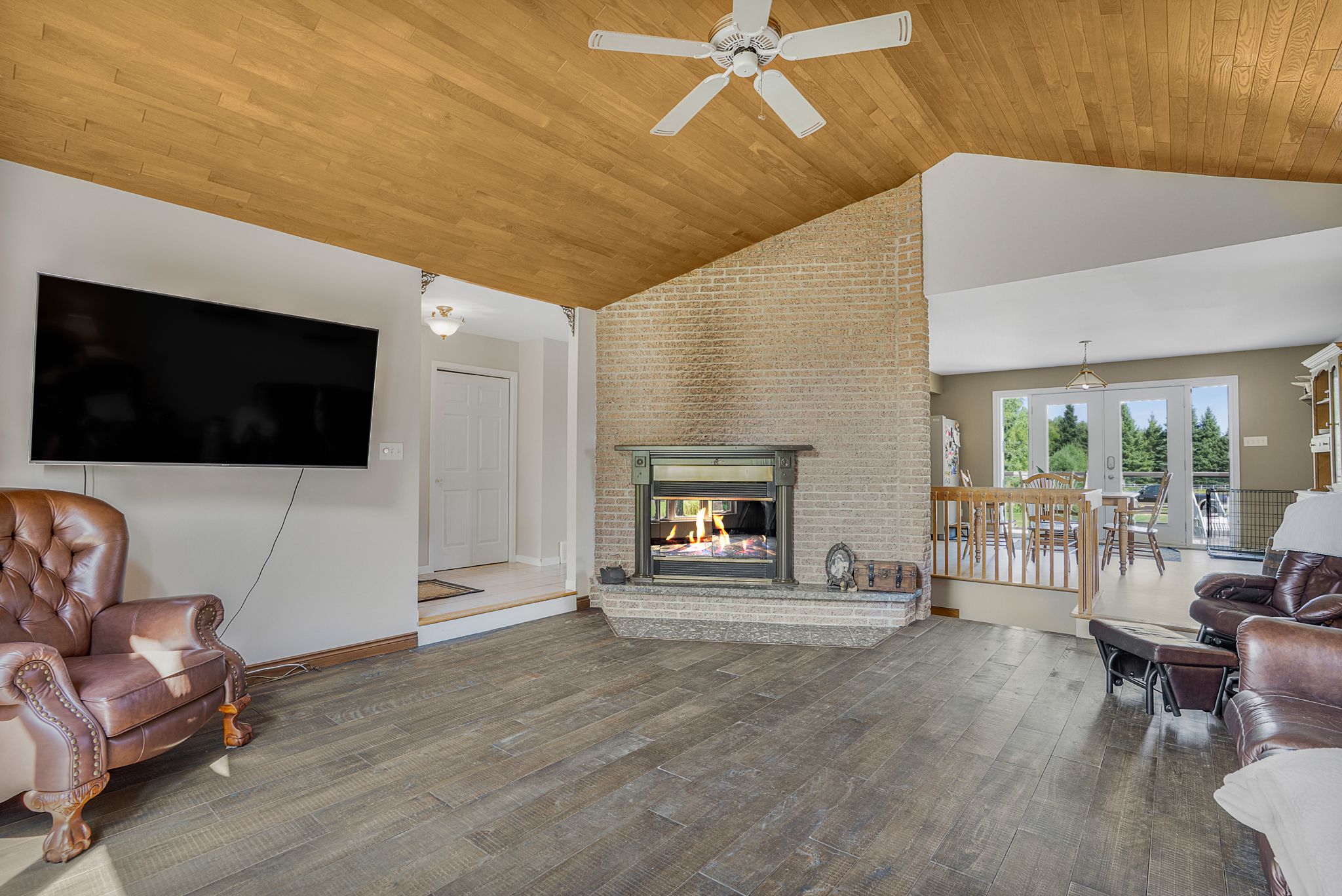 • Large family home with vaulted ceilings and a cozy wood-burning fireplace.