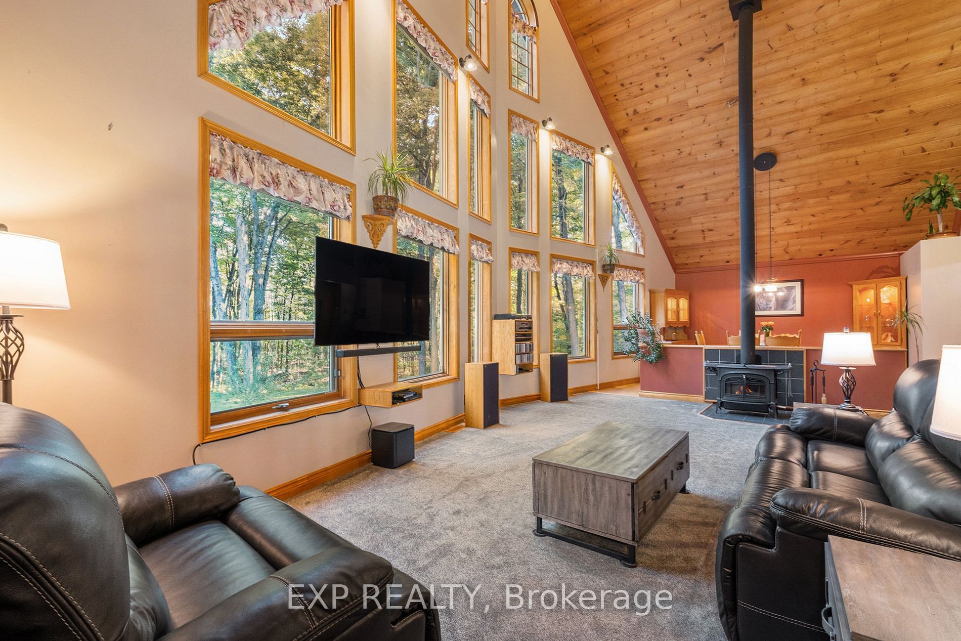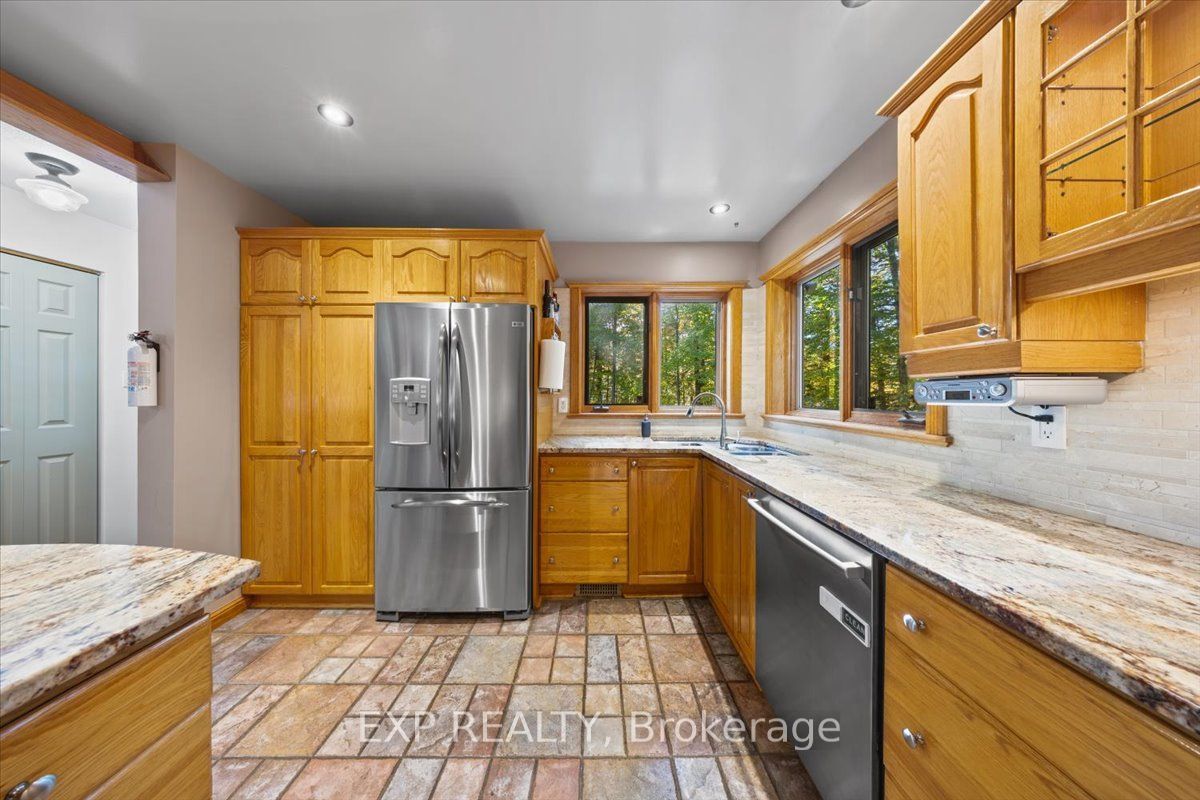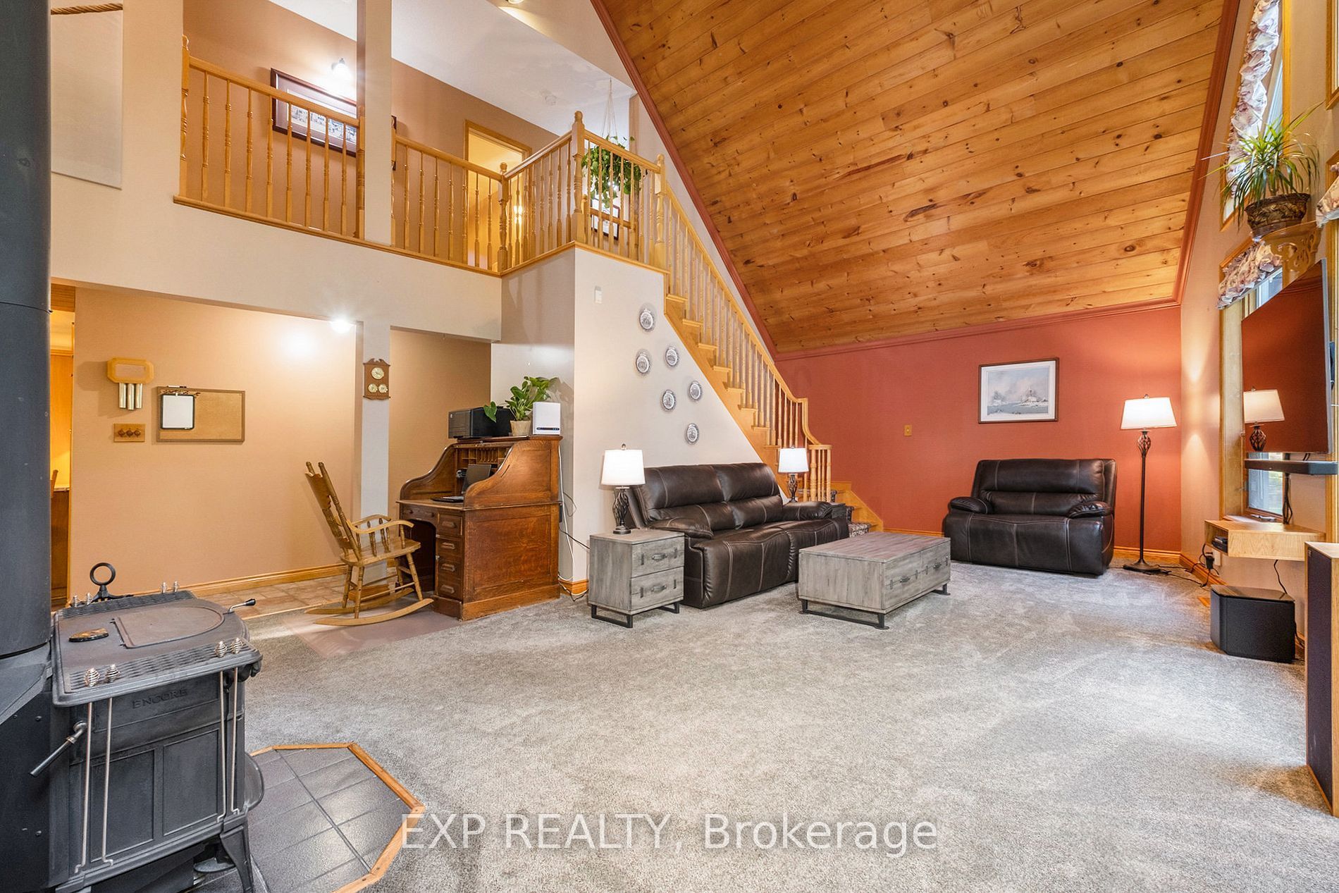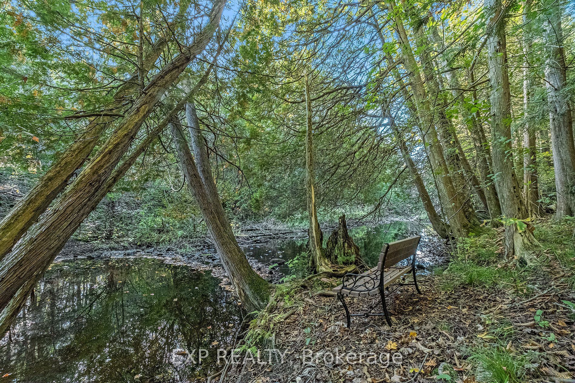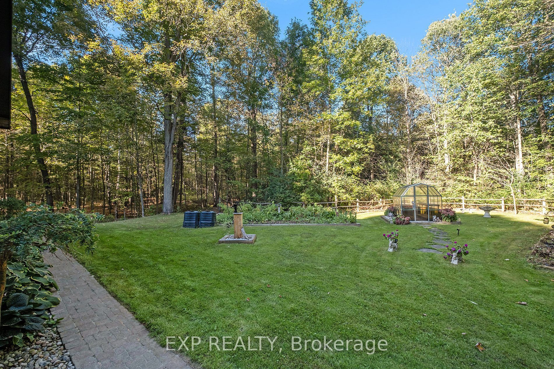 Welcome to your dream home! This stunning custom-built residence, clad in western red cedar board & batten, is set on6. 27 acres of beautifully maintained, wooded land with a private driveway offering serene seclusion and natural beauty. The home features an energy-efficient geothermal heating and cooling system, a vermont castings woodstove, and top-tier insulation throughout both the house and garage for year-round comfort. Step inside to find a freshly painted main level with brand new carpeting and a thoughtfully designed layout featuring a full 3-piece bathroom, laundry room, bedroom, and a dramatic 26'vaulted ceiling with wall-to-wall windows that flood the space with natural light. The remodeled kitchen includes stainless steel appliances, granite countertops, and a convenient breakfast bar perfect for entertaining or everyday living. Upstairs, you'll find a cozy guest bedroom, a 5-piece bathroom, a luxurious therapeutic tub included, and a spacious primary bedroom with a private balcony overlooking the peaceful, tree-lined surroundings. Both bathrooms have been updated with stylish new vanities, blending modern finishes with timeless charm. The finished basement offers a large recreation/exercise room, cold storage, and a utility/storage area. A pristine 4-car garage features an impeccably finished, climate controlled workshop ideal for hobbyists or serious diyers. Outside, enjoy a calming patio with a custom pond, a vegetable garden, a greenhouse, and ample storage buildings. Explore the scenic trails or relax beside the charming creek that runs through the property. This one-of-a-kind retreat blends comfort, functionality, and natural beauty an exceptional opportunity for those seeking privacy and connection to the outdoors. Only12 min. From kemptville and 6min. To beautiful merrickville. The basement furniture (pool table, hockey table, exercise equipment, couch, chair and tv) is included in the sale.