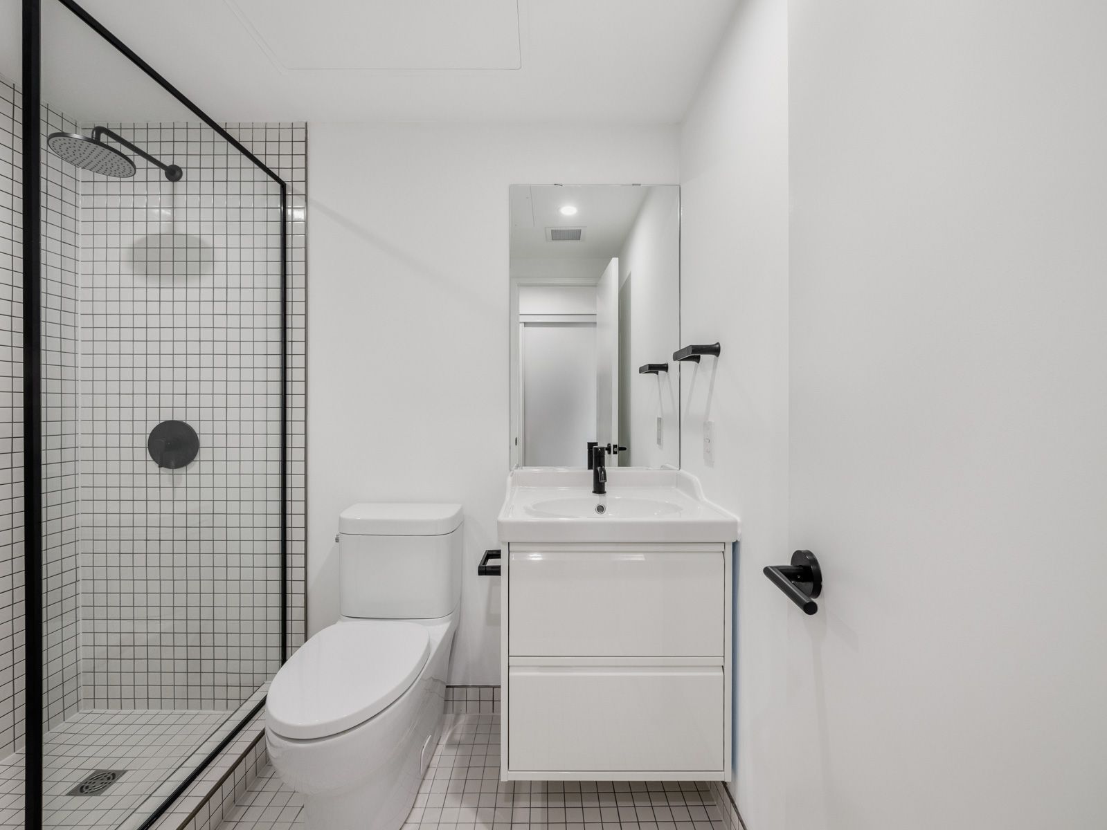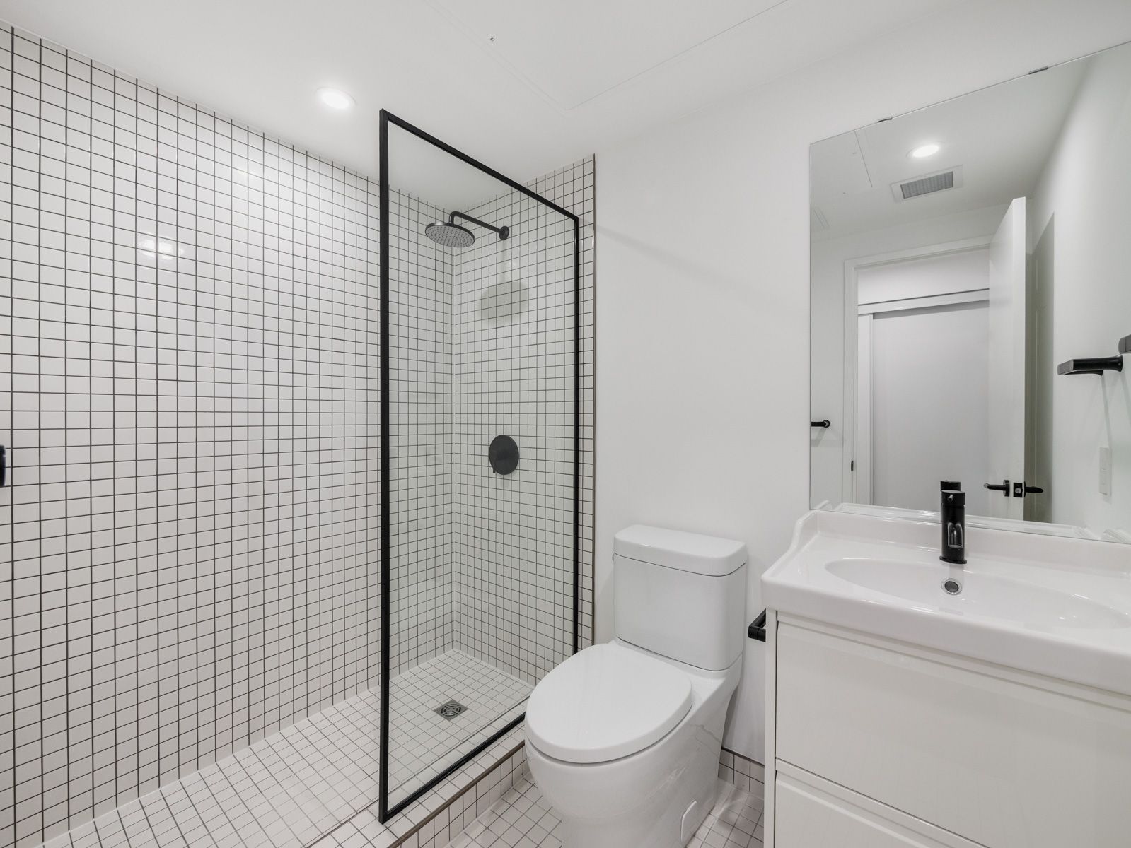 • Modern bathroom features custom tiled walk-in shower and ample storage.