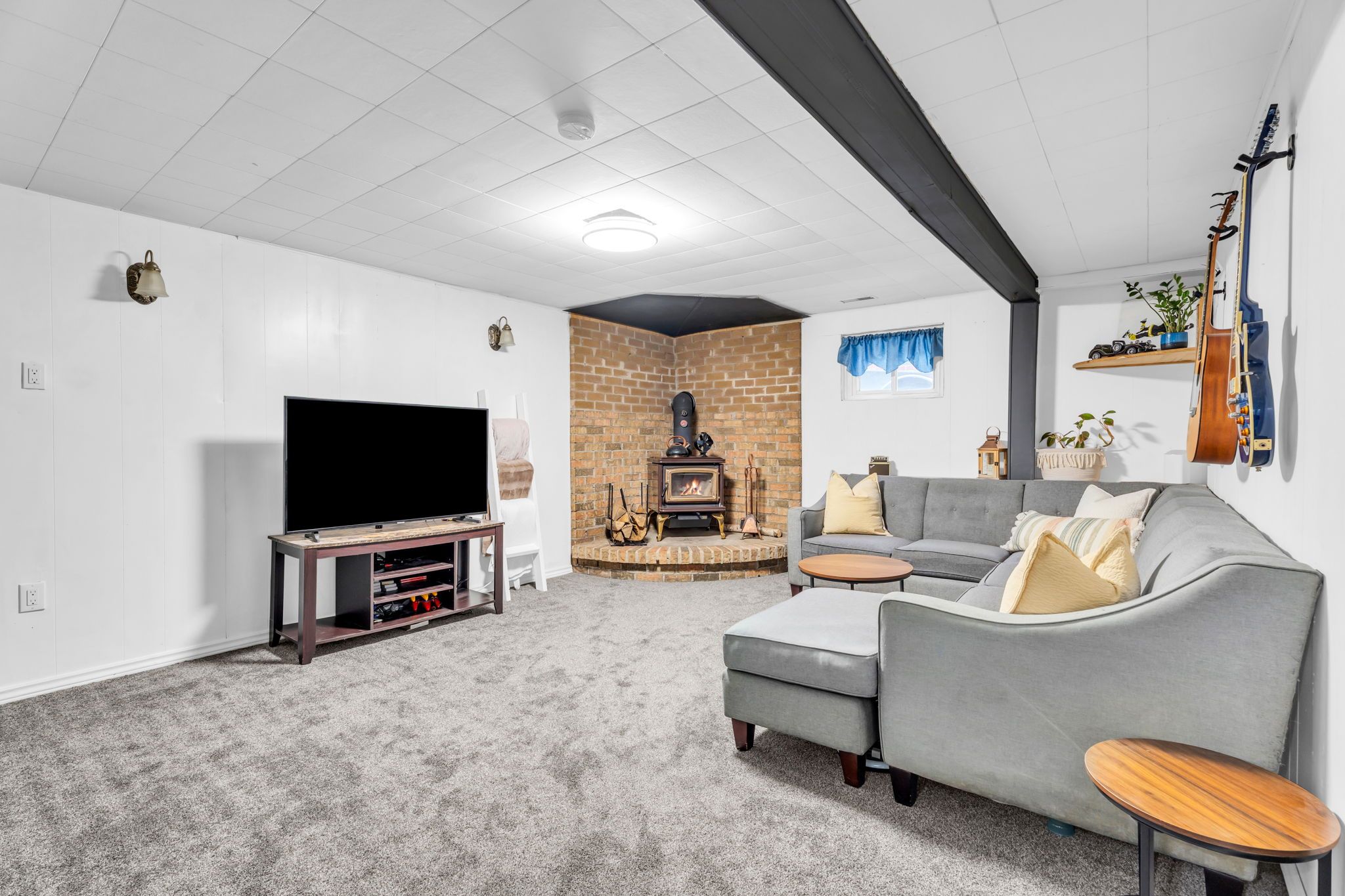 • Finished basement with cozy wood stove and ample storage.