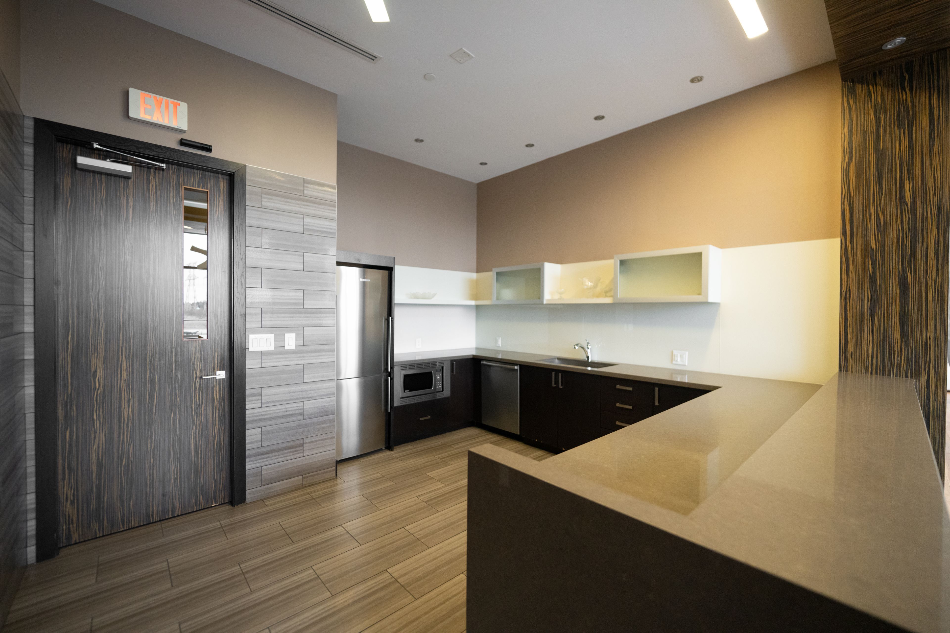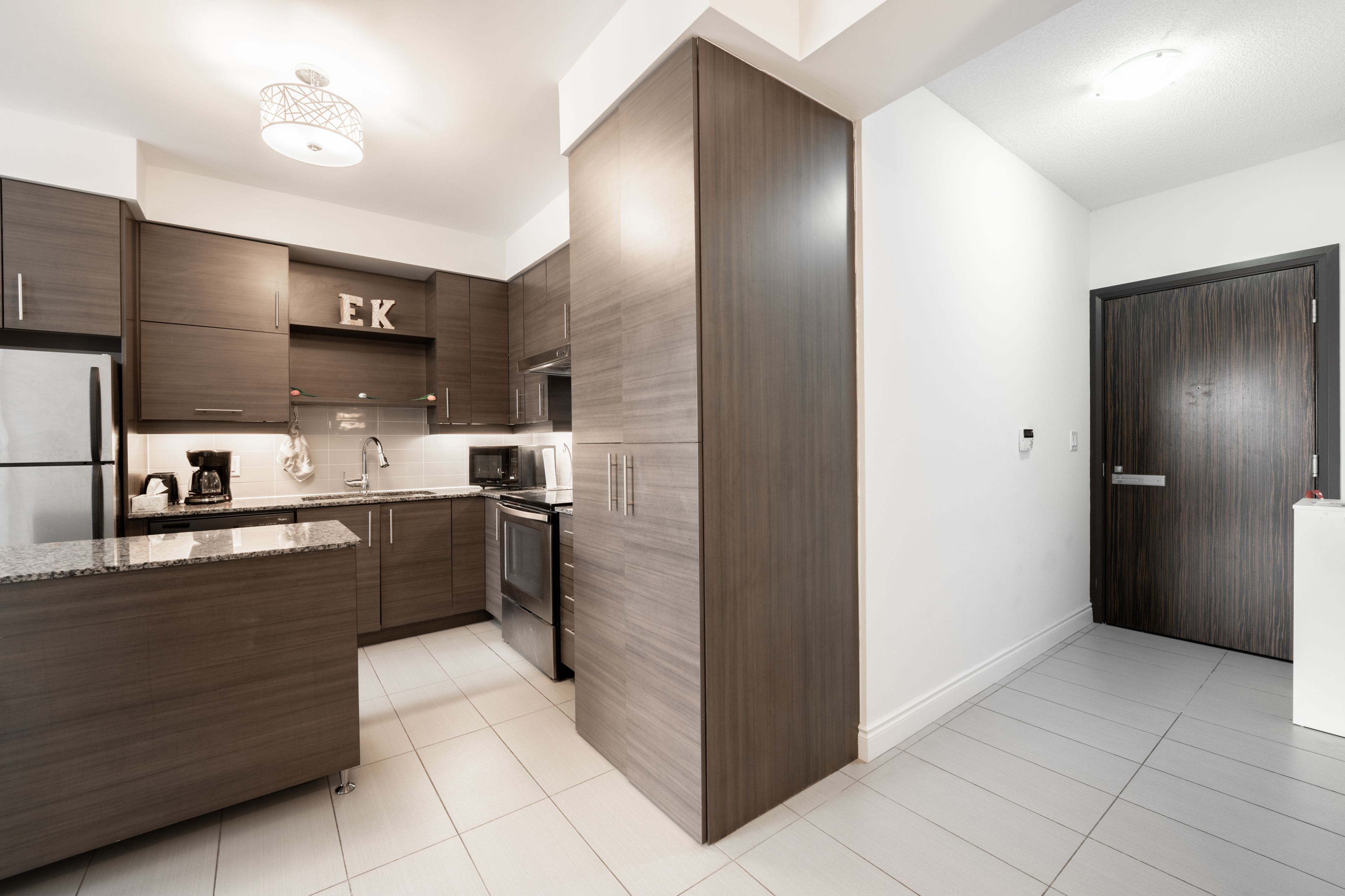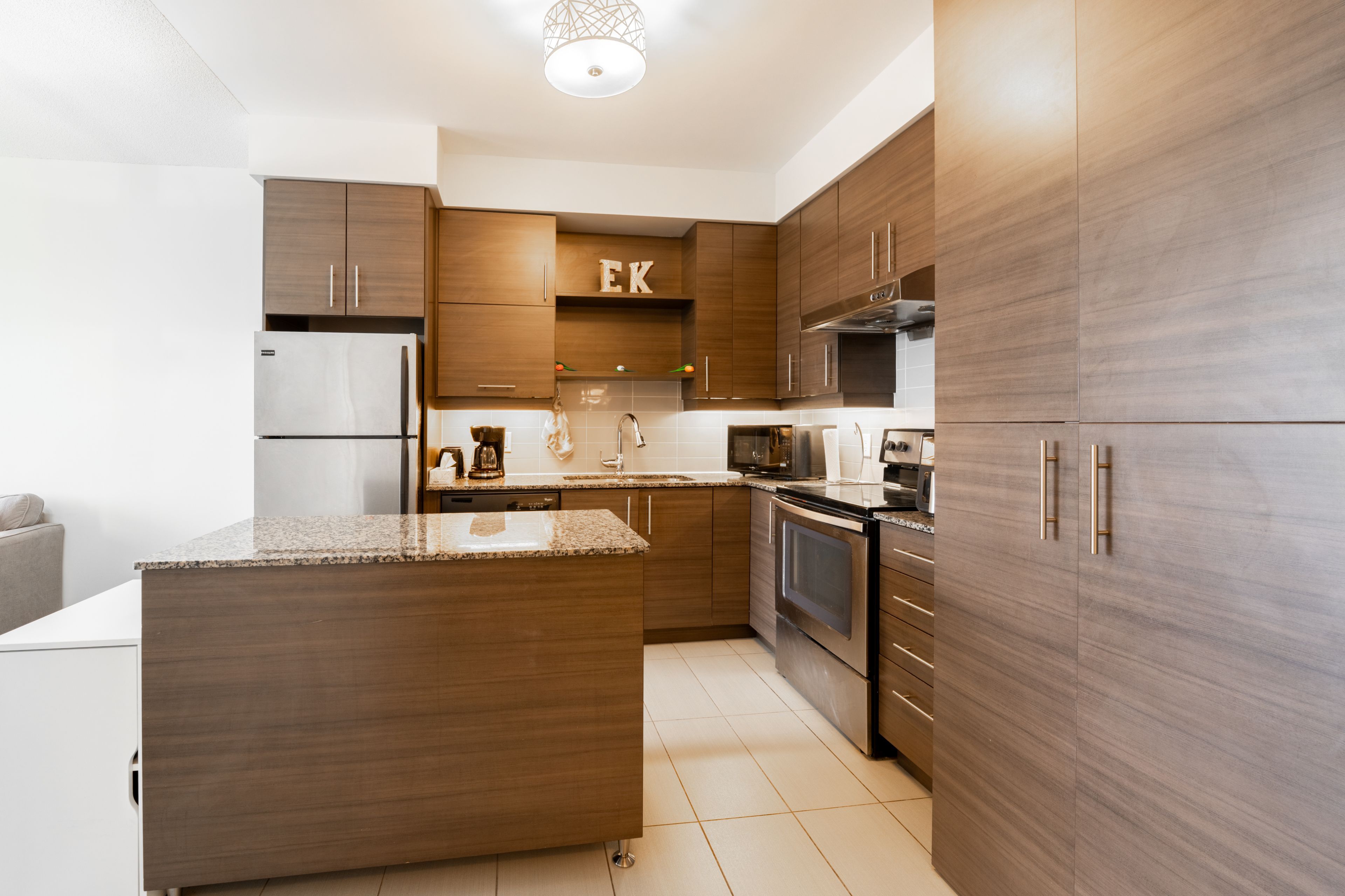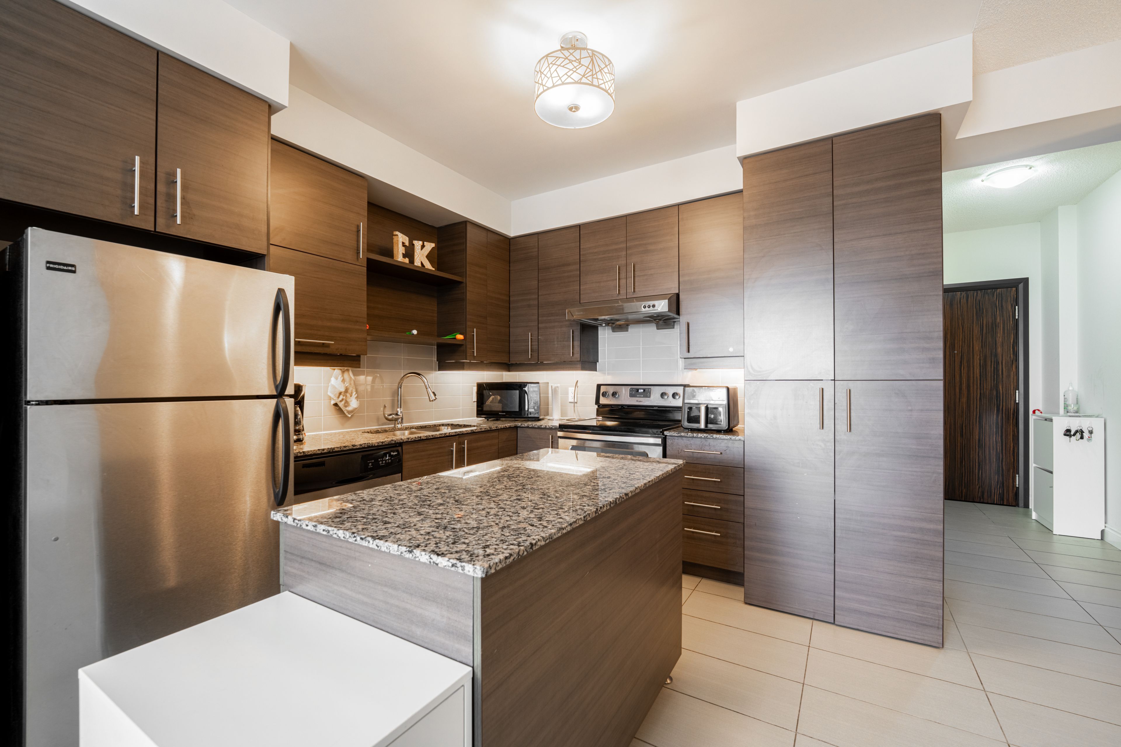 • Modern kitchen featuring granite/quartz countertops and stainless steel appliances.