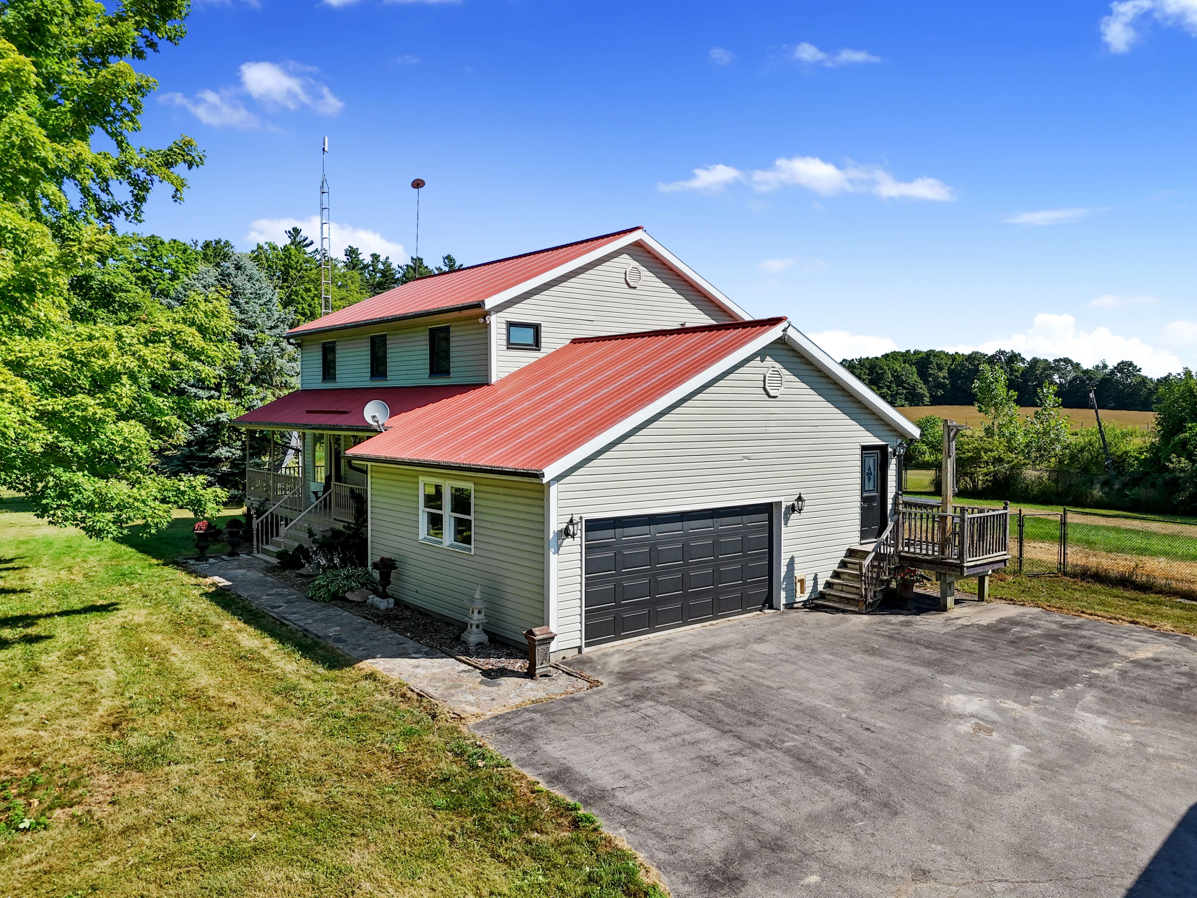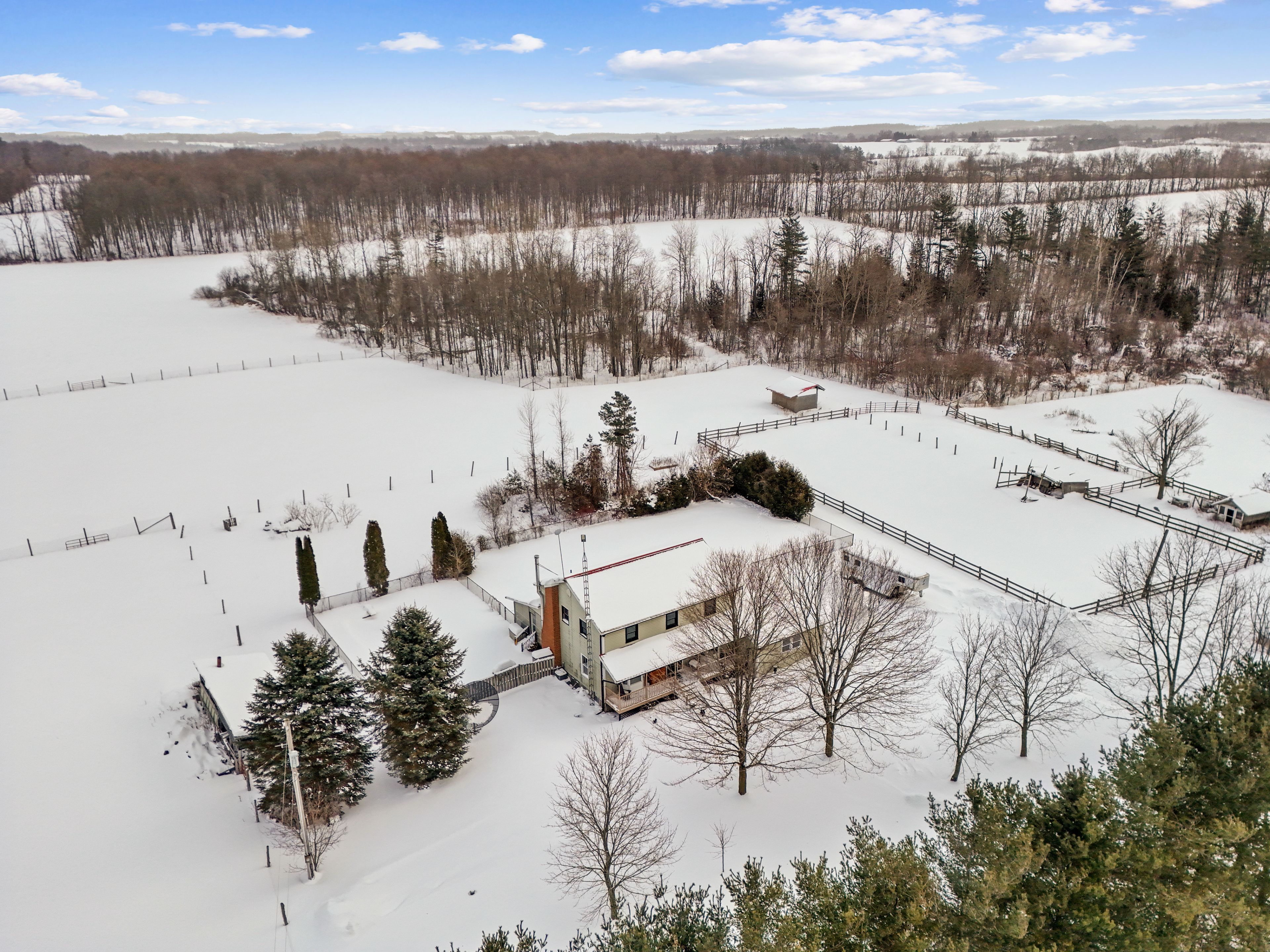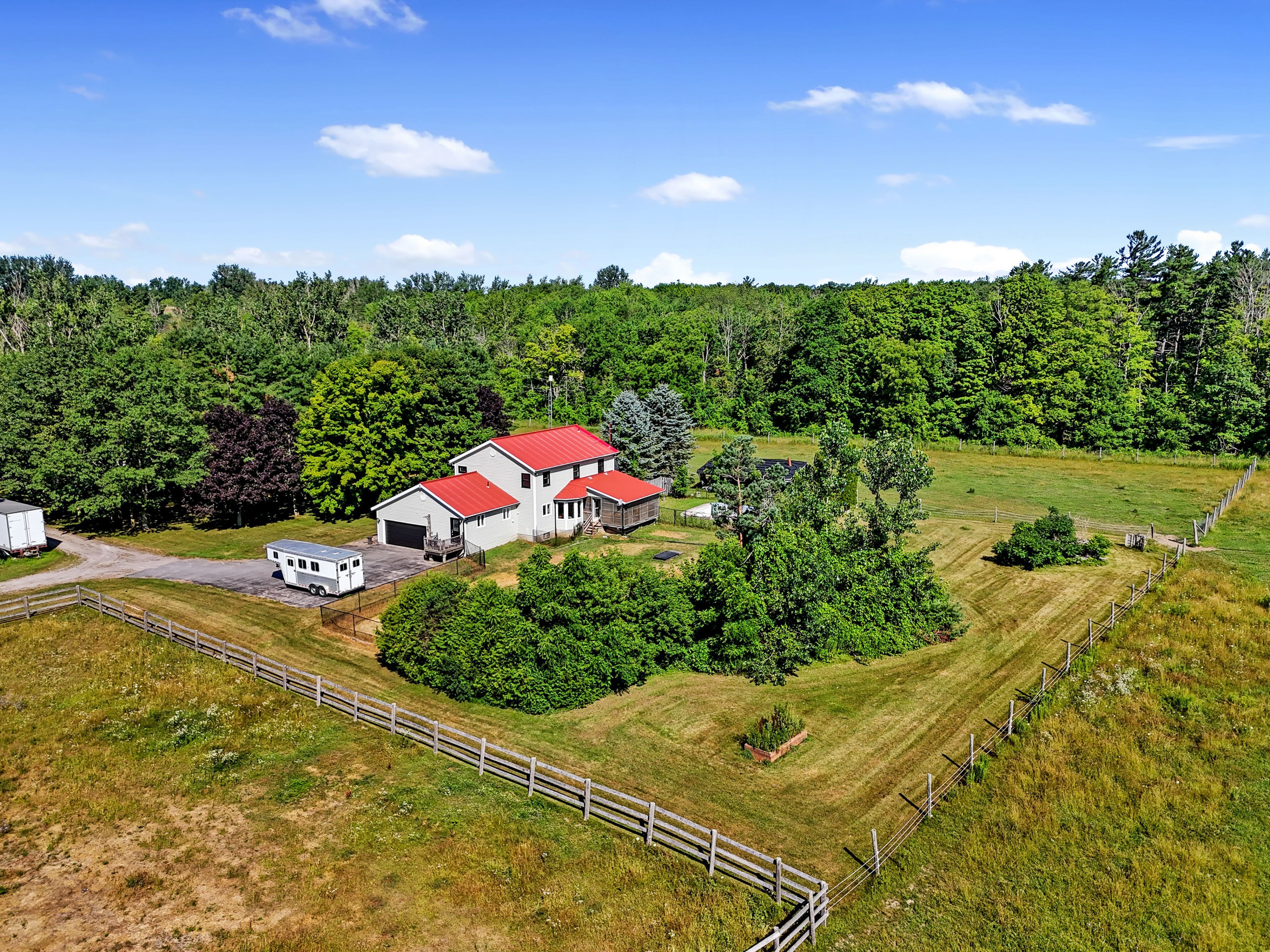 Set on 37 acres of picturesque countryside, this hobby farm offers the perfect blend of peaceful rural living and practical functionality. A charming barn, fenced paddocks, and approximately 20 acres of workable hay fields make this an ideal property for equestrian or farming pursuits. Begin your mornings on the tranquil front porch, soaking in views and the quiet rhythm of country life. Step inside to a spacious front entry that leads into a bright front living room with french doors and a bay window. The open-concept main living area features a cozy family room with a fireplace and walkout, a dining space framed by a sunny bayed window nook, and a well-appointed kitchen with stainless steel appliances, pantry, breakfast bar, and generous counter and cabinet space. The main floor also features a versatile office or bedroom with a large window, a guest bathroom, laundry area, and a convenient mudroom. Upstairs, the spacious primary suite boasts a full ensuite with a soaker tub and separate shower. Three additional bedrooms and a full bathroom complete the upper level. Step outside to enjoy the covered back deck, a fenced yard area, and attached garage. Outbuildings include a barn, paddocks, and additional structures to support your agricultural needs. The property features approximately 4 acres of fenced paddocks, equipped with electric fencing and an automatic water feeder in two of them. Whether you're seeking a hobby farm or a serene country retreat, this property is the ideal escape.