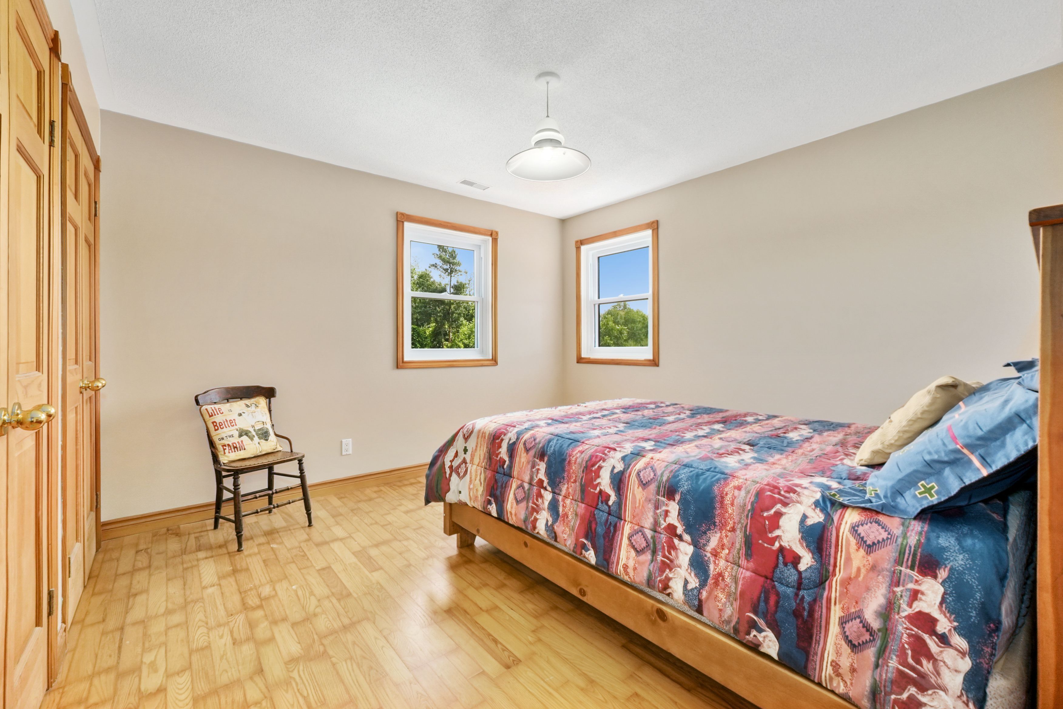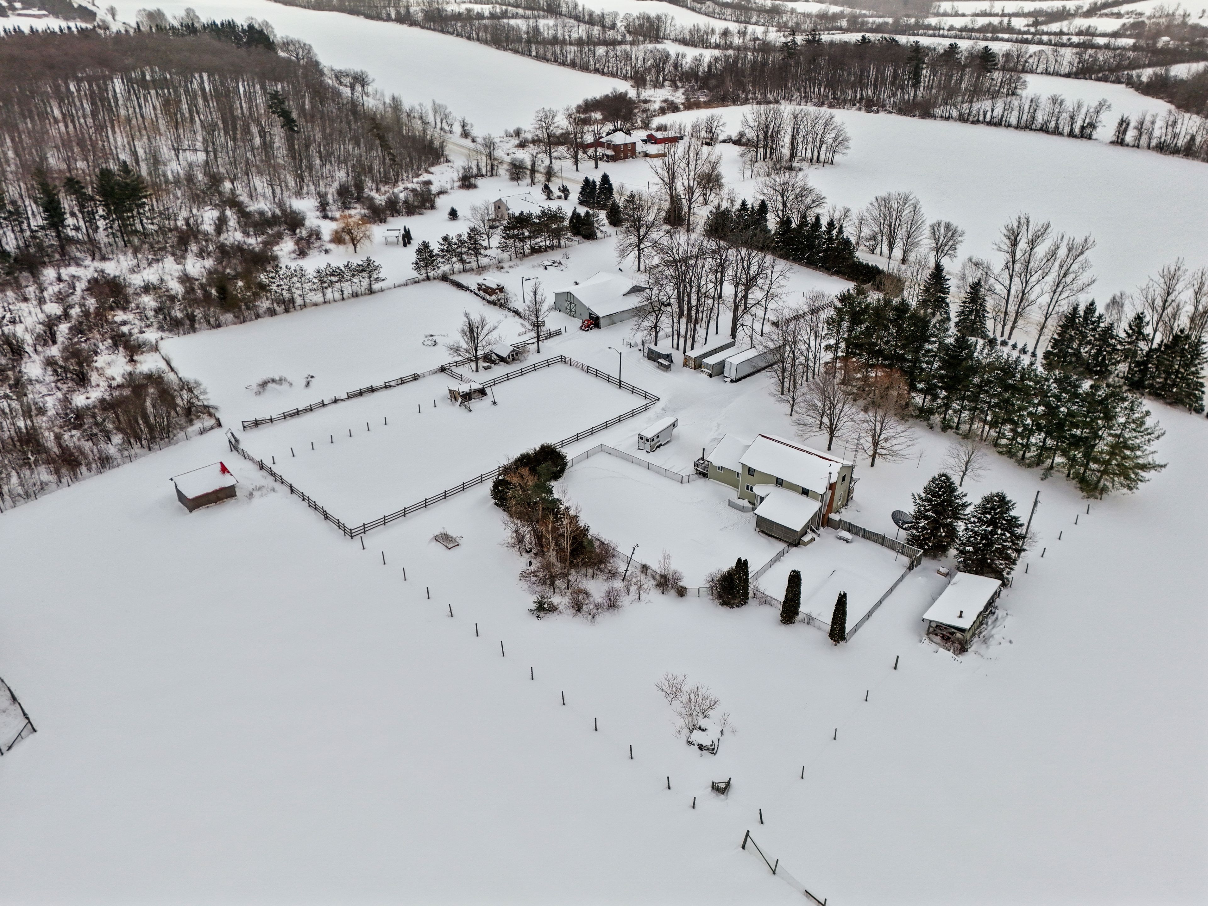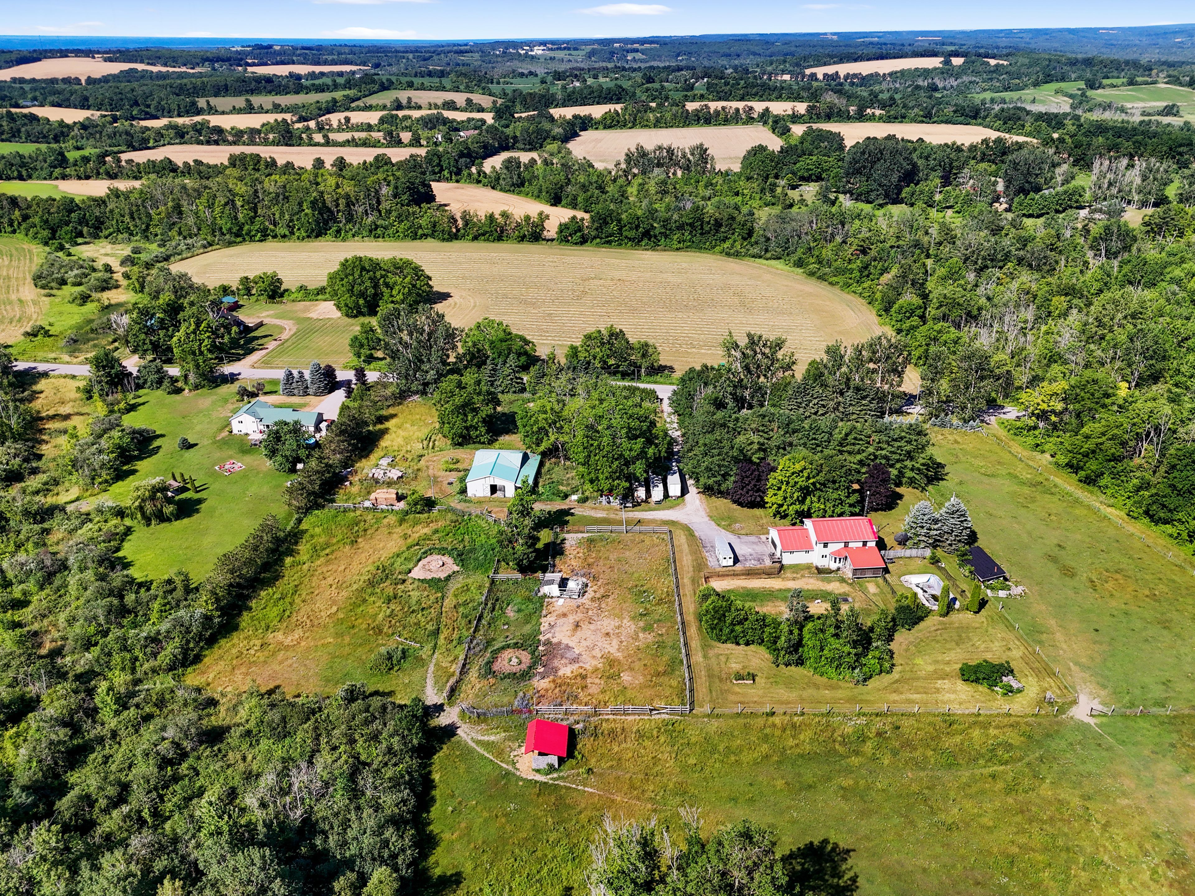 Set on 37 acres of picturesque countryside, this hobby farm offers the perfect blend of peaceful rural living and practical functionality. A charming barn, fenced paddocks, and approximately 20 acres of workable hay fields make this an ideal property for equestrian or farming pursuits. Begin your mornings on the tranquil front porch, soaking in views and the quiet rhythm of country life. Step inside to a spacious front entry that leads into a bright front living room with french doors and a bay window. The open-concept main living area features a cozy family room with a fireplace and walkout, a dining space framed by a sunny bayed window nook, and a well-appointed kitchen with stainless steel appliances, pantry, breakfast bar, and generous counter and cabinet space. The main floor also features a versatile office or bedroom with a large window, a guest bathroom, laundry area, and a convenient mudroom. Upstairs, the spacious primary suite boasts a full ensuite with a soaker tub and separate shower. Three additional bedrooms and a full bathroom complete the upper level. Step outside to enjoy the covered back deck, a fenced yard area, and attached garage. Outbuildings include a barn, paddocks, and additional structures to support your agricultural needs. The property features approximately 4 acres of fenced paddocks, equipped with electric fencing and an automatic water feeder in two of them. Whether you're seeking a hobby farm or a serene country retreat, this property is the ideal escape.