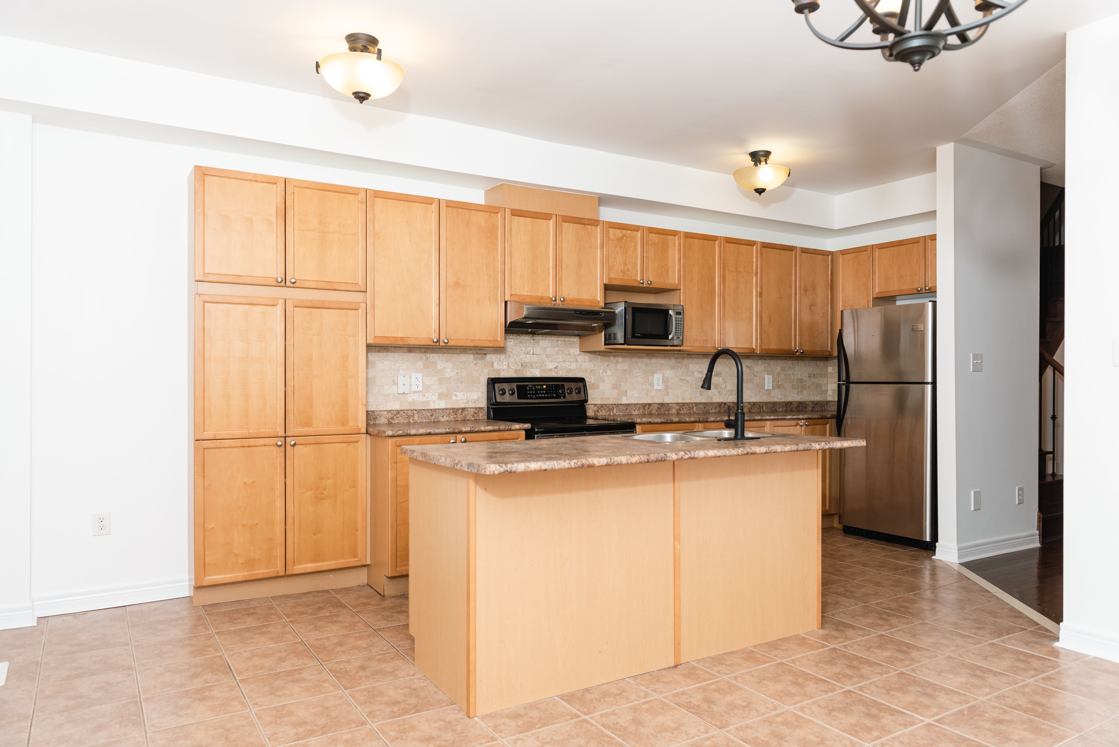 • Spacious kitchen with large island and stainless steel appliances.
