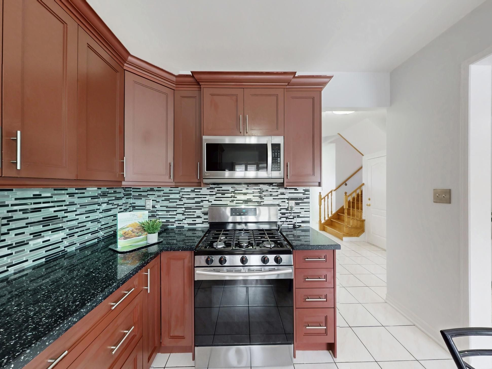 • Contemporary kitchen with stainless steel appliances and granite countertops.