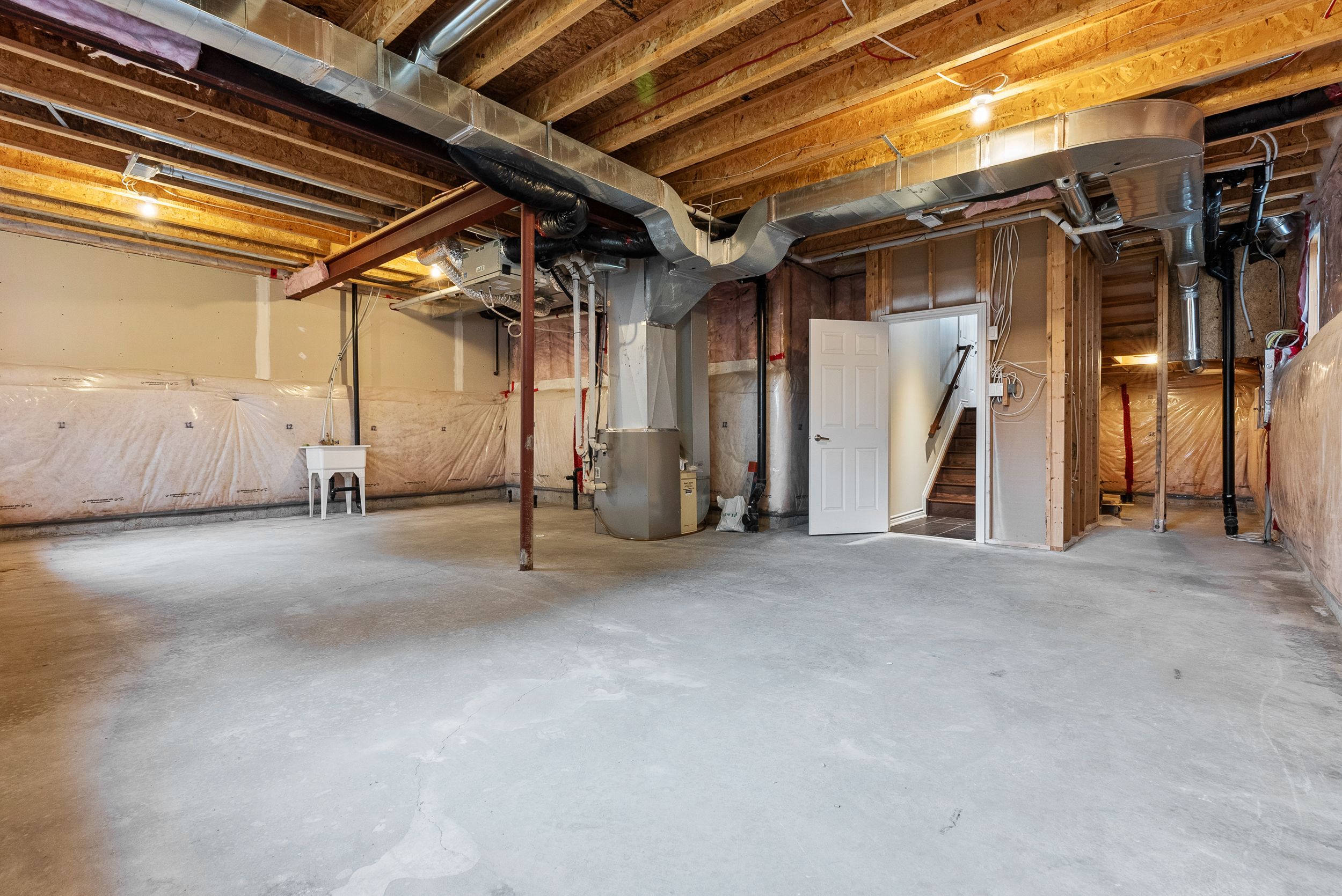 • High-ceiling basement offers potential for recreation or relaxation.