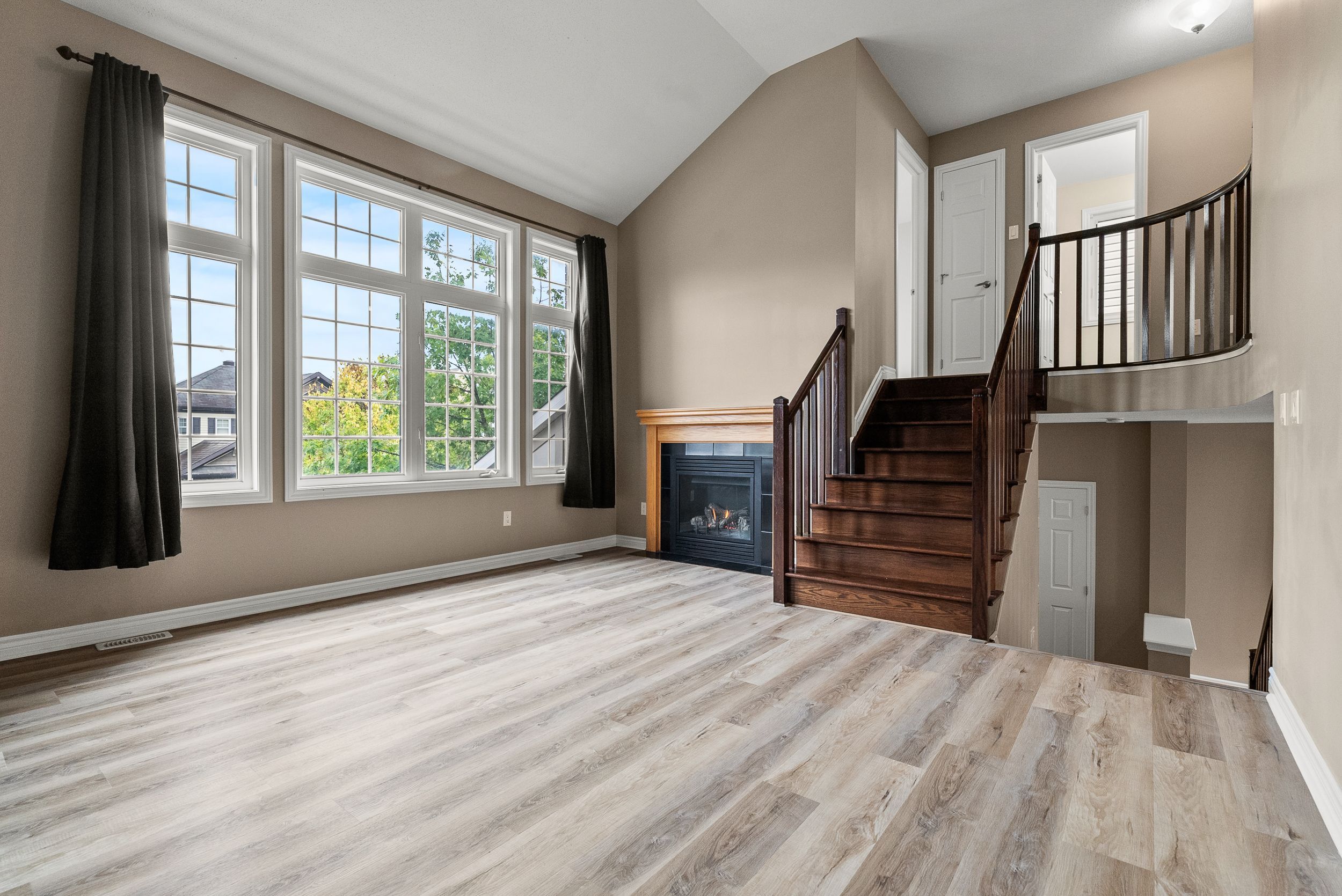 • Open-concept main floor with stylish flooring and a cozy gas fireplace.