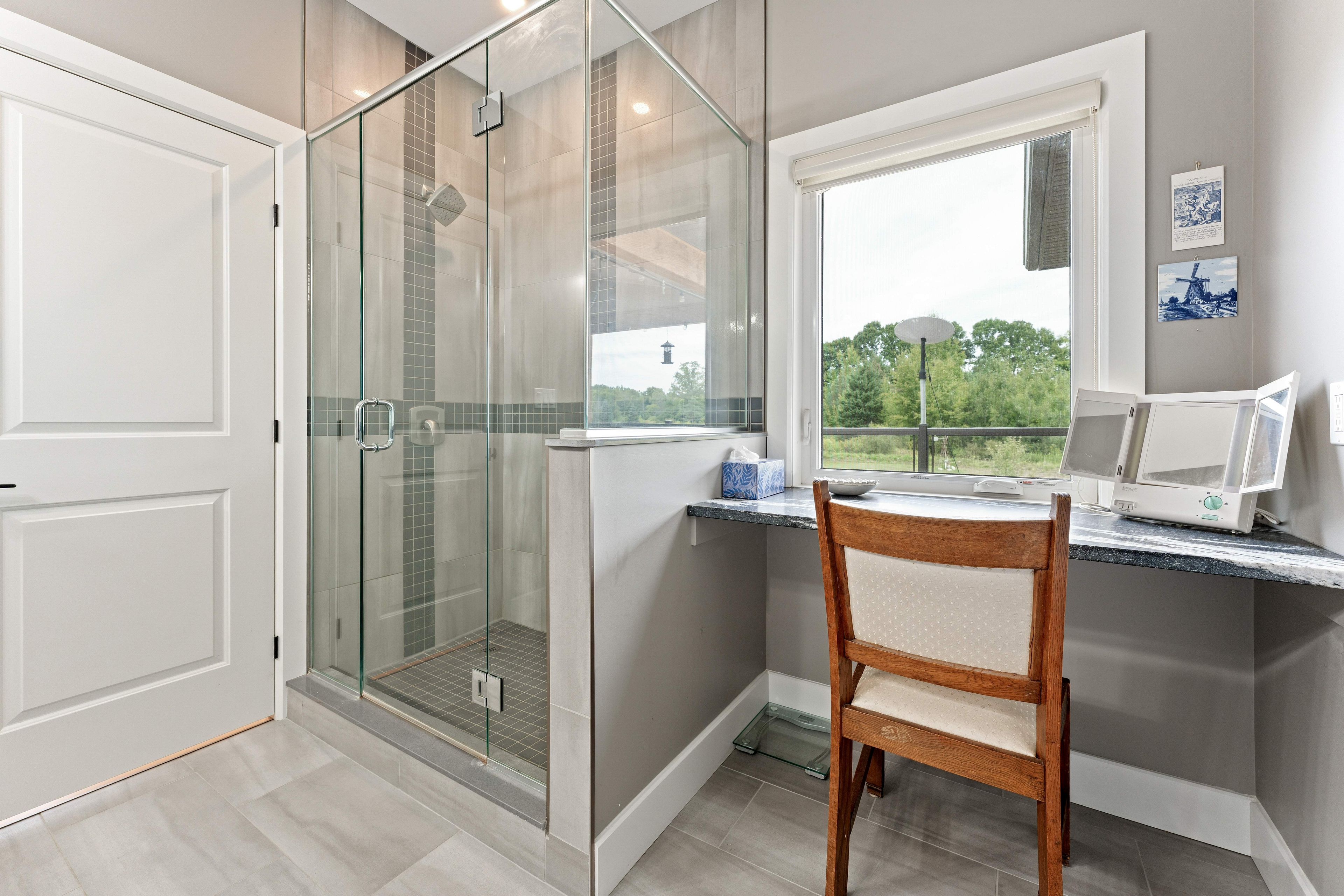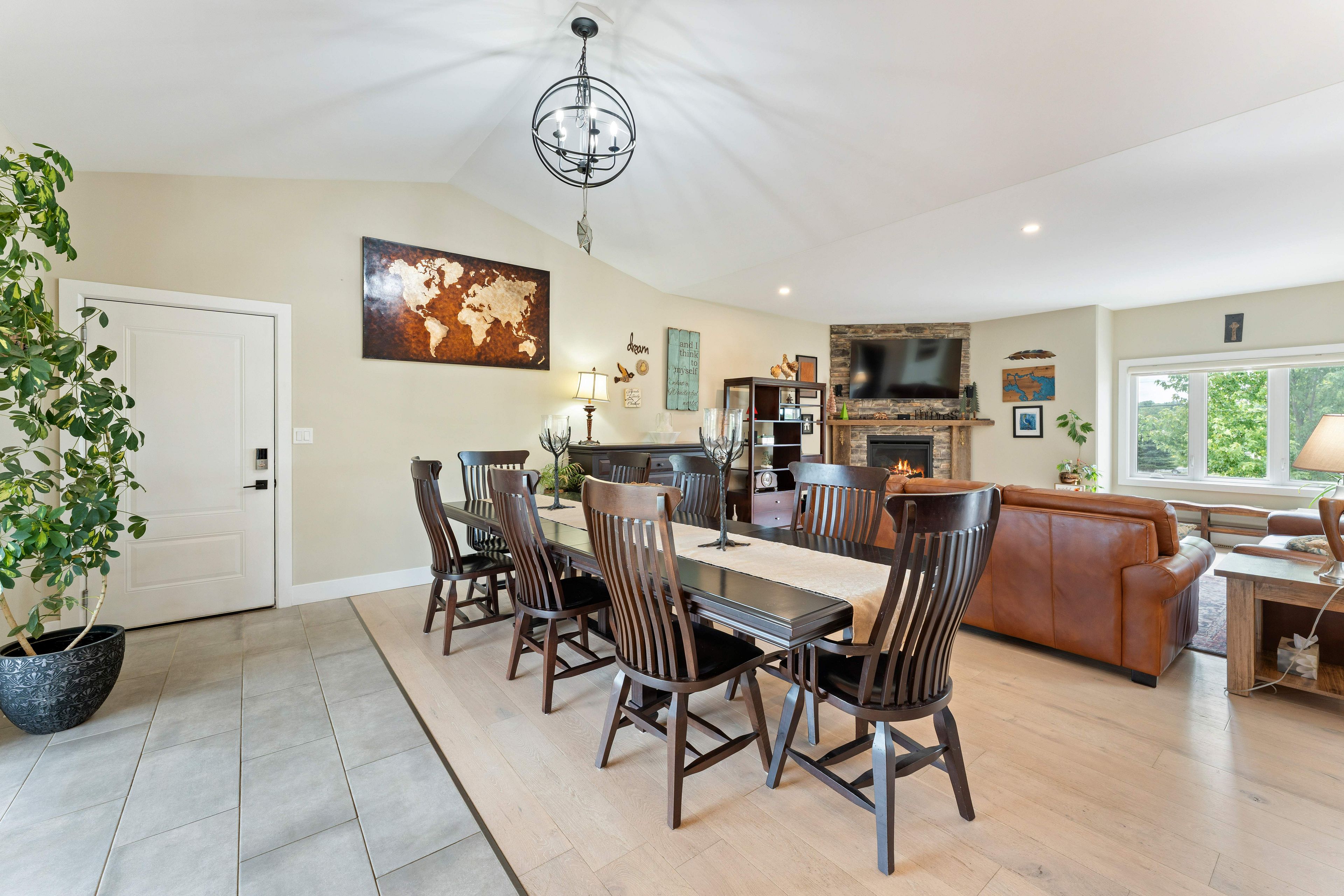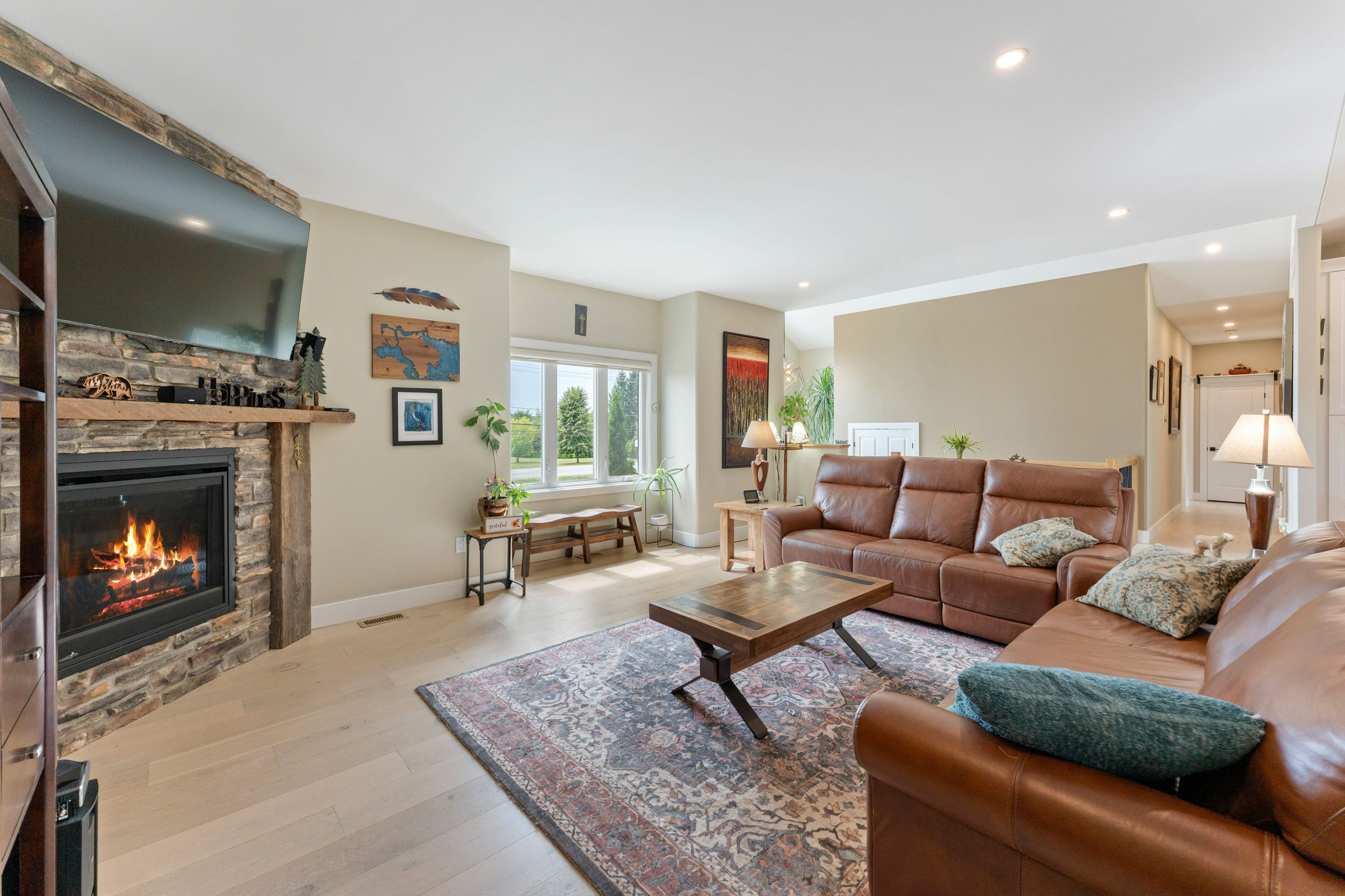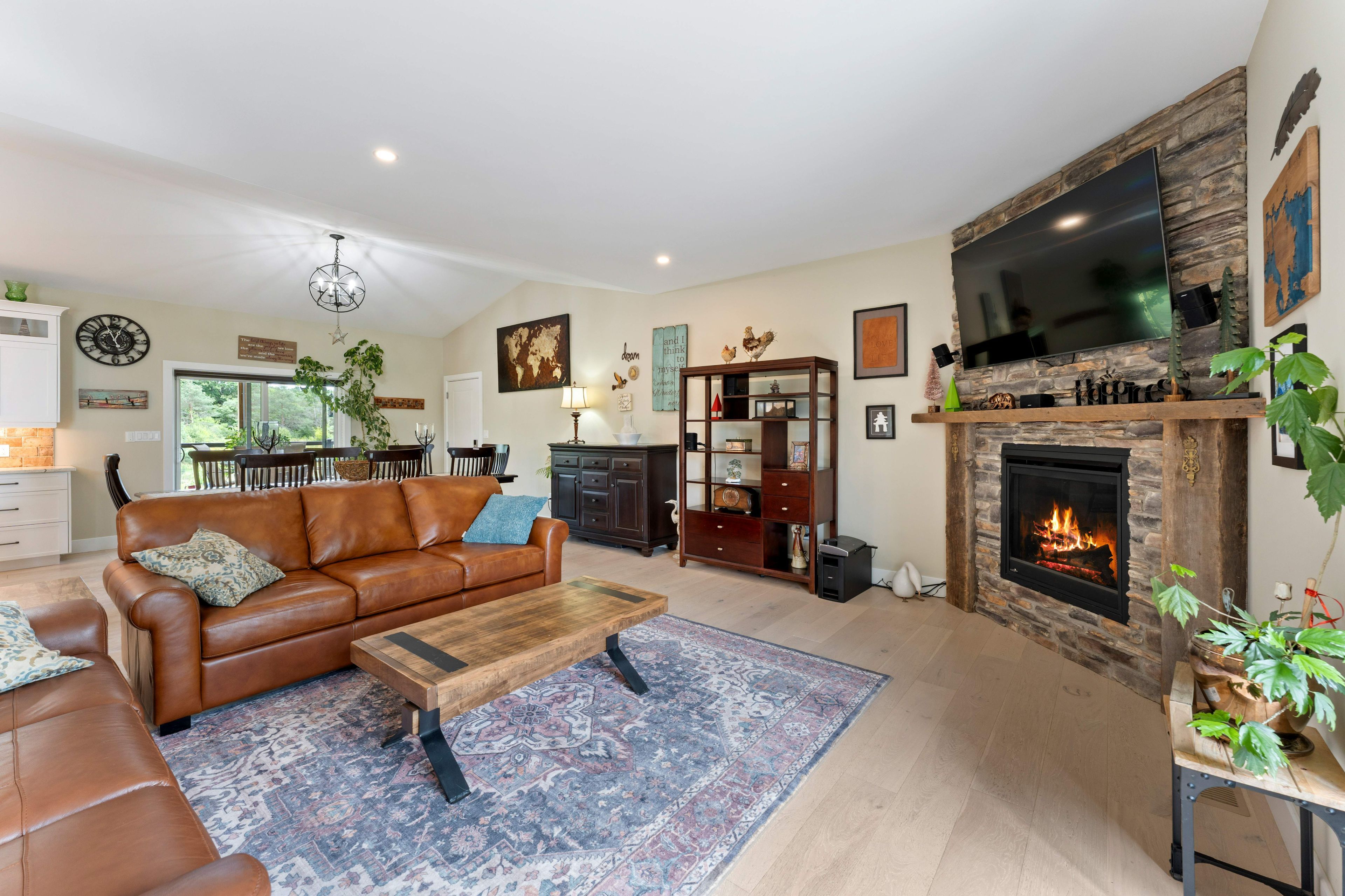 • Bright open-concept living area features a stone fireplace and beautiful views.