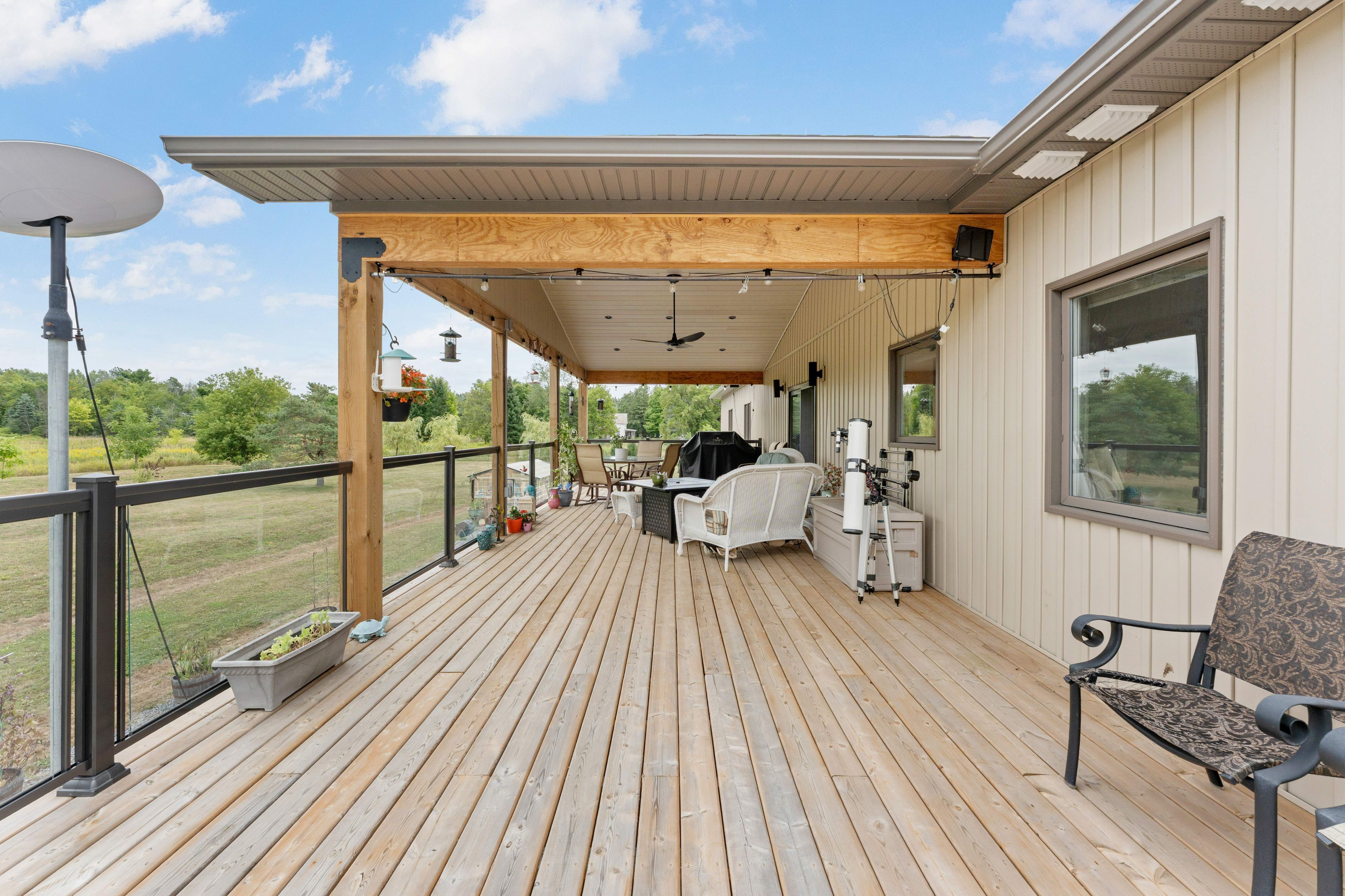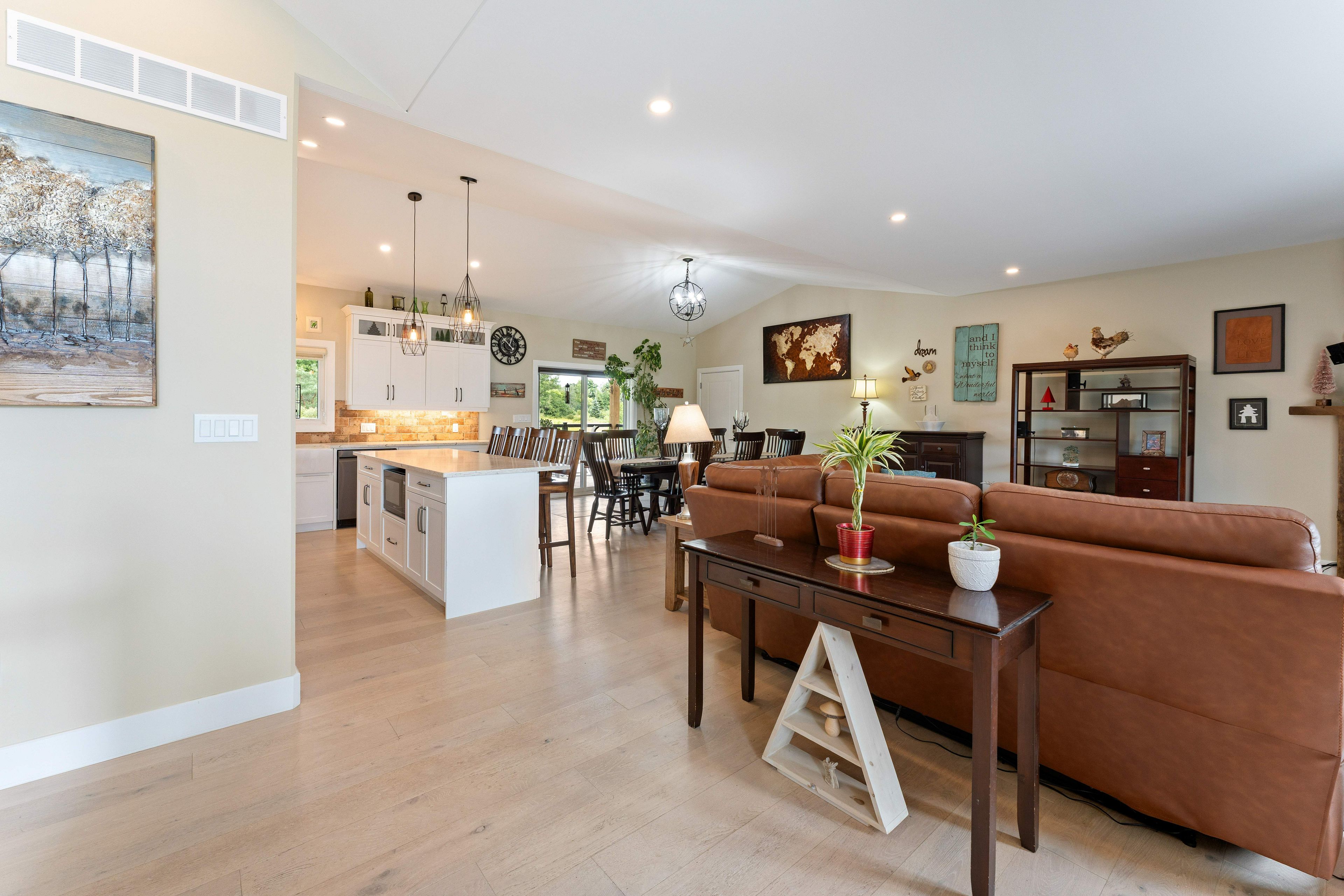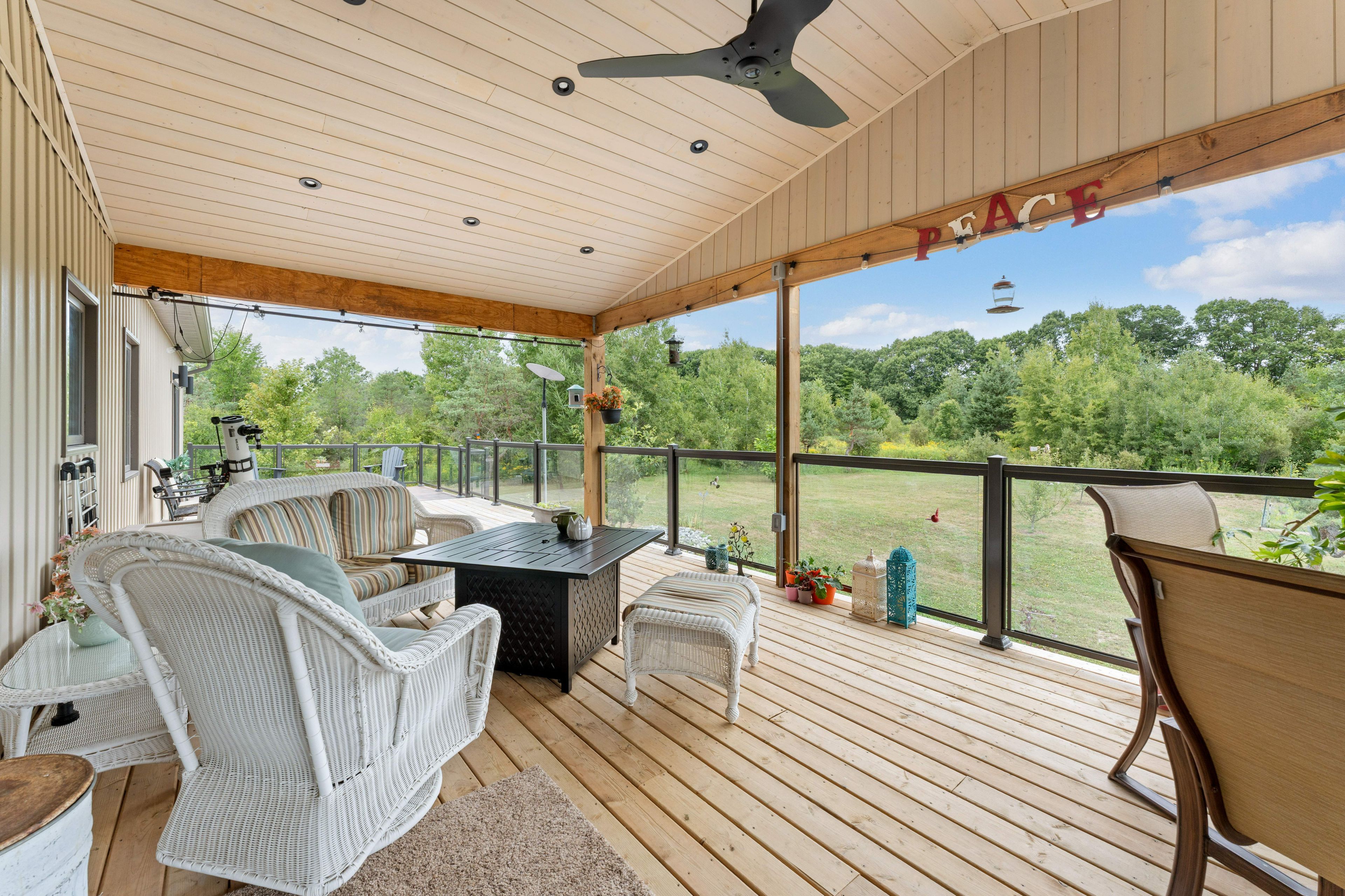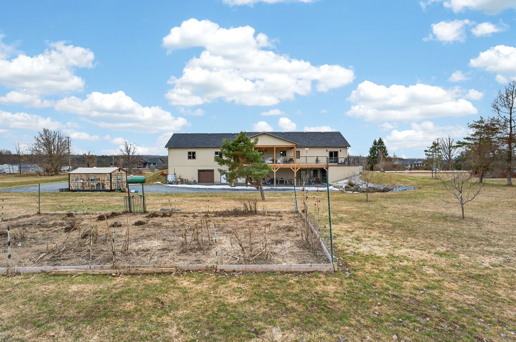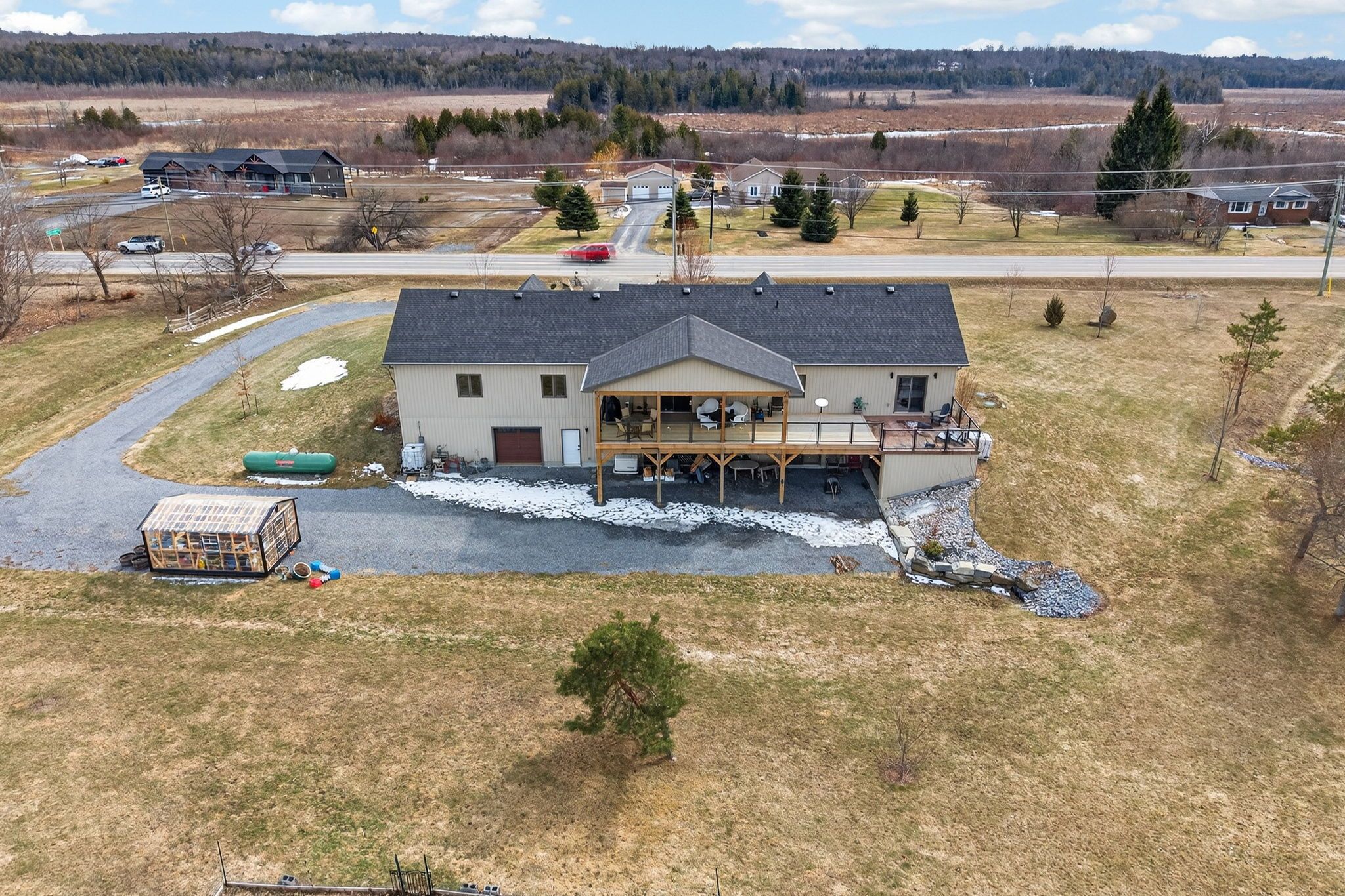 Thoughtfully designed, beautifully maintained, and upgraded throughout, this 5-year-oldbungalow offers a lifestyle as remarkable as its features. From the moment you arrive, the property's presence captivates with 3 acres of professionally landscaped grounds with trees, vibrant gardens, natural stone accents, and a 3-wide paved driveway that gracefully wraps around to the rear garage and patio. Inside, light-filled spaces blend comfort with sophistication. The open-concept main level is anchored by a stunning stone fireplace with a propane insert, creating a warm focal point in the living area. The kitchen showcases stone countertops, stainless steel appliances, and picturesque views of the private backyard. The primary suite is a retreat of its own, featuring a 4-piece ensuite with built-in vanity, walk-in closet, additional closet, and patio doors leading to a stamped-concrete balcony and an expansive 15x64' deck. A 30' section of this outdoor haven is fully covered, featuring a ceiling fan, pot lights, electrical outlets, and bbq hookup - the perfect setting for morning coffee or evening gatherings. Two additional bedrooms and a 4-piece bath complete the main level. The lower level expands the possibilities with a large rec room, spacious bedroom, a separate den/home office, a 3piece bathroom, generous storage, a walk-out to the yard, and direct access to the lower garage. This two-level heated garage with six bays finished in epoxy provides endless options for a home workshop, car collection, or recreational toys. A dedicated backyard bar room, with a wet bar, epoxy flooring and a roll-up glass garage door opens to the patio below the deck, offering a distinctive venue for year-round entertaining. A 20kw generac generator ensures peace of mind in all seasons. Positioned between harrowsmith and sydenham, this home combines the tranquility of rural living with access to local amenities and only 20 minutes to kingston.