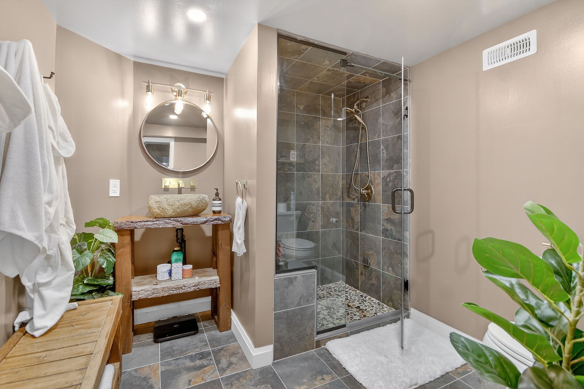 • Spacious bedrooms and a luxurious bathroom with a steam shower upstairs.
