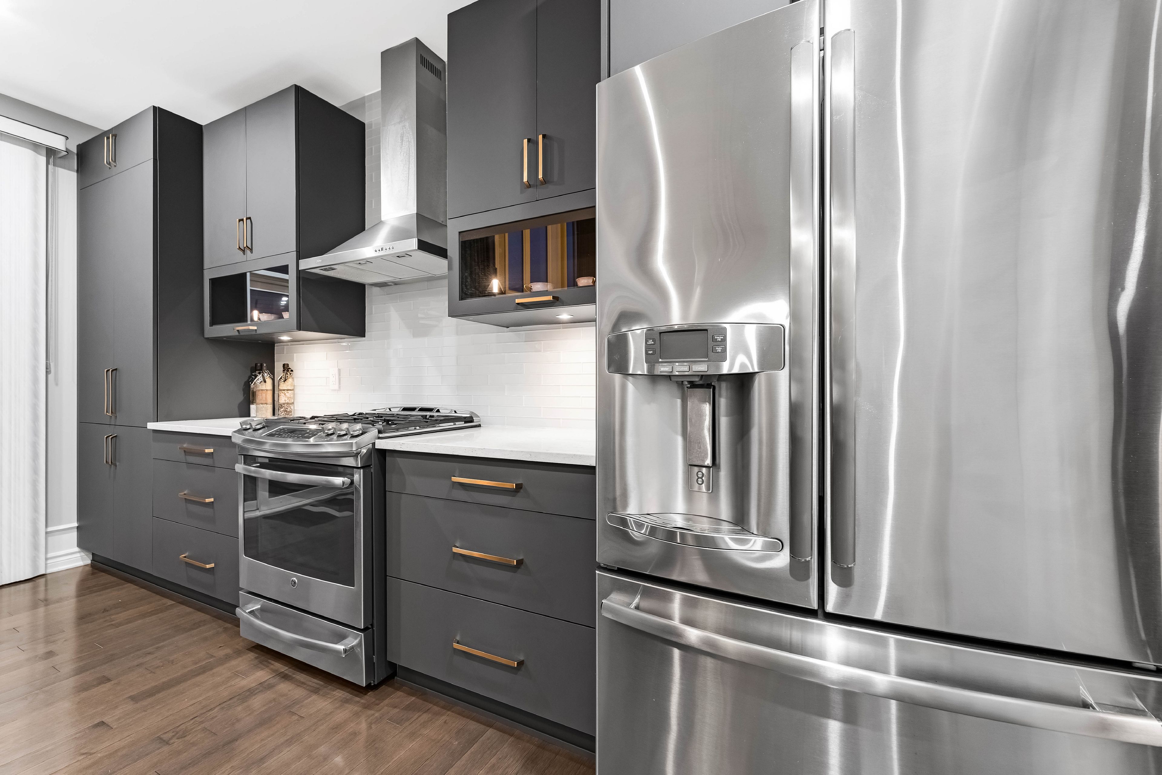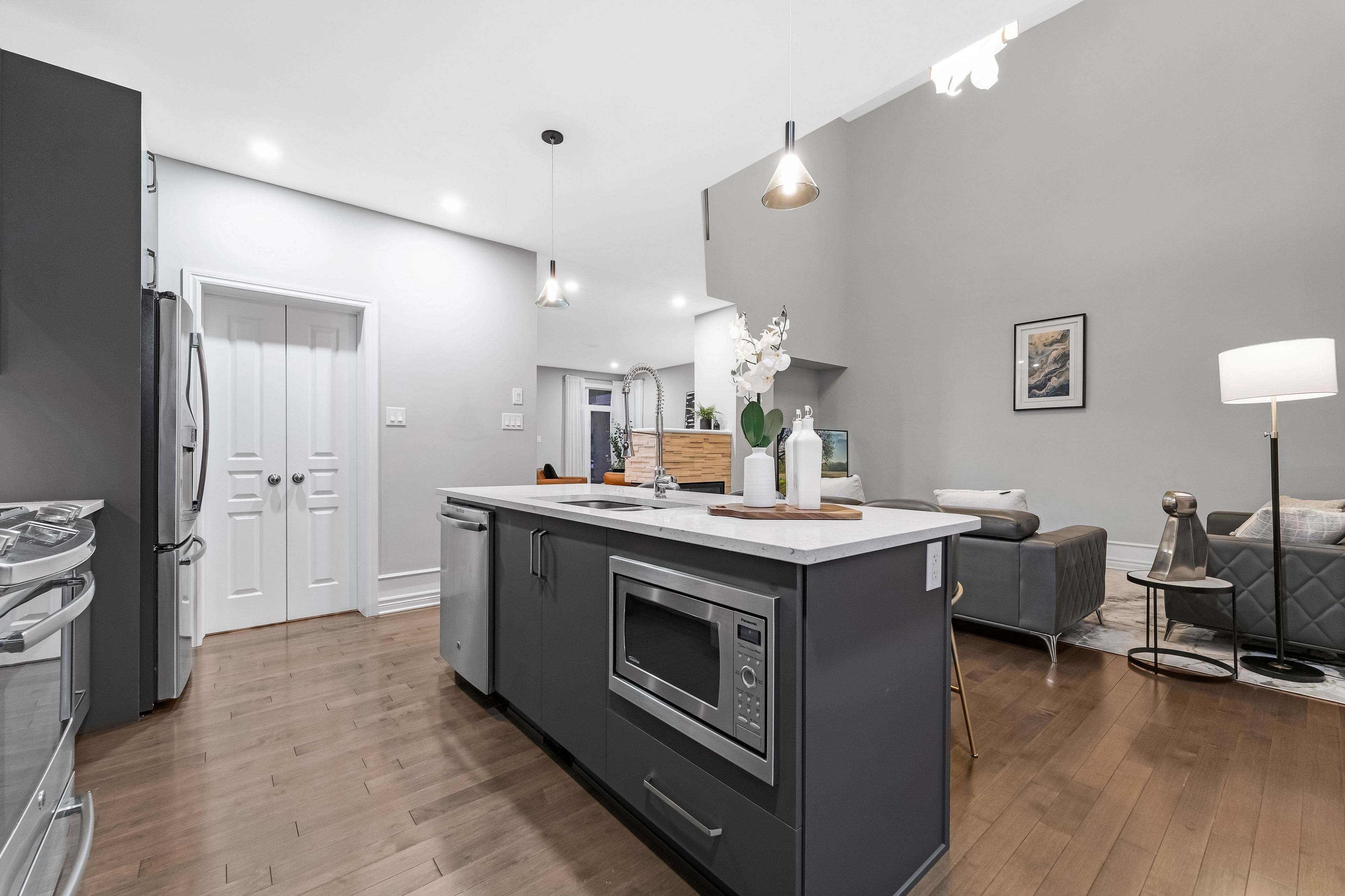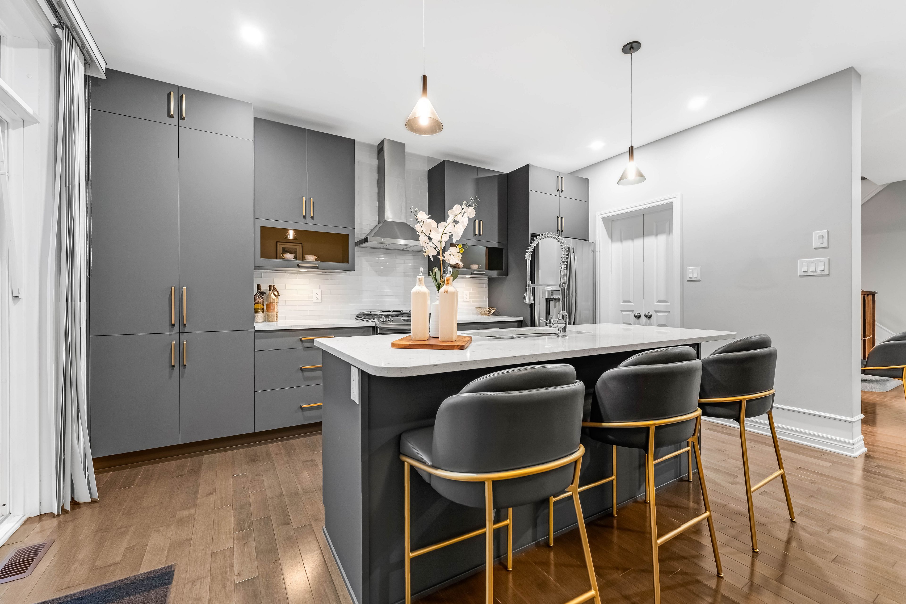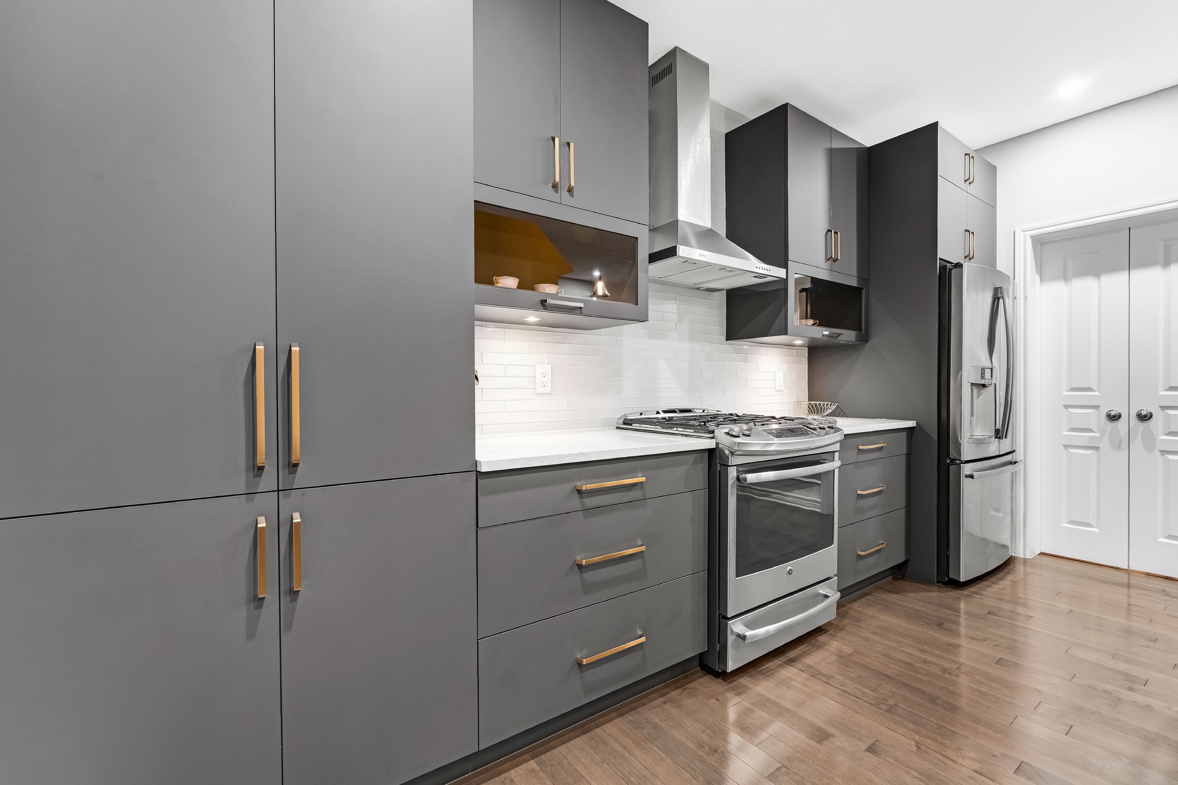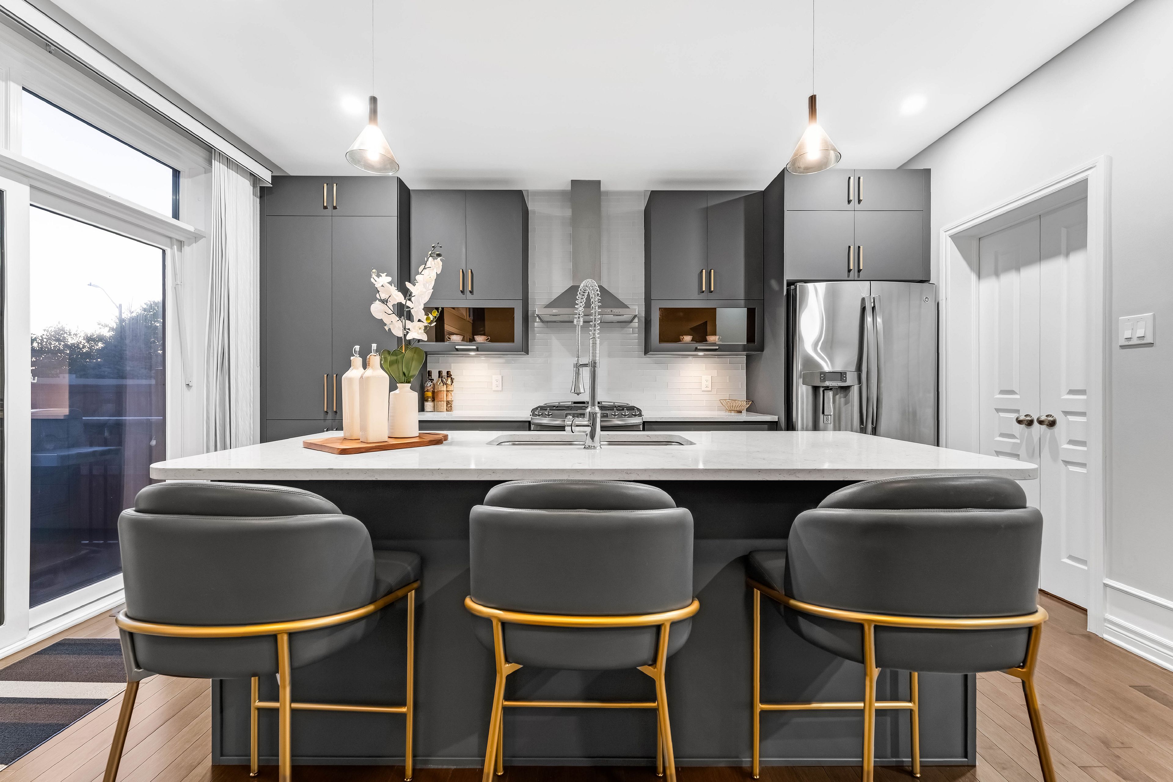 • Gourmet chef's kitchen with premium cabinetry, quartz counters, and gas range.