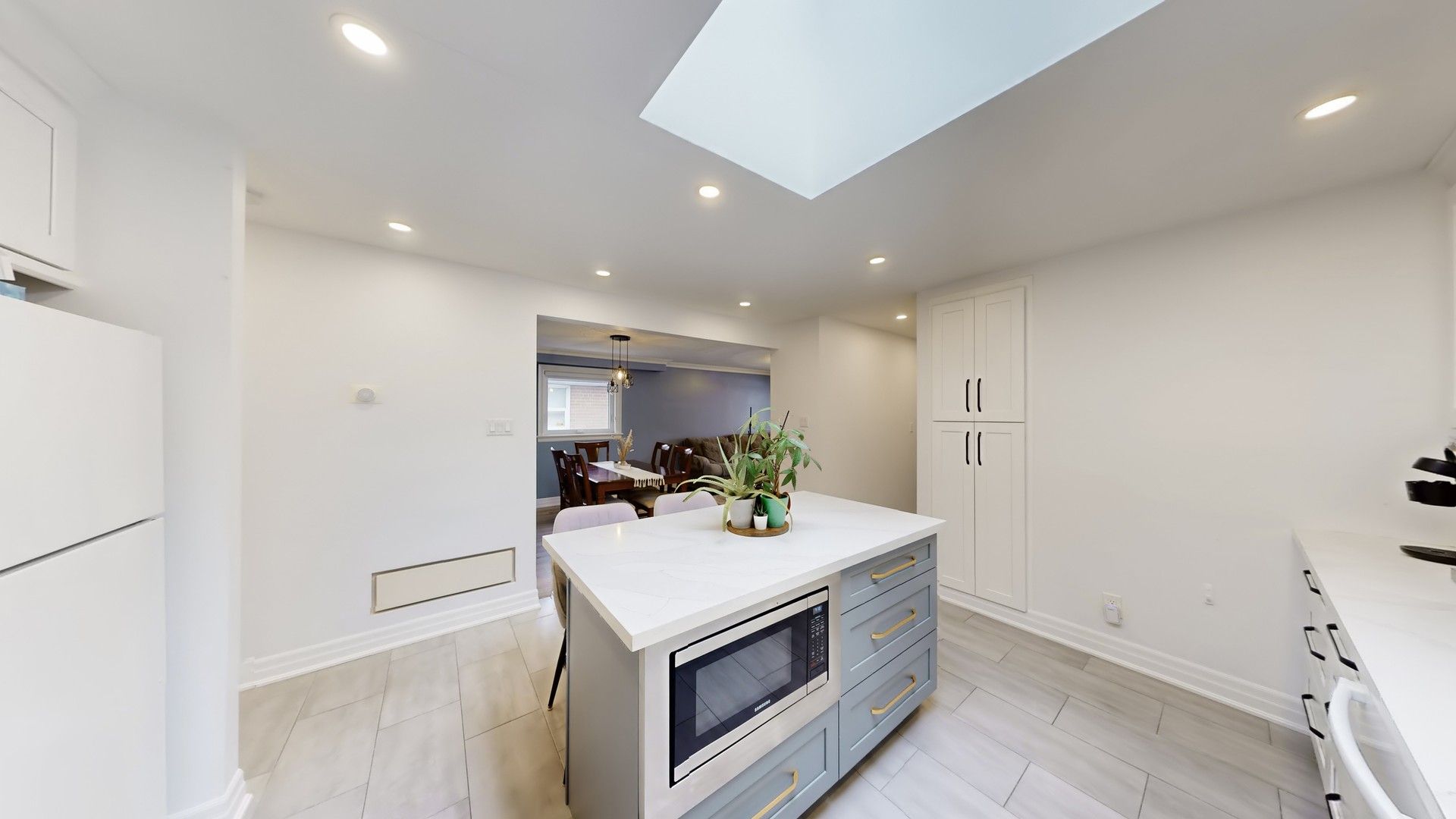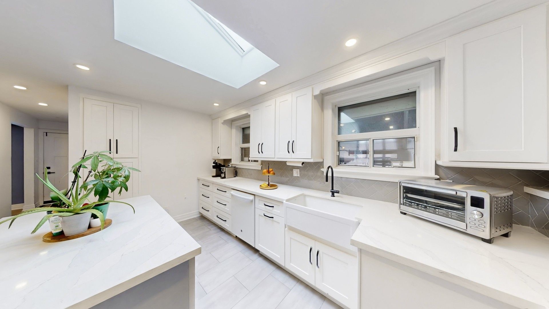 • Updated family-sized kitchen with quartz countertops and a skylight.