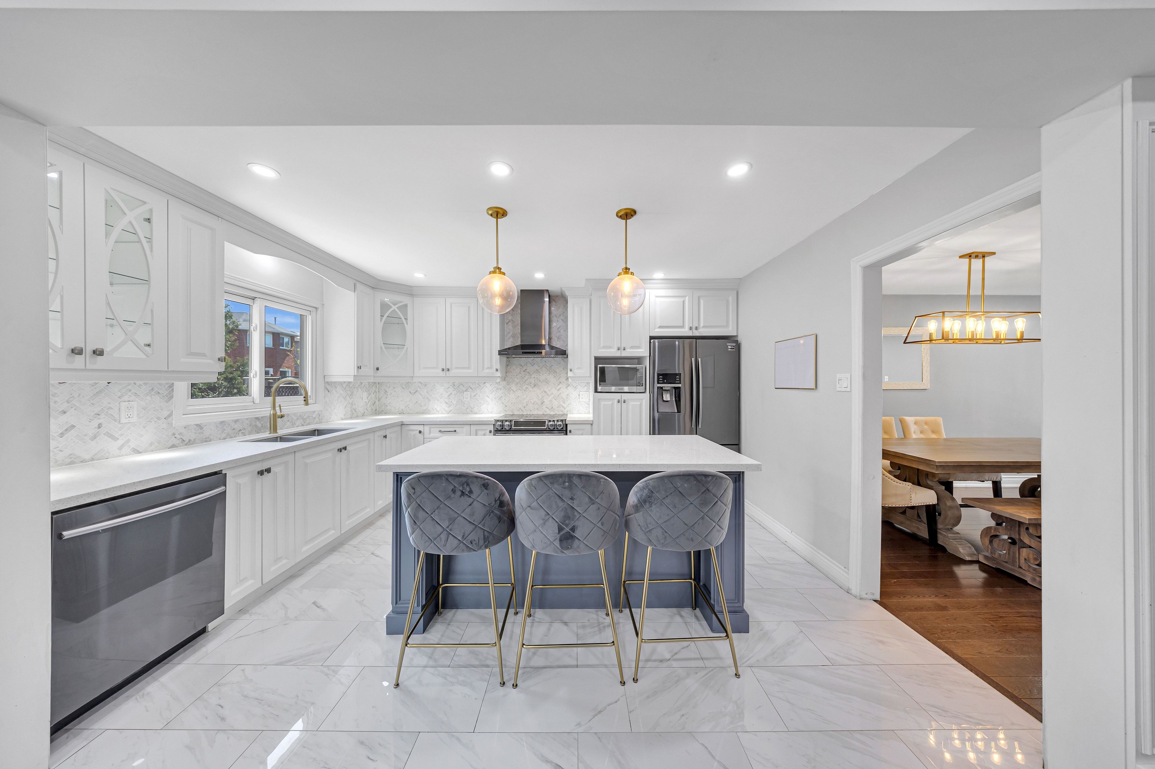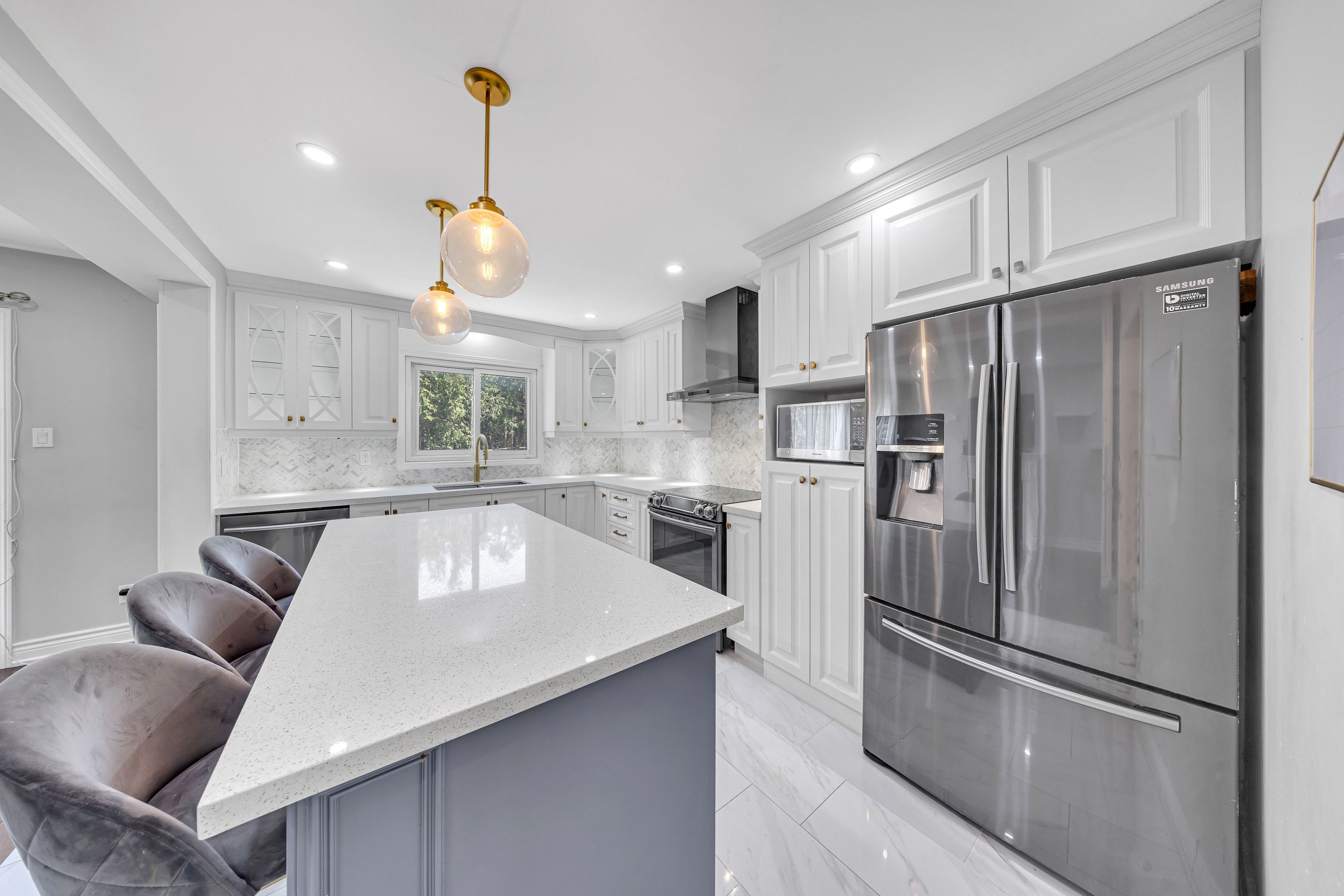• Updated kitchen with quartz countertops and custom breakfast bar for entertaining.