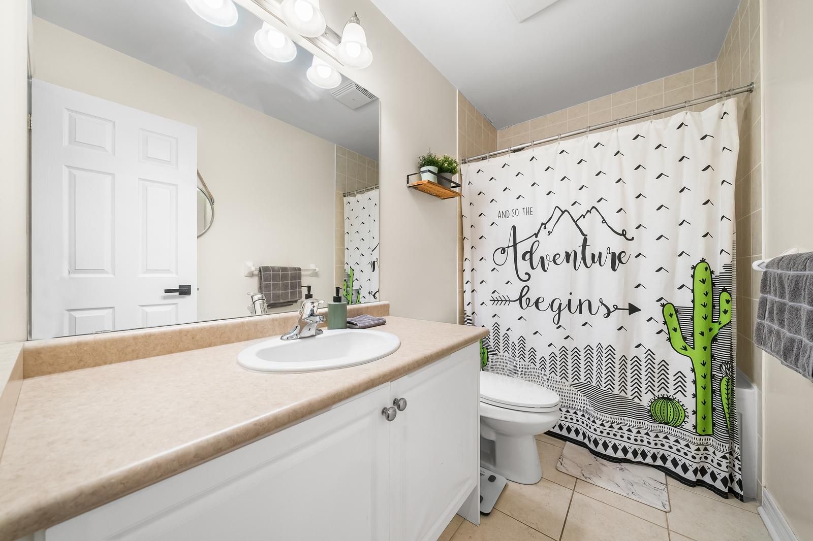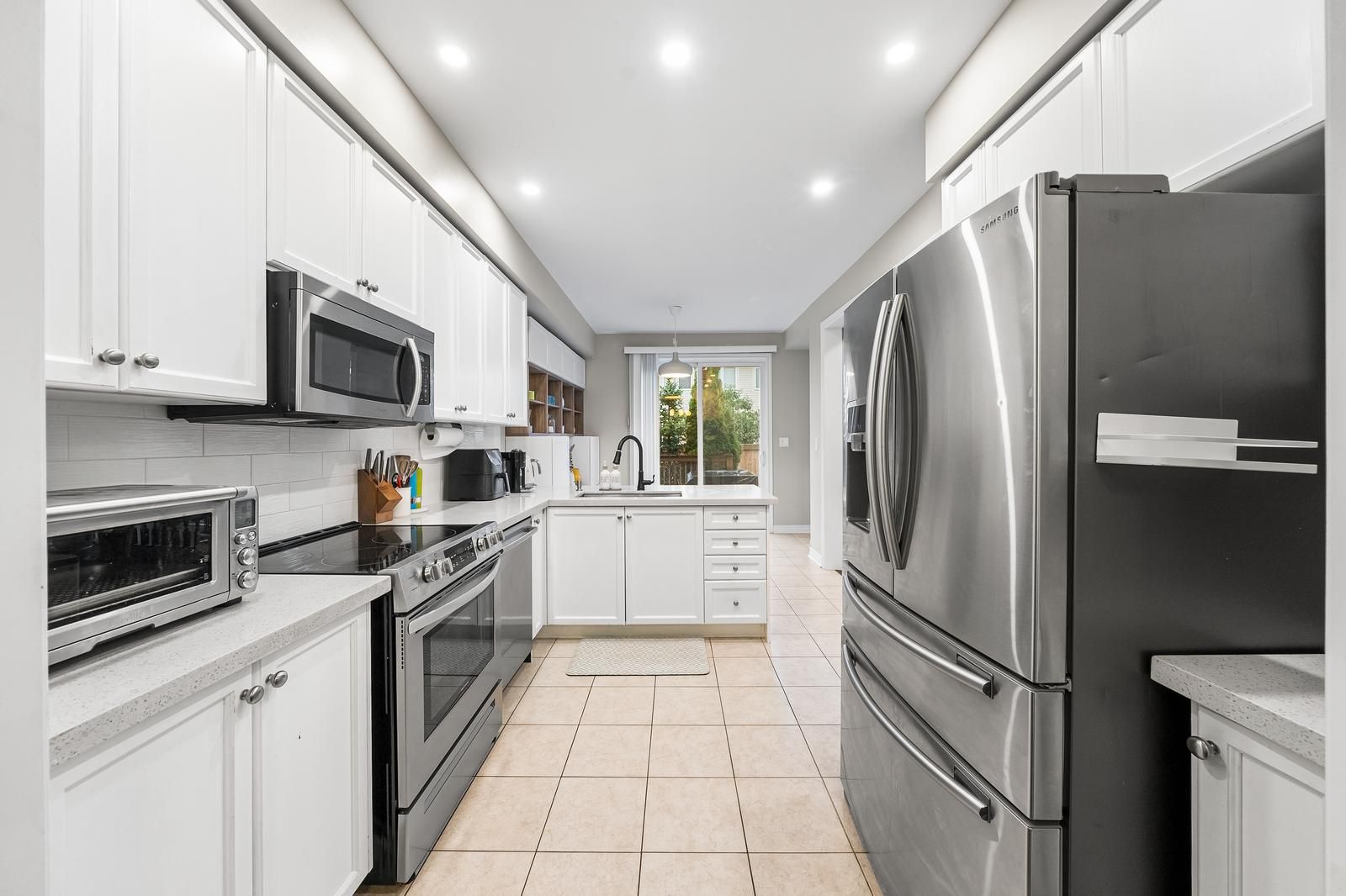 • Modern kitchen features stainless steel appliances and quartz countertops for convenience.