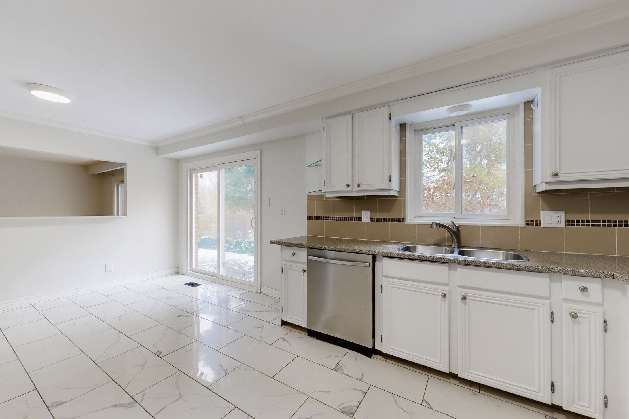 • Bright kitchen with breakfast area and large family room with fireplace.