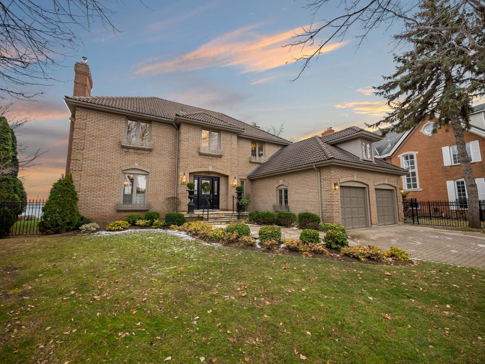 Spectacular lakefront property with 93' frontage on lake ontario. Located on a quiet, mature cul-de-sac, this custom built, family home offers 4+1 bedrooms, 3. 5 baths with over 2800sf above-grade + 1400 sf finished lower level. Architecturally designed with wall-to-wall windows overlooking the lake, solid brick construction with clay tile roofing, this home was built to last. 9' and 10' ceilings on the main floor. Oak hardwood floors throughout both levels. Grand entrance foyer with oak staircase. Beautiful living room with fabulous marble fireplace surround with gas insert open to dining room with wall to wall patio doors to the terrace with incredible lake views. Fabulous kitchen/breakfast room is a blank canvas with the perfect space to install the waterfront kitchen of your dreams. Walk-outs to both decks and open to the the family room with stunning marble fireplace with gas insert. The main floor features a mudroom with side entry and inside entry from full-sized two-car garage. The primary suite features oversized windows and a walk-out to second floor balcony with outstanding lake views, luxury ensuite bathroom and walk-in closet. Two more bedrooms overlook the lake with oversized windows. The front bedroom opens to a bonus room above the garage which could be handy as a den or quiet retreat. The lower level has excellent ceilings height, good windows and features one bedroom, a 3-piece bathroom, recreation room, den, laundry room, storage and more. Beautifully landscaped and maintained property fully fenced with wrought iron gate access to the lake. Cobblestone driveway accommodates 4 cars. Outstanding value on lake ontario. A must see!