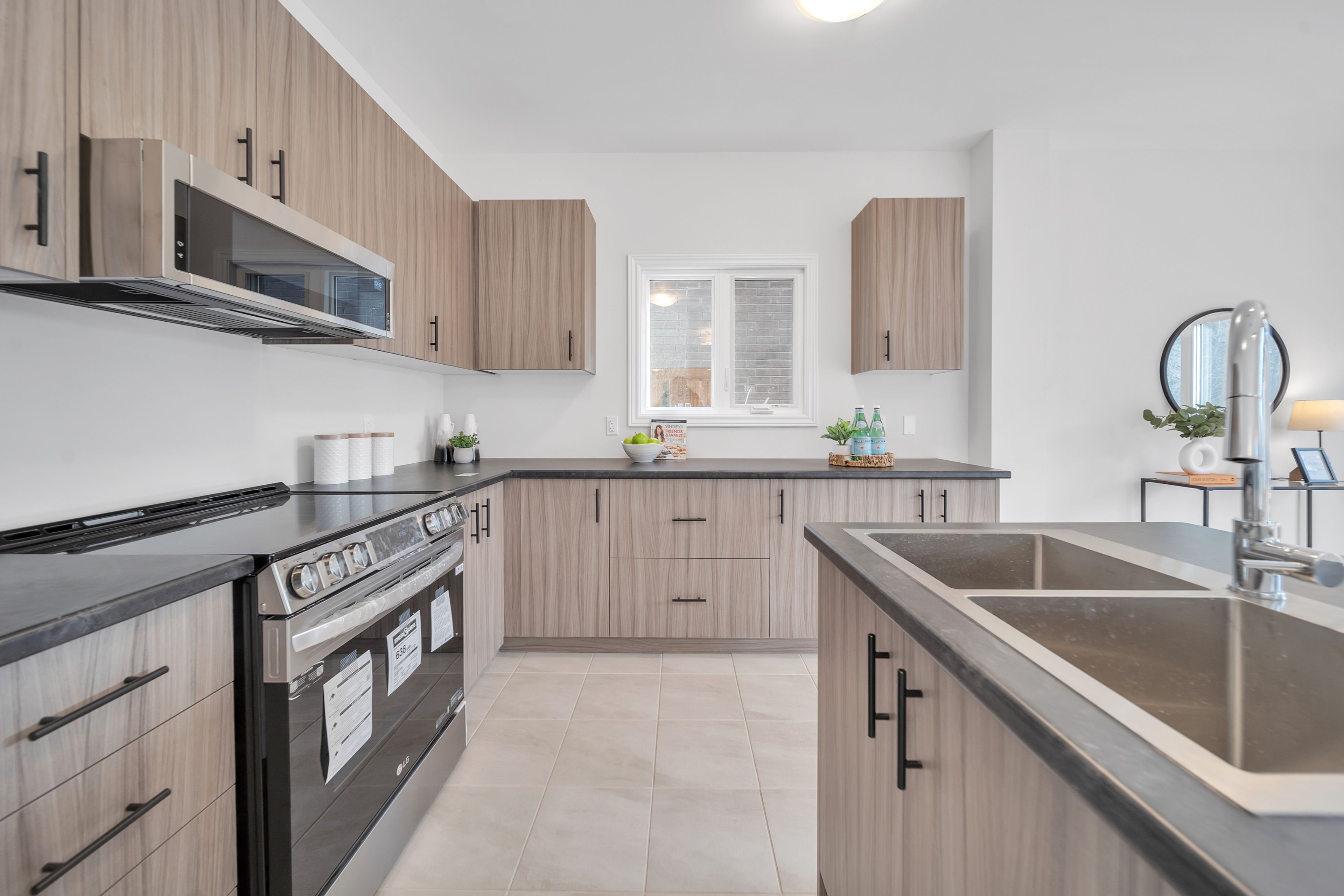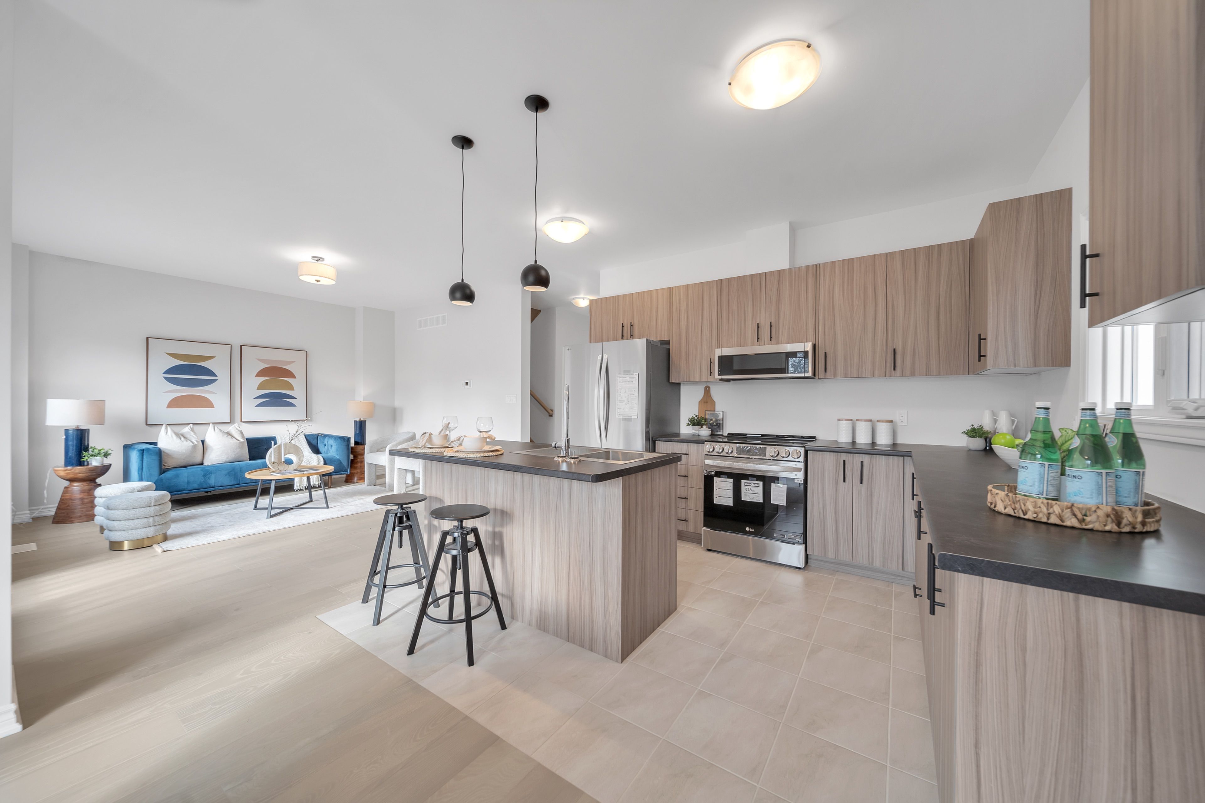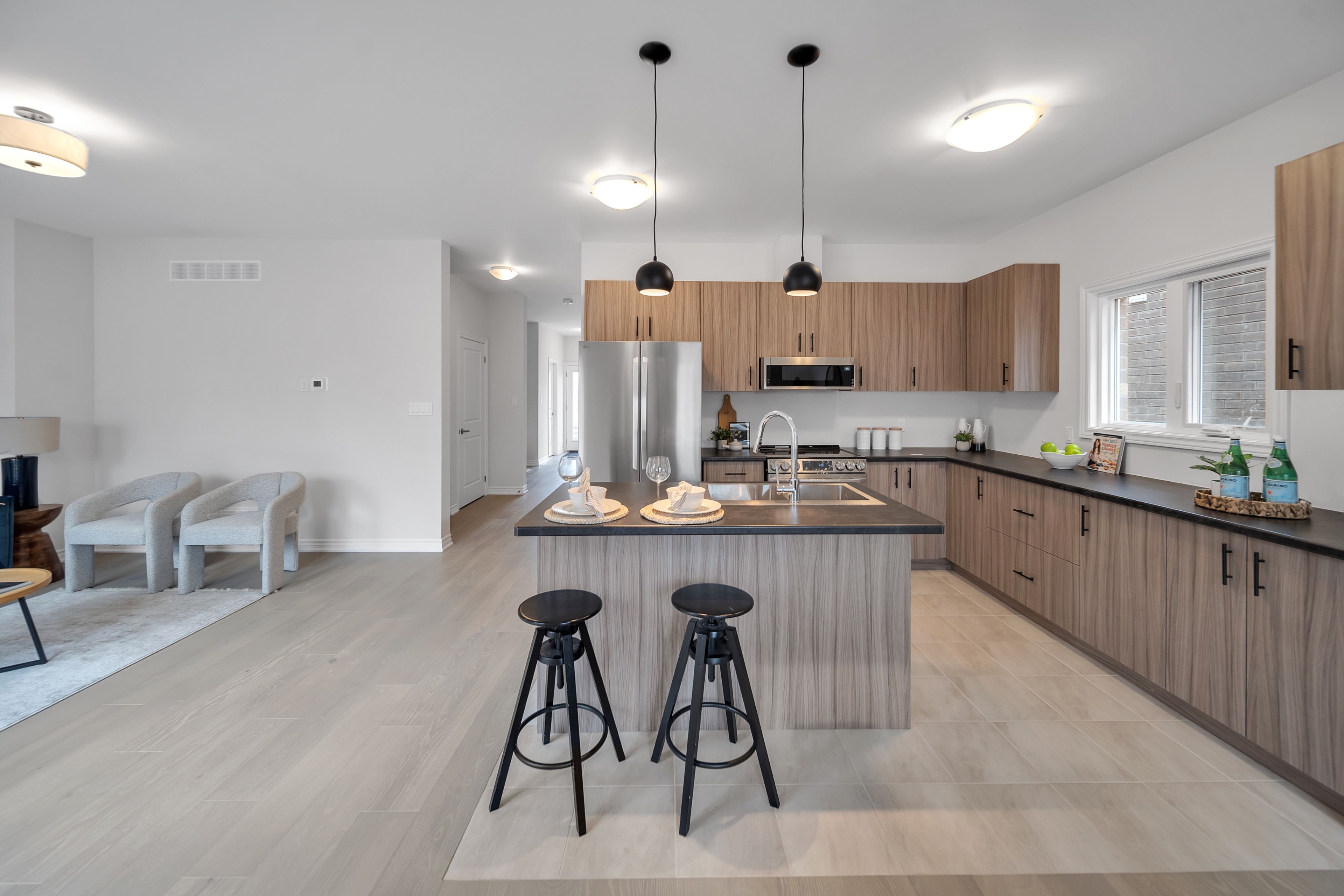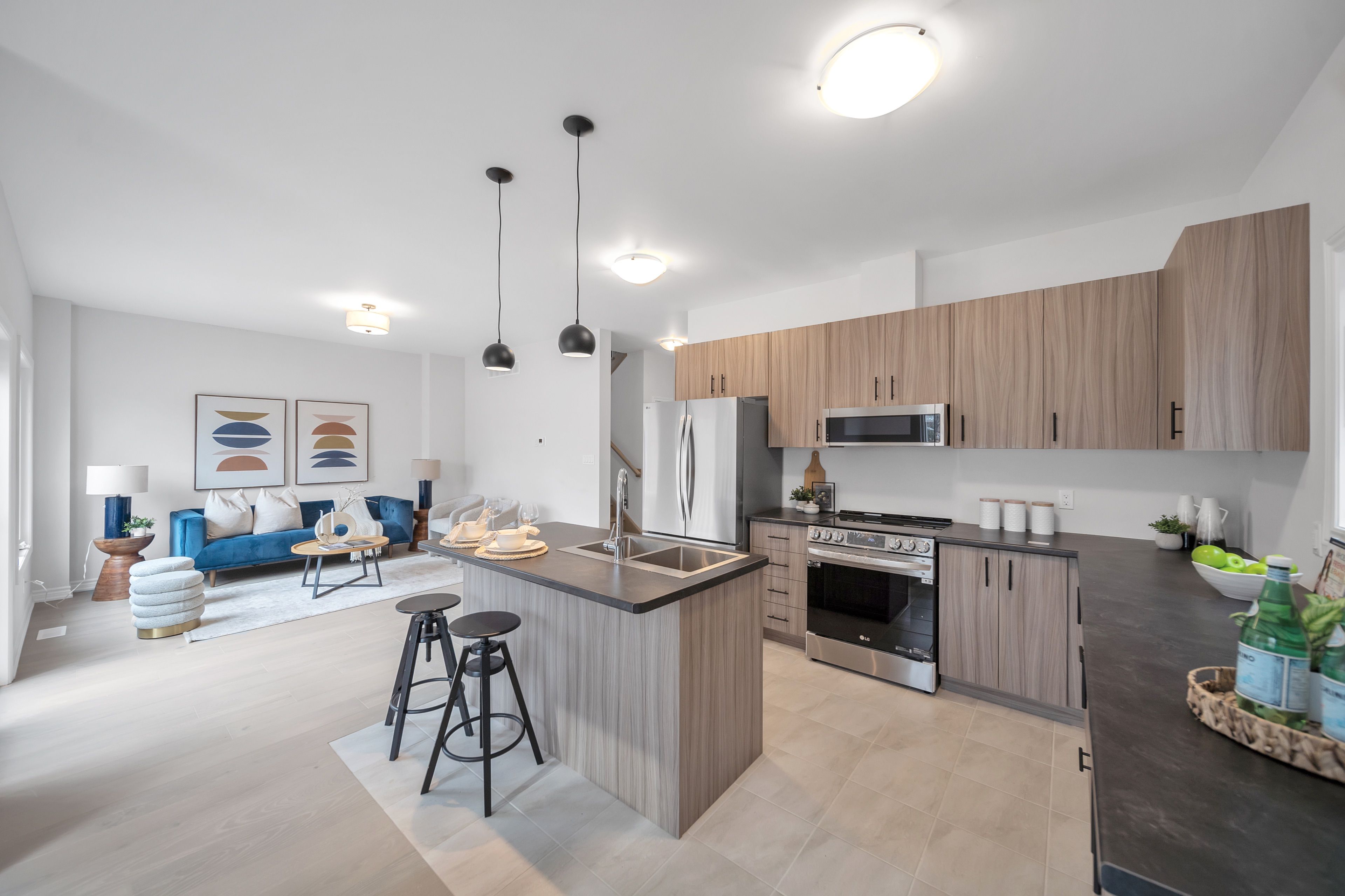 • Modern kitchen with stainless steel appliances and breakfast bar.
