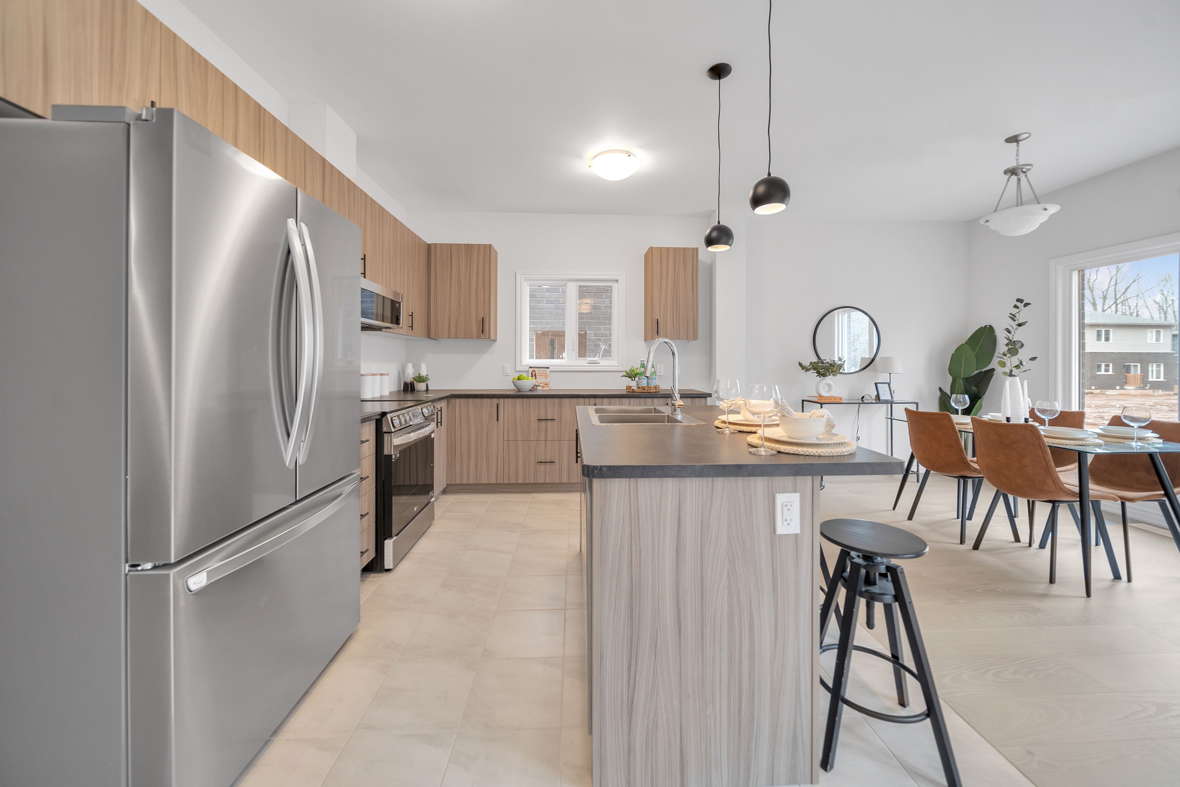 • Modern kitchen with stainless steel appliances and breakfast bar.