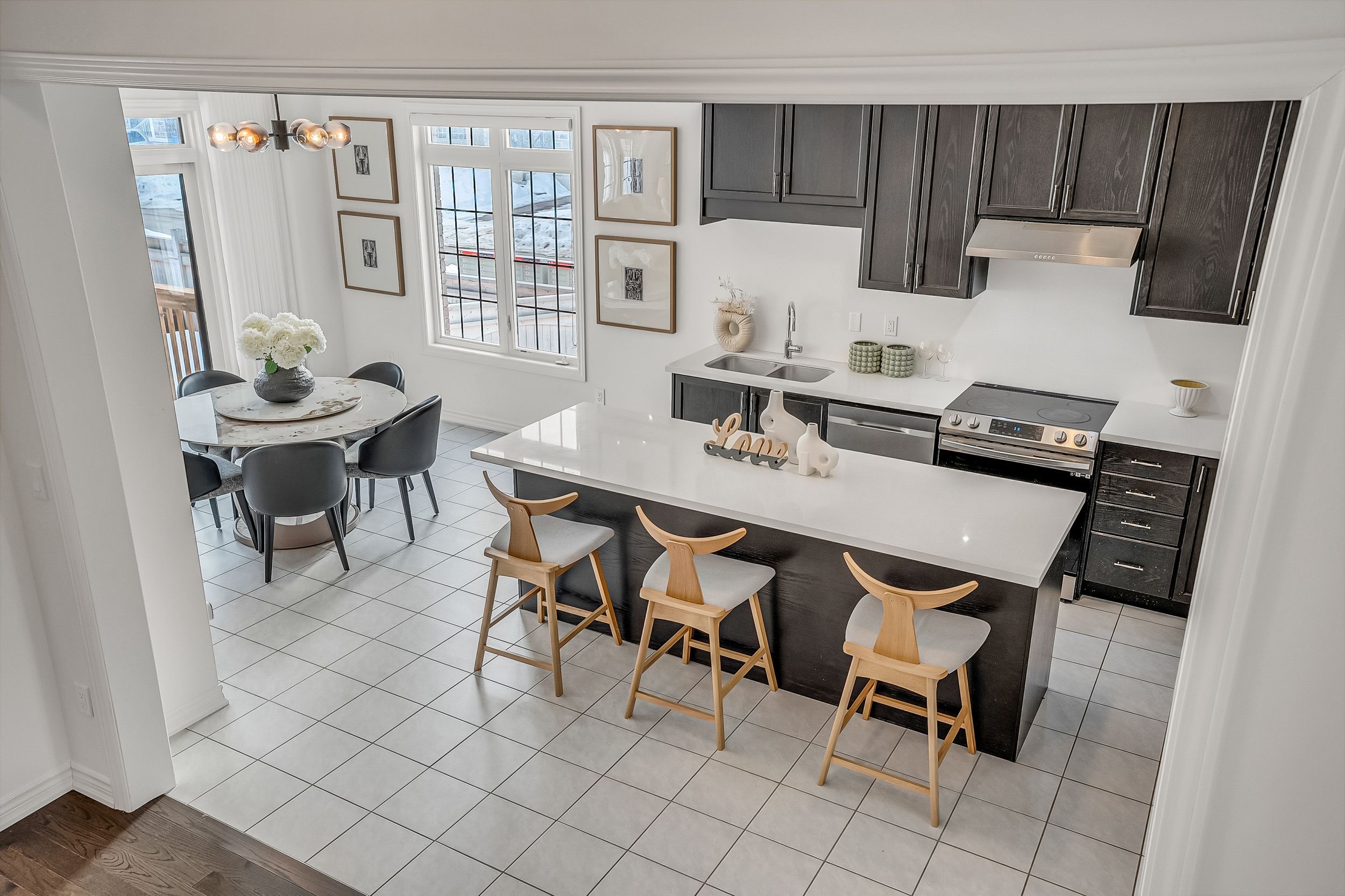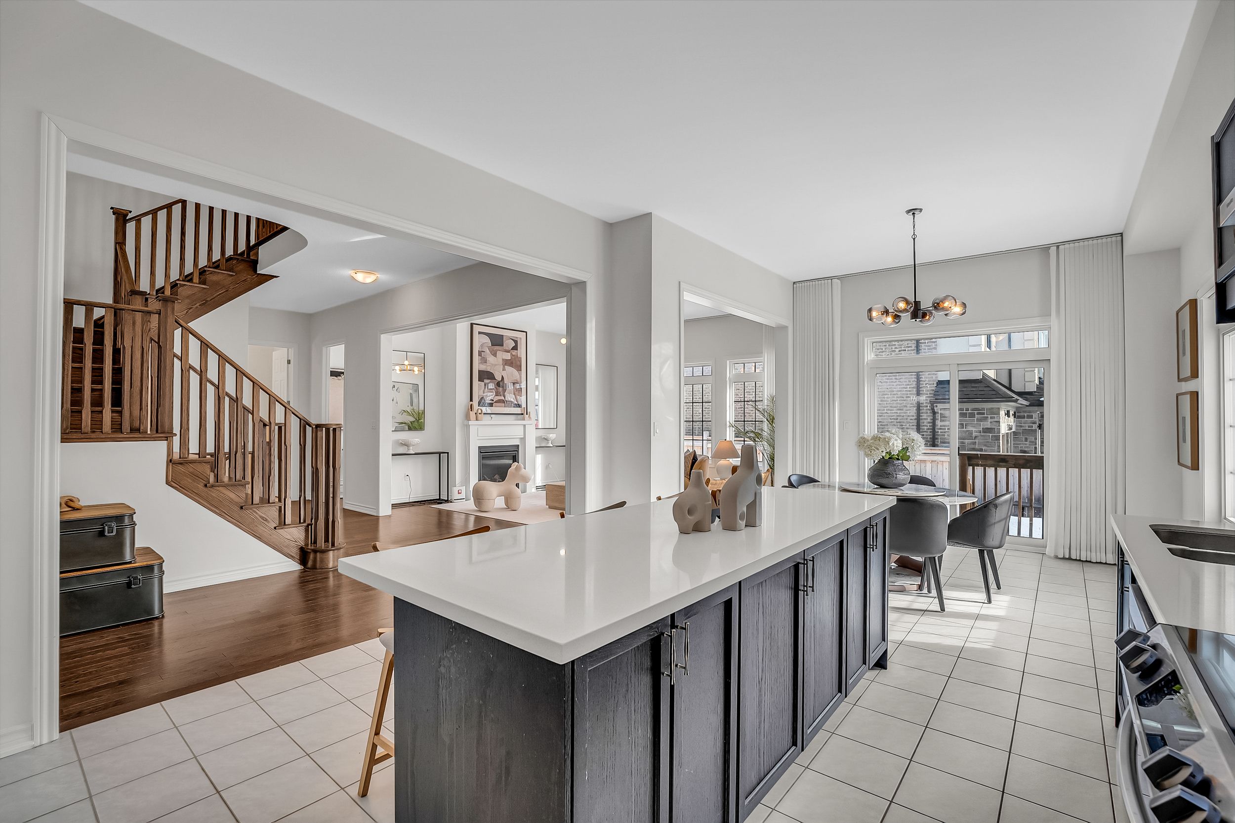 • Open-concept kitchen with marble countertops and a large island.