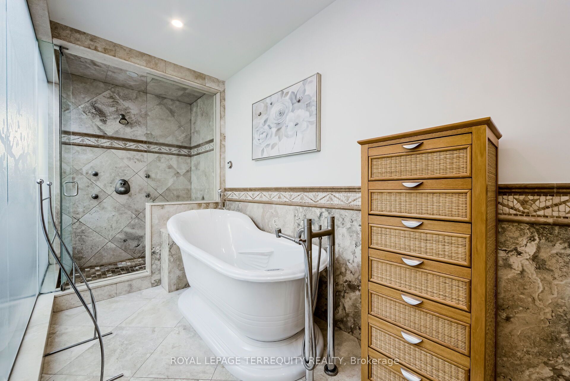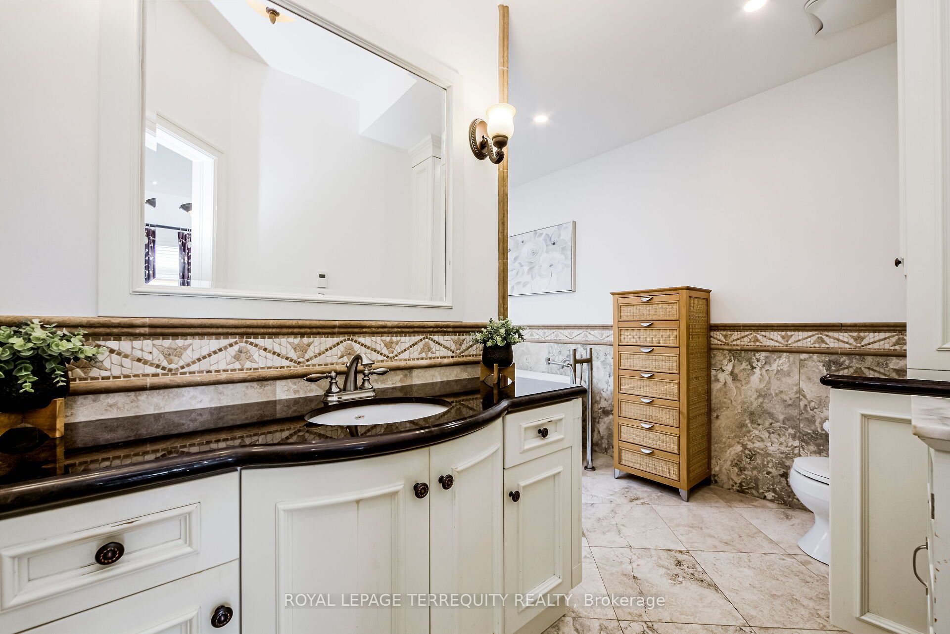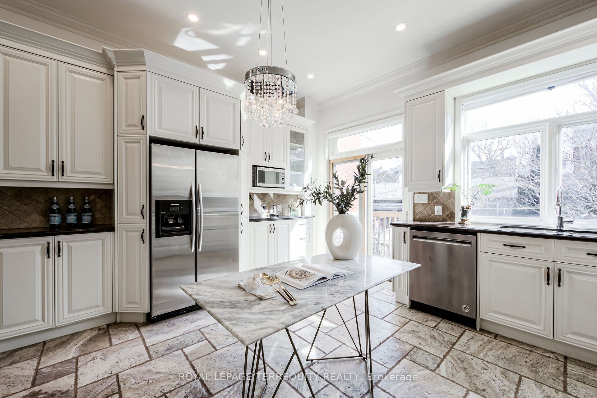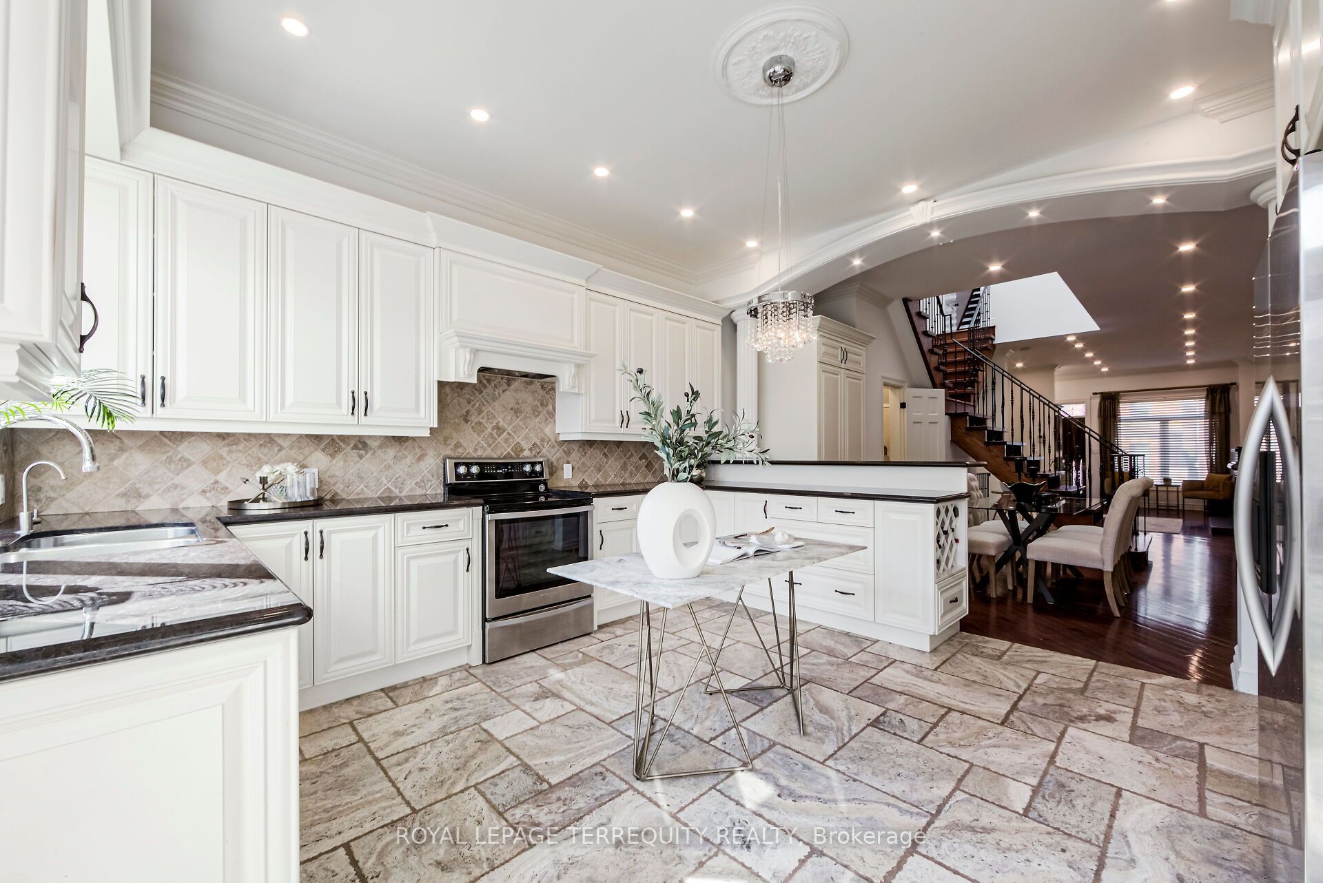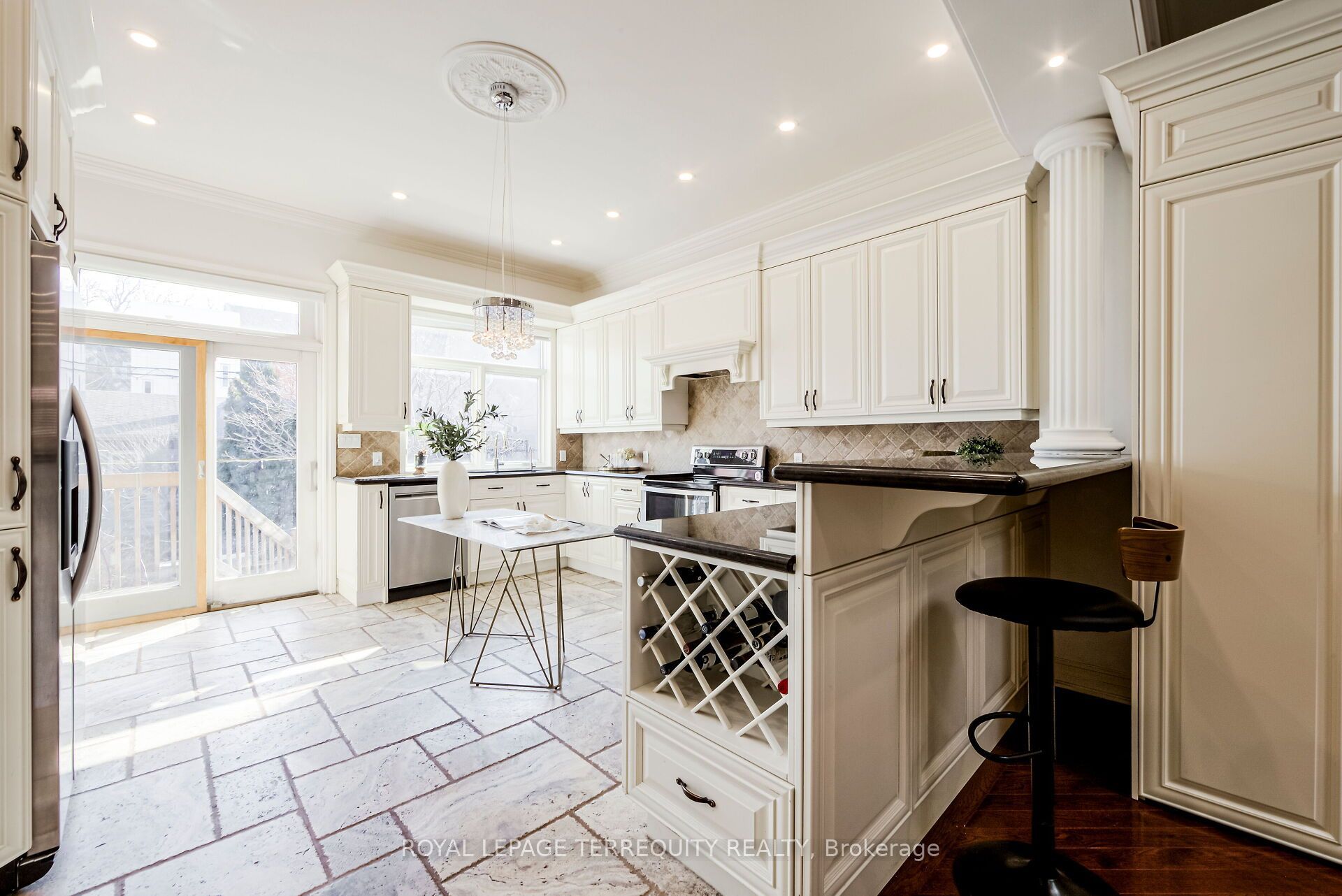 • Gourmet kitchen with stone flooring and walkout to a landscaped backyard.