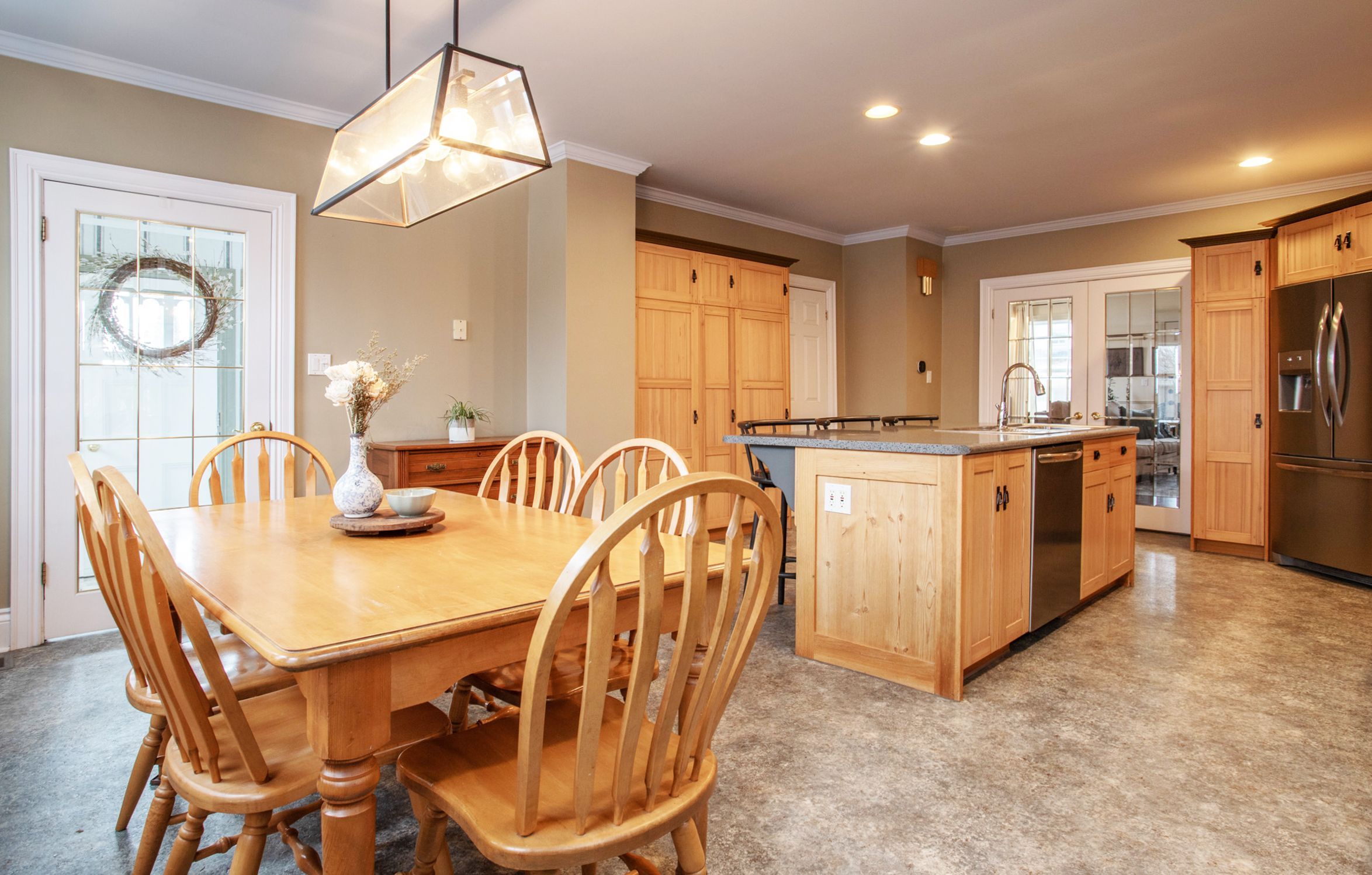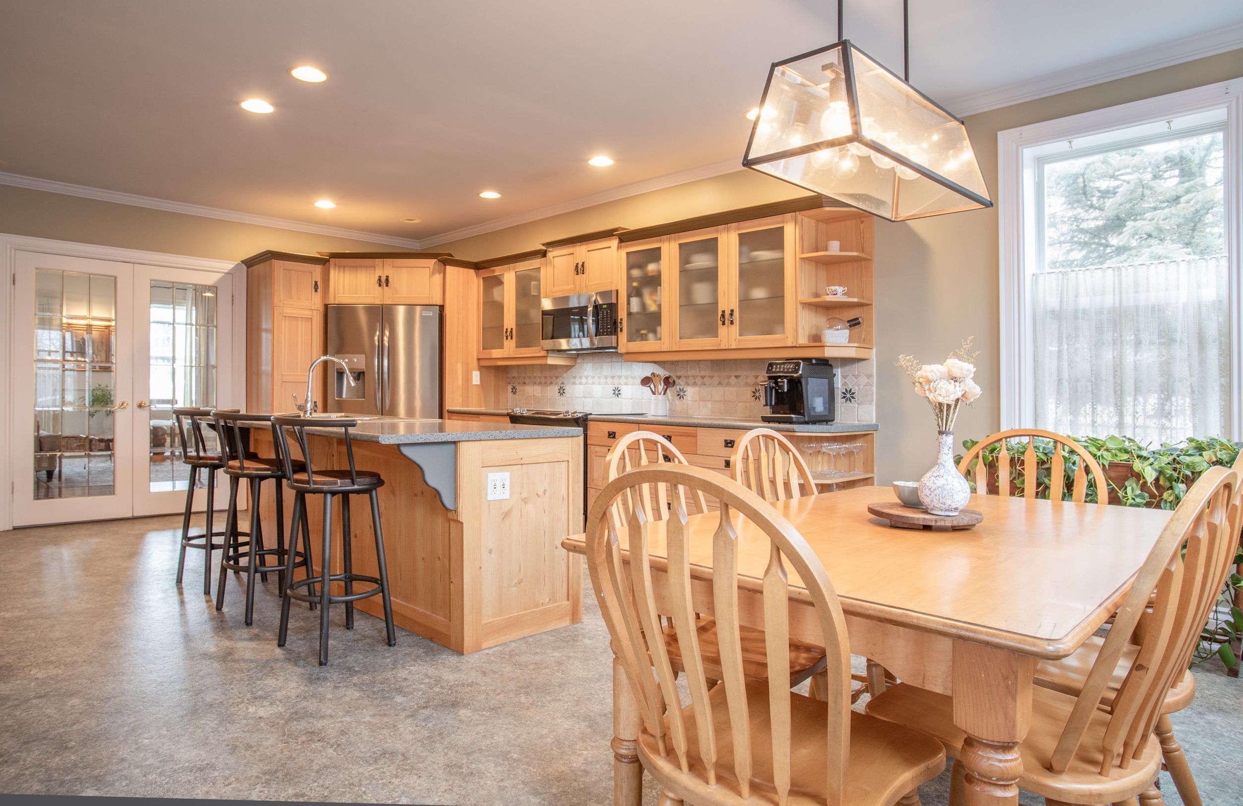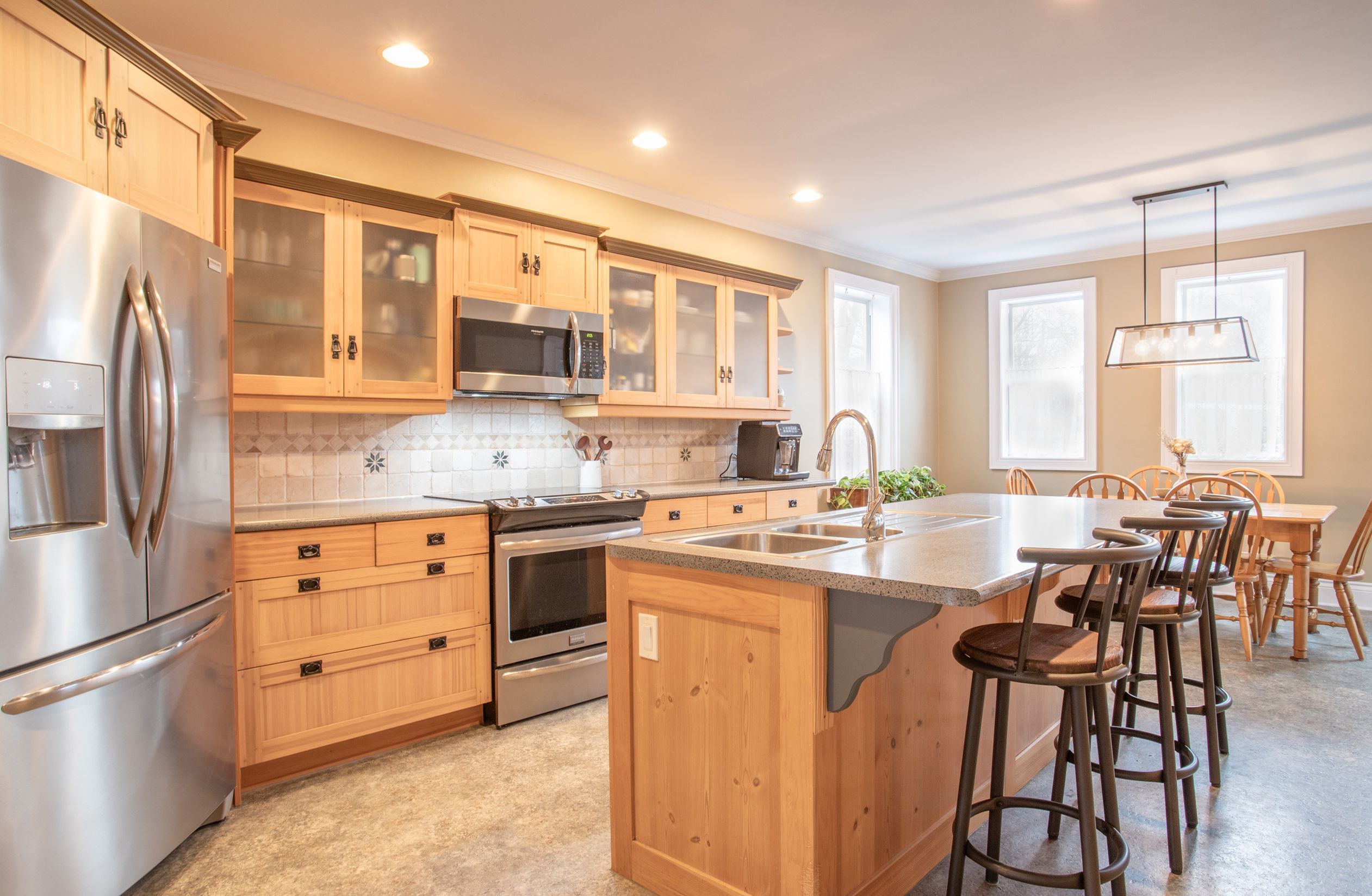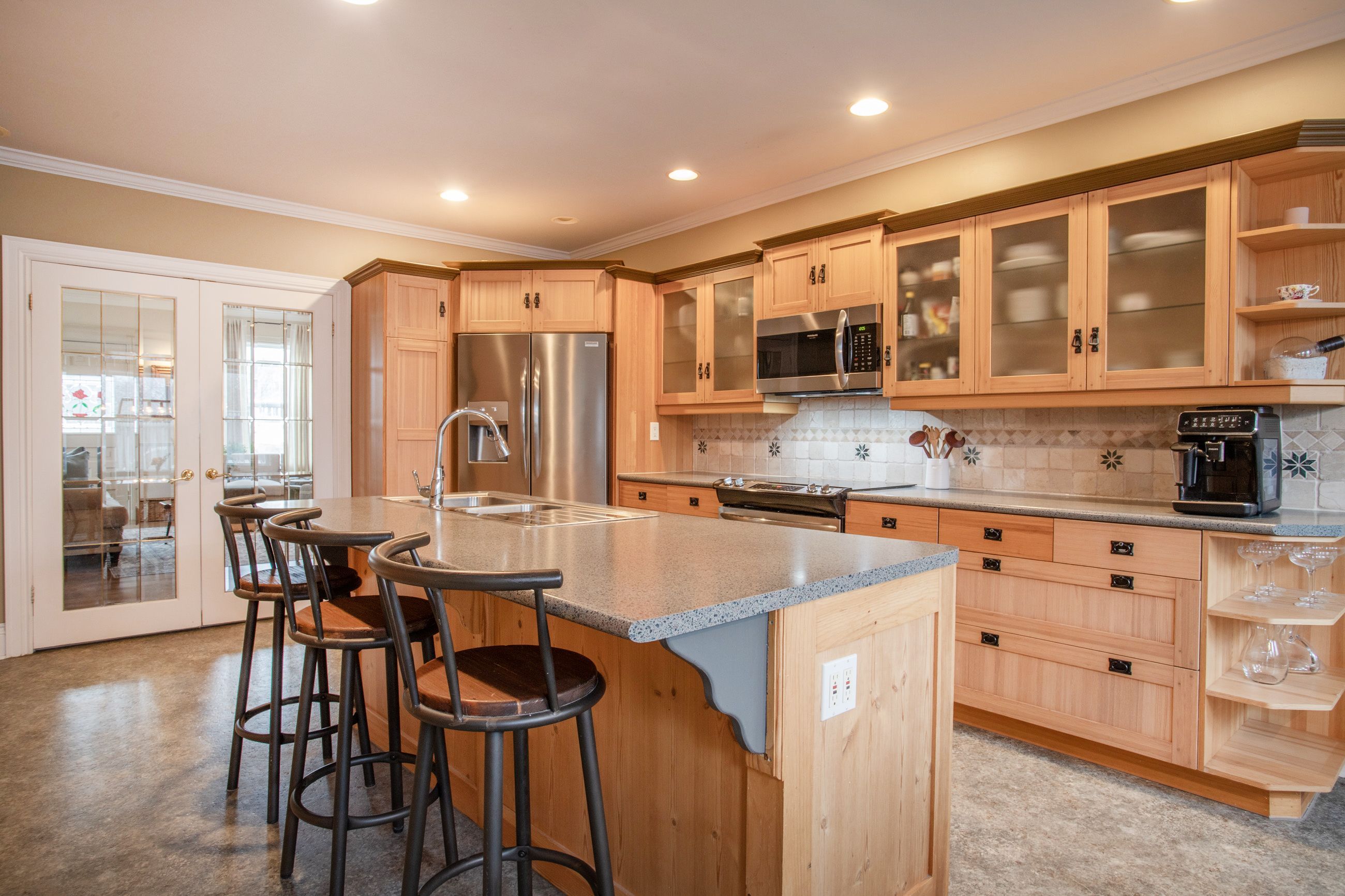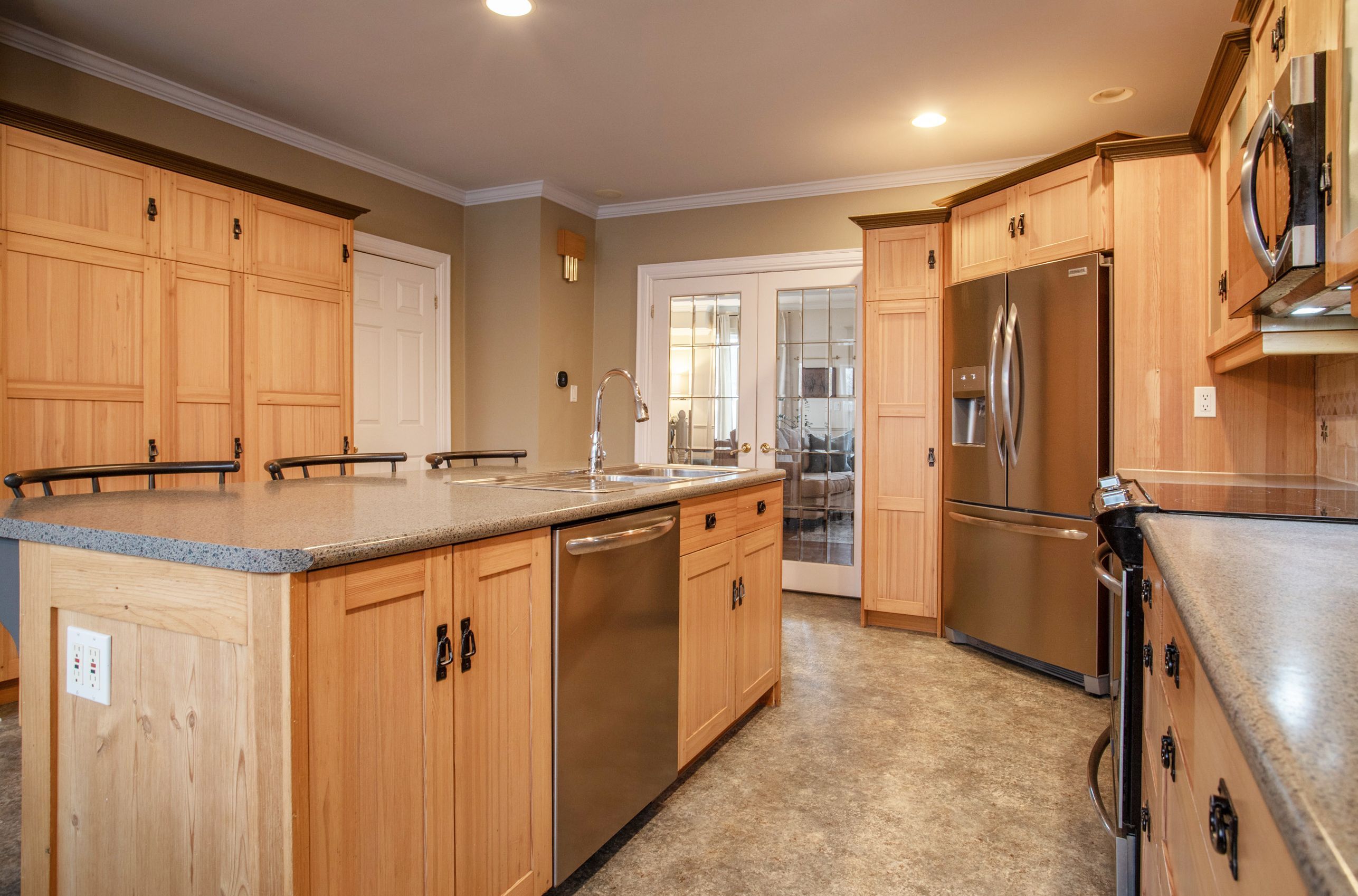 • Updated gourmet kitchen featuring stainless steel appliances and center island.