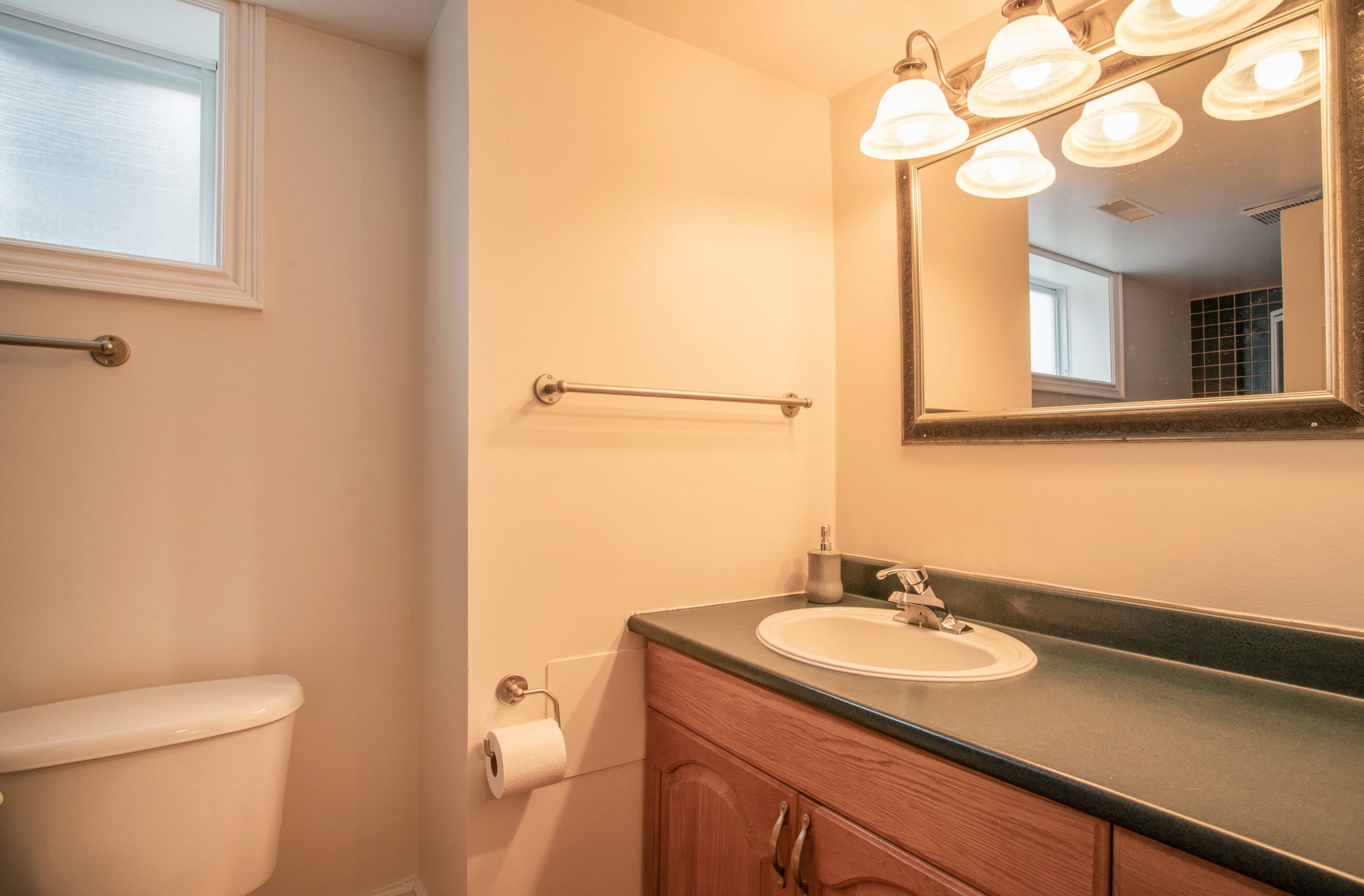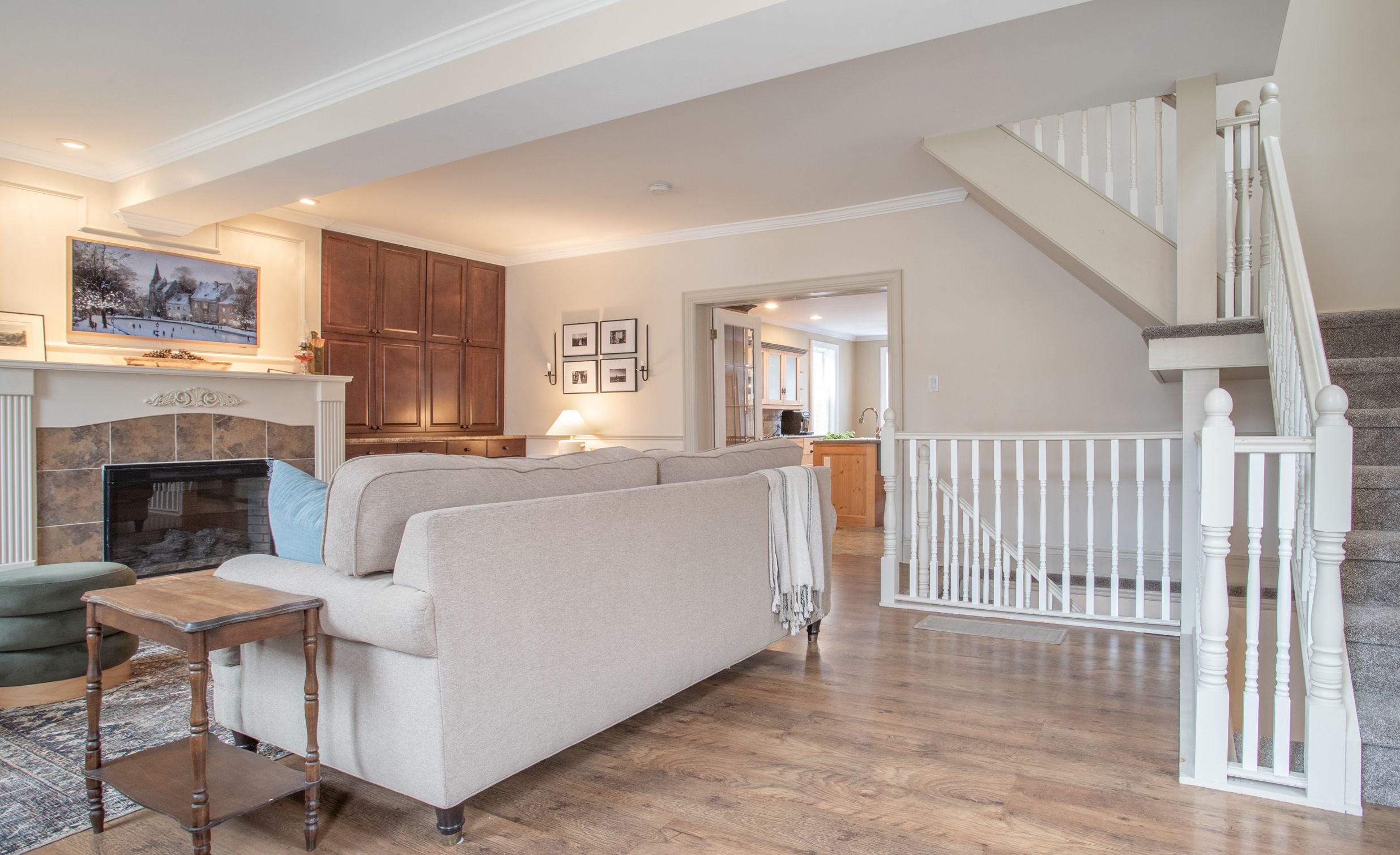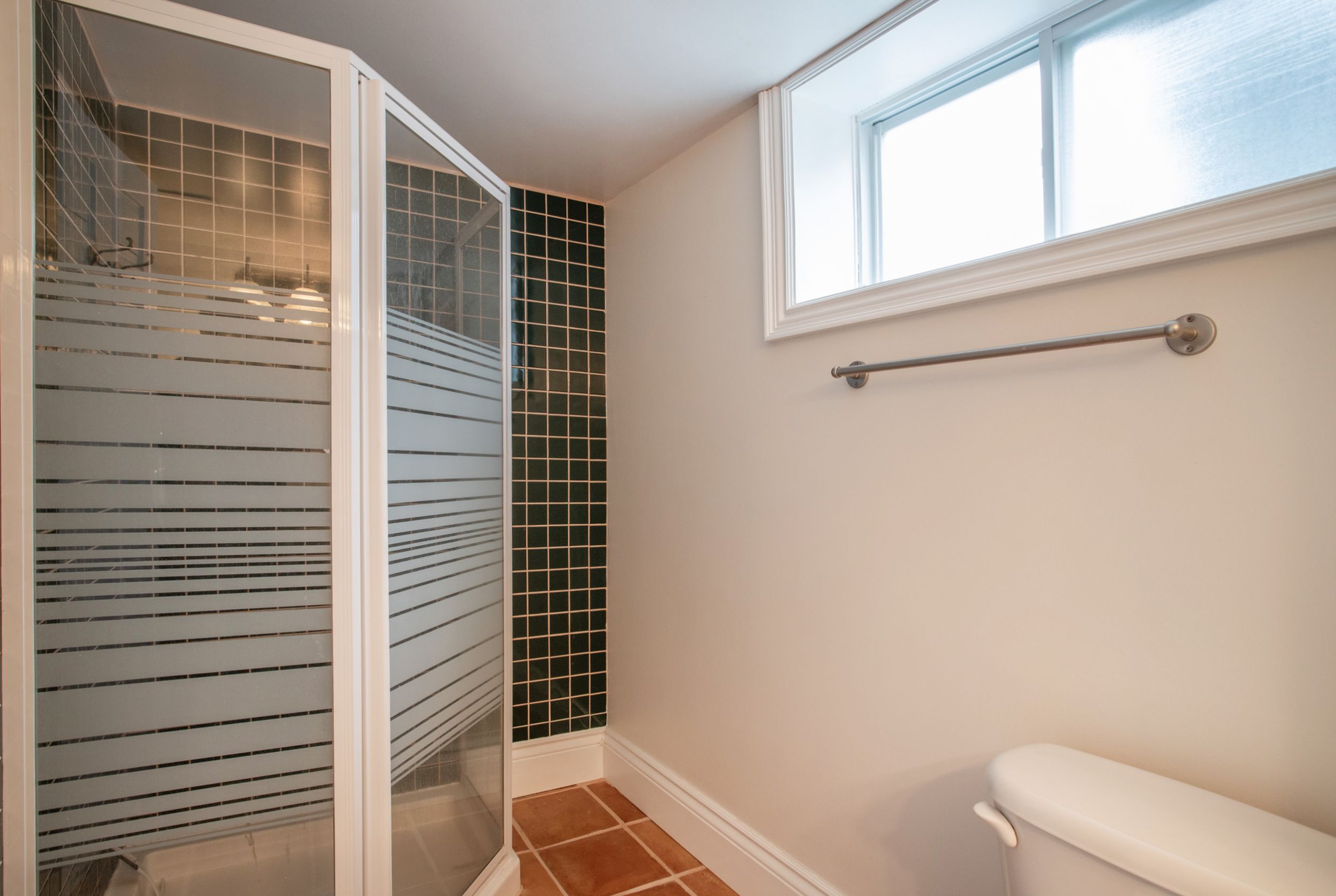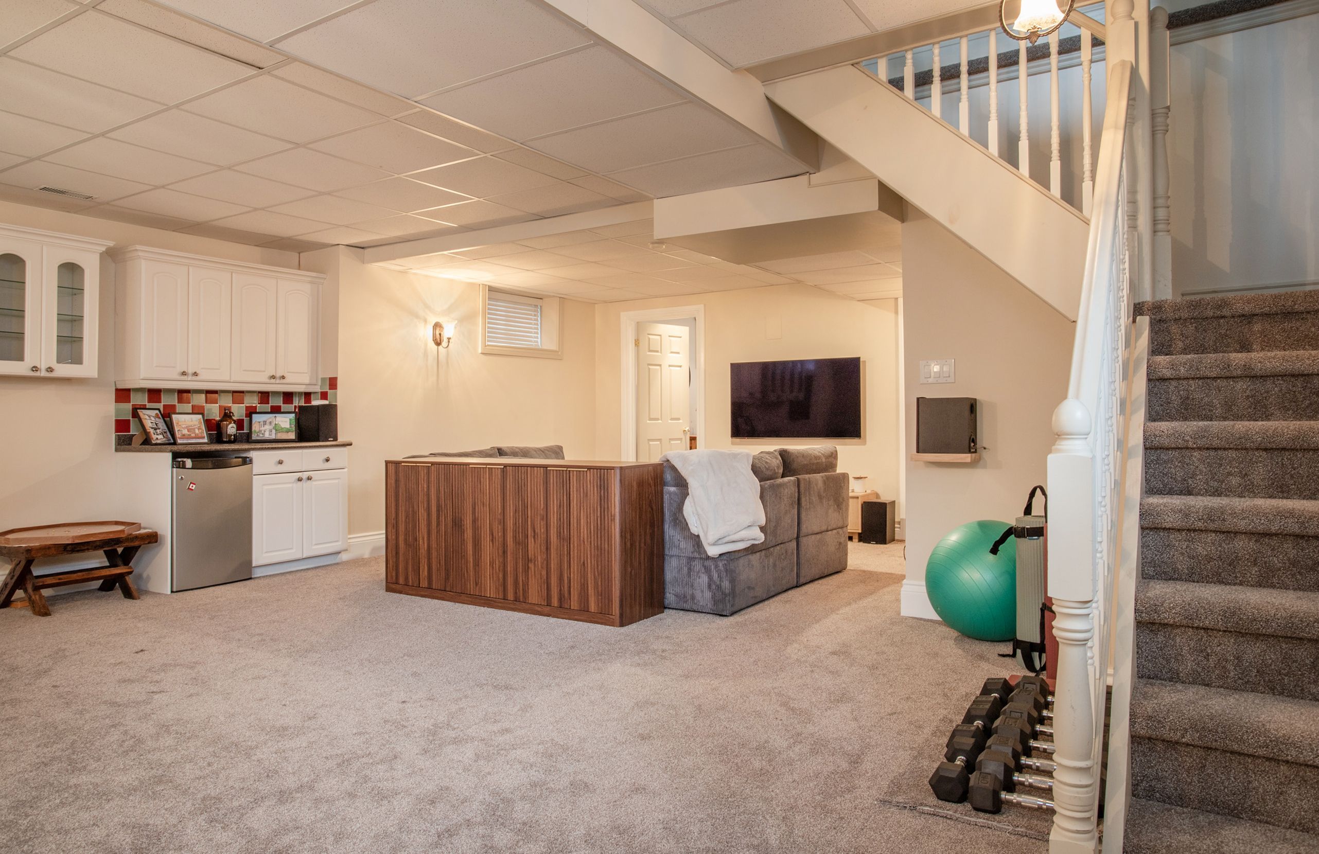 • Bright lower level includes recreation room and private bedroom for guests.