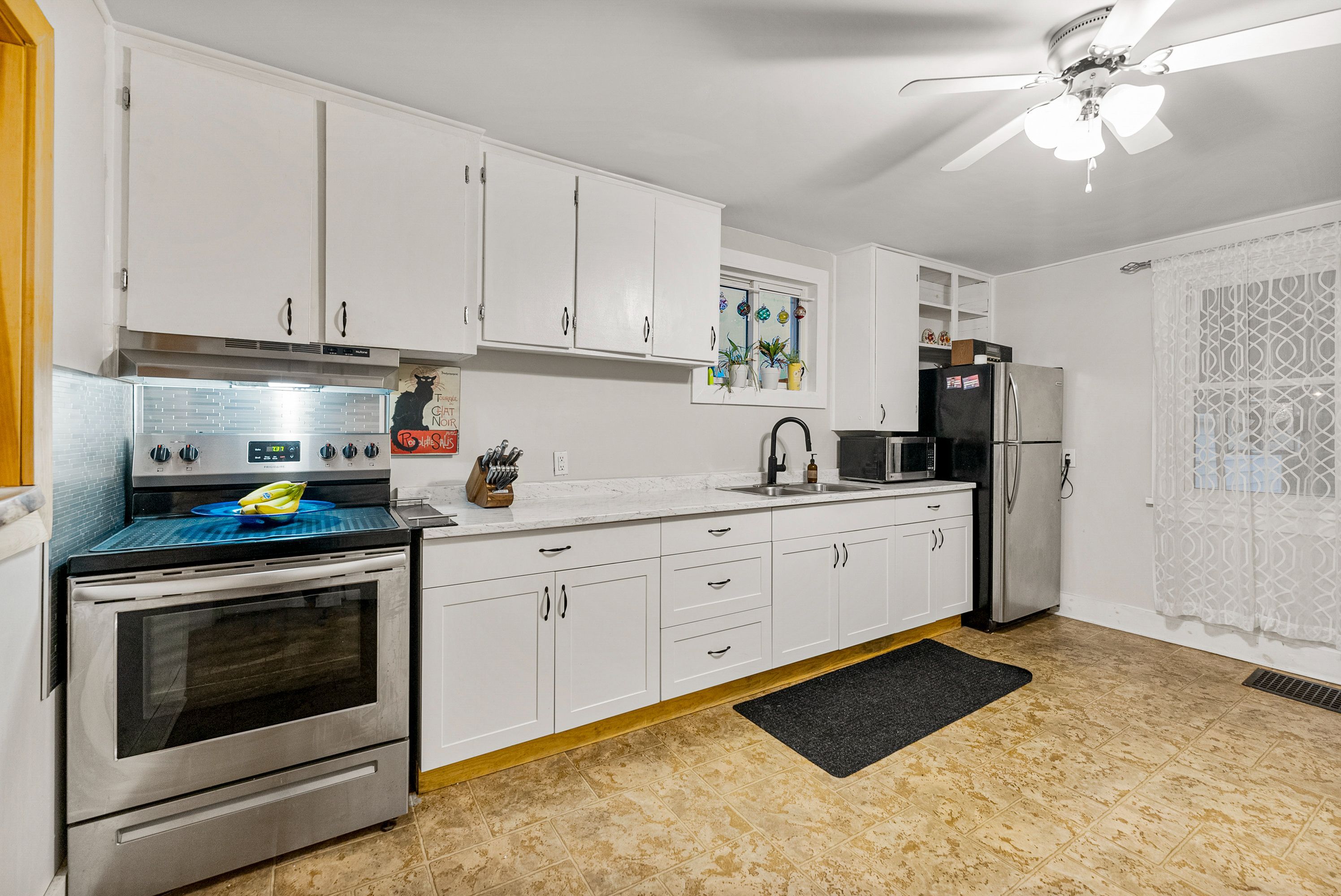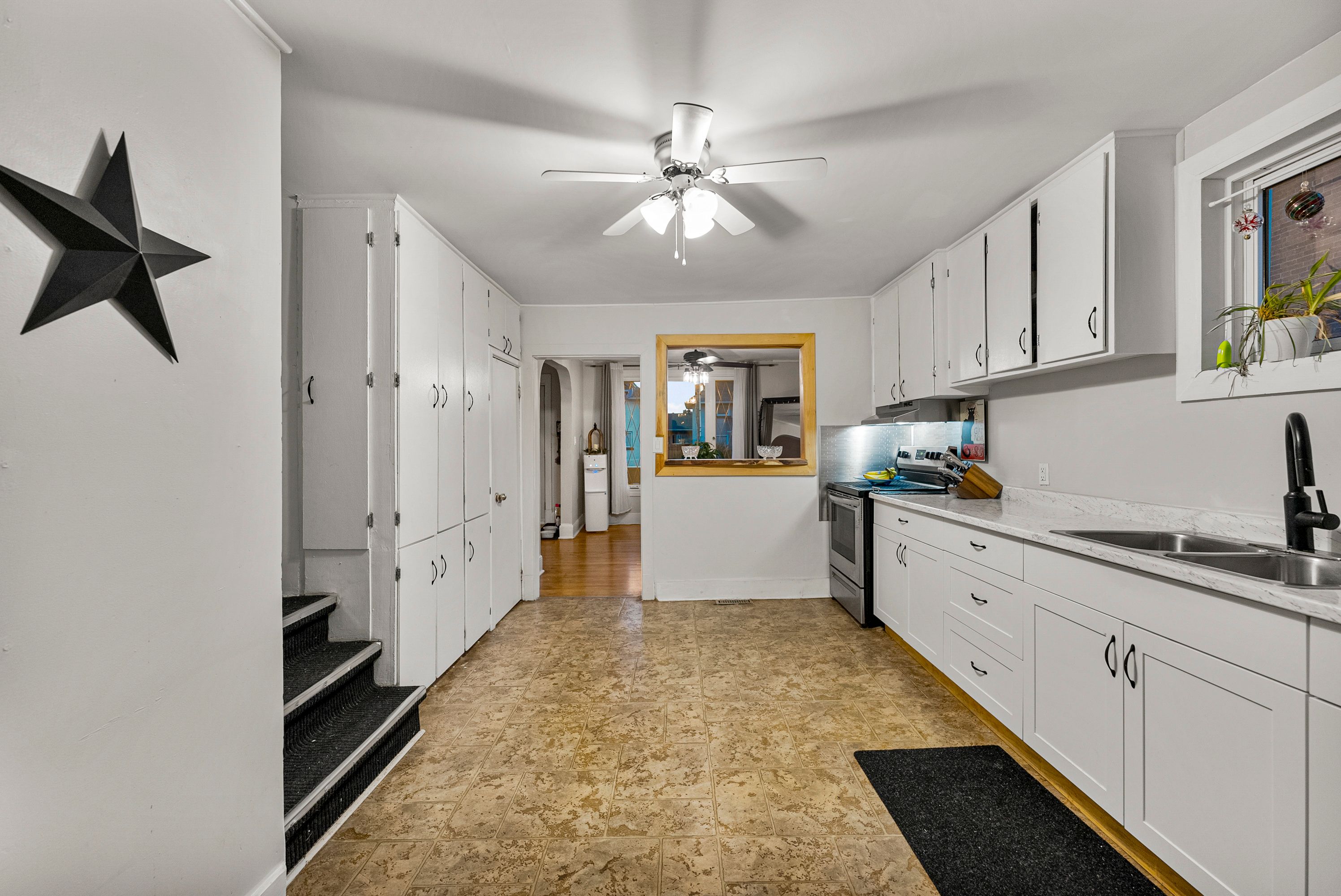 • Bright kitchen with new cabinetry and original built-ins for character.