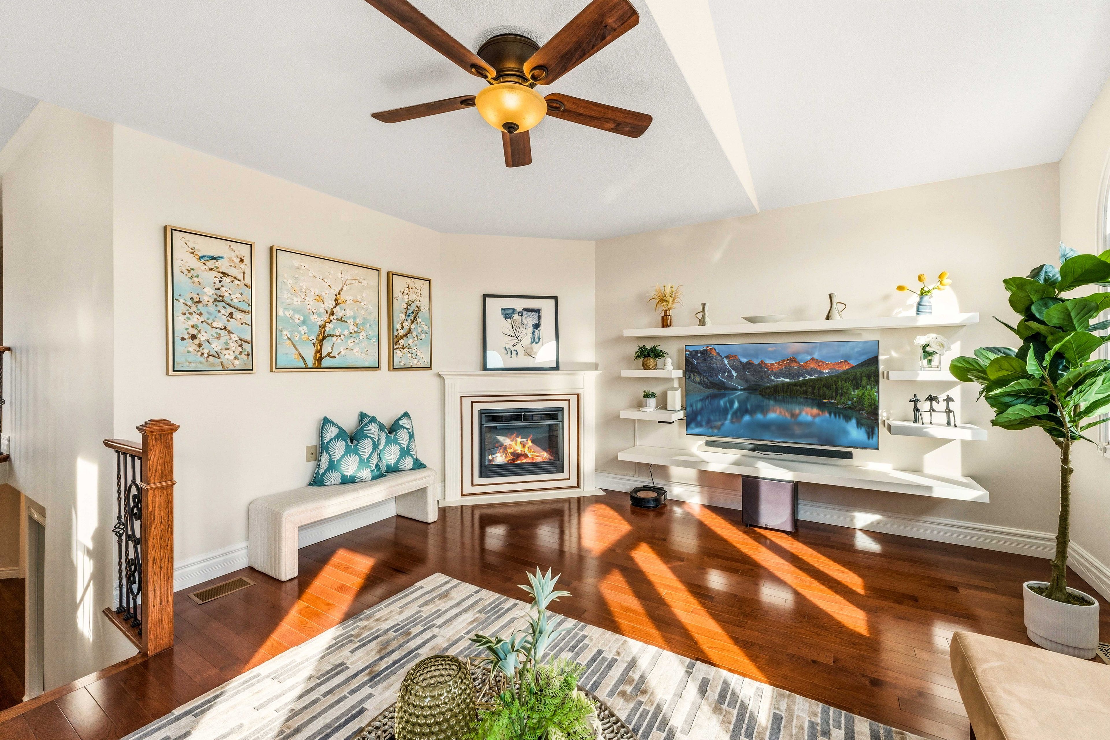 • Bright mezzanine family room featuring panoramic windows and a cozy fireplace.
