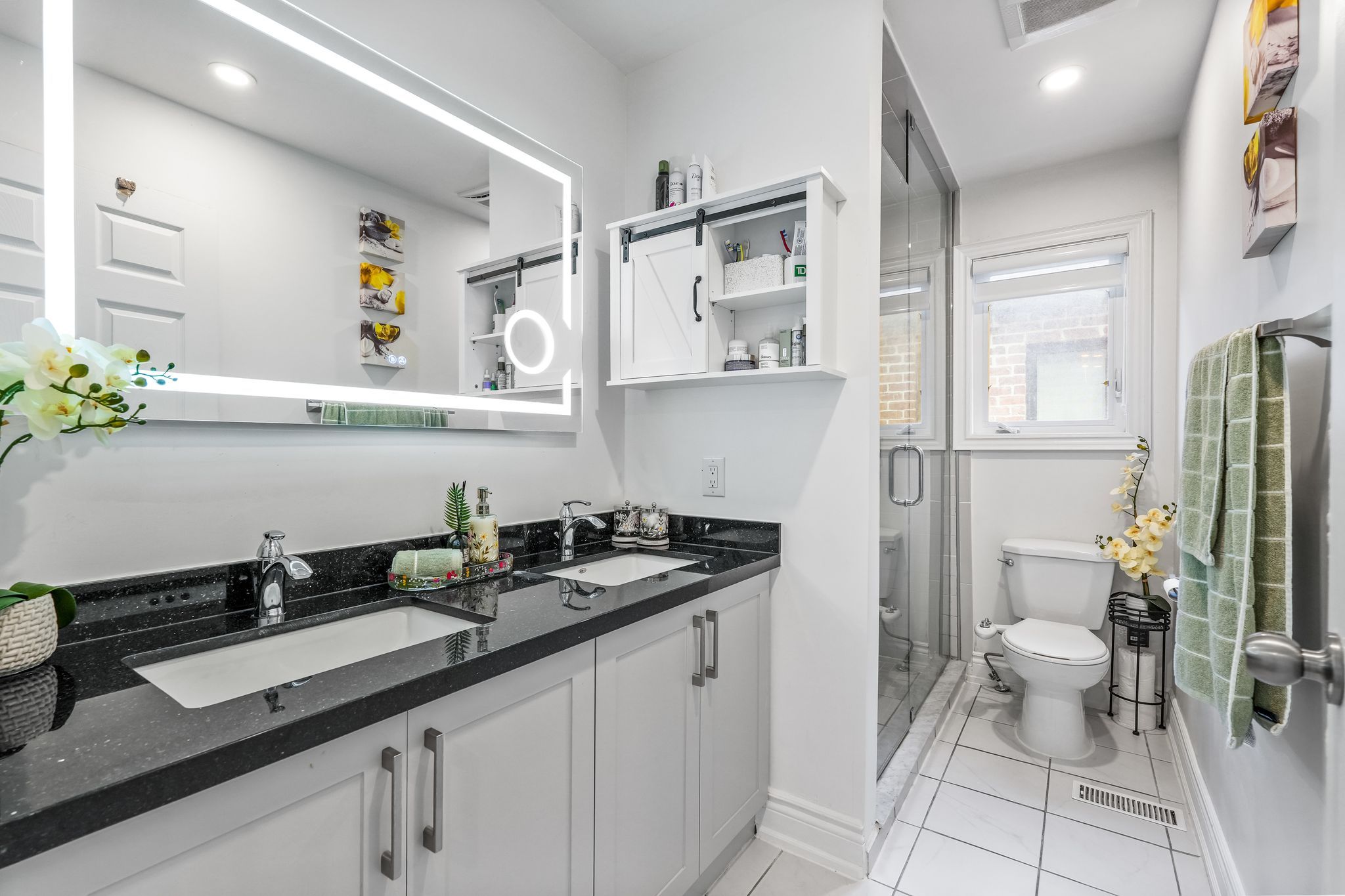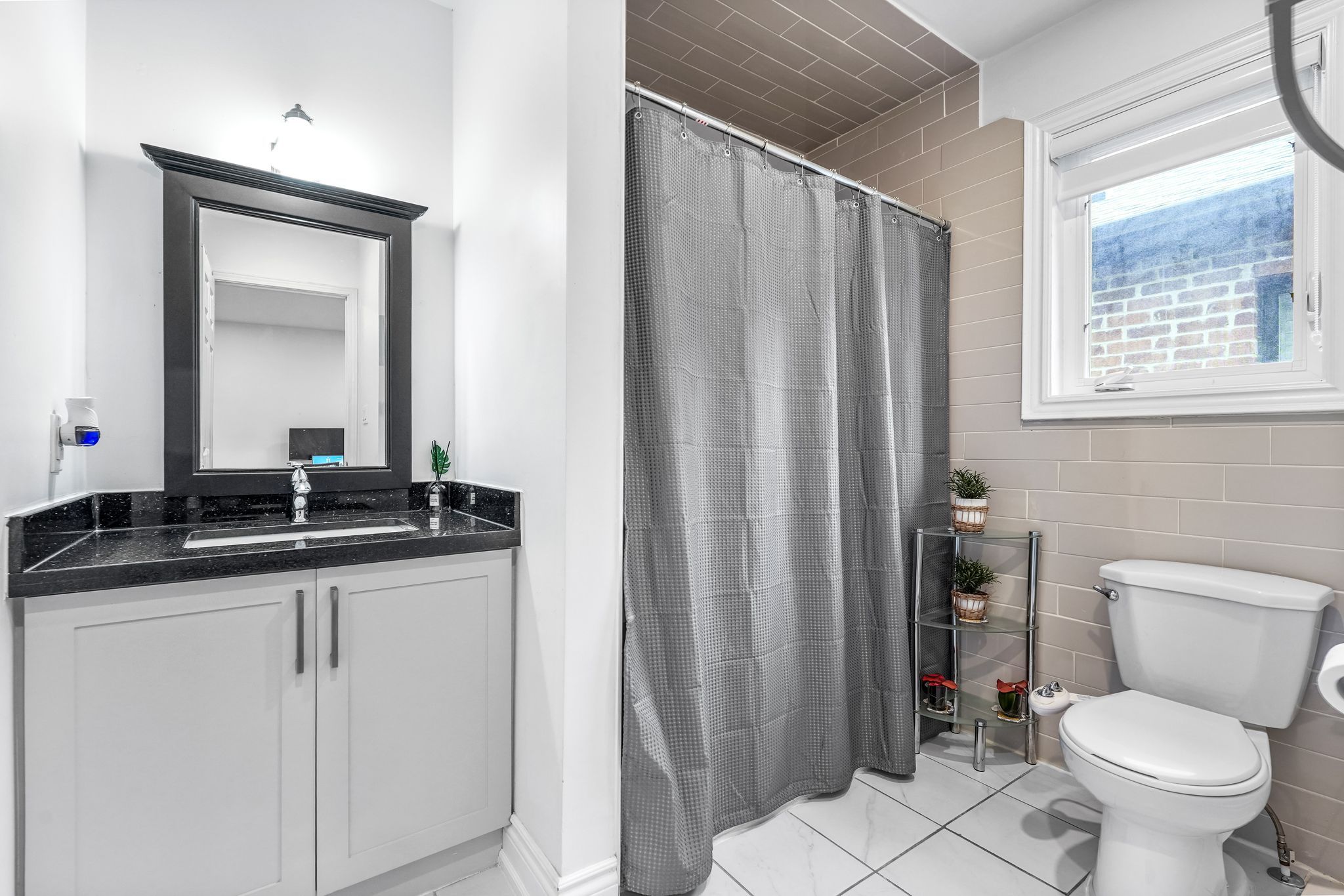 • Gourmet kitchen with quartz countertops and black stainless steel appliances.