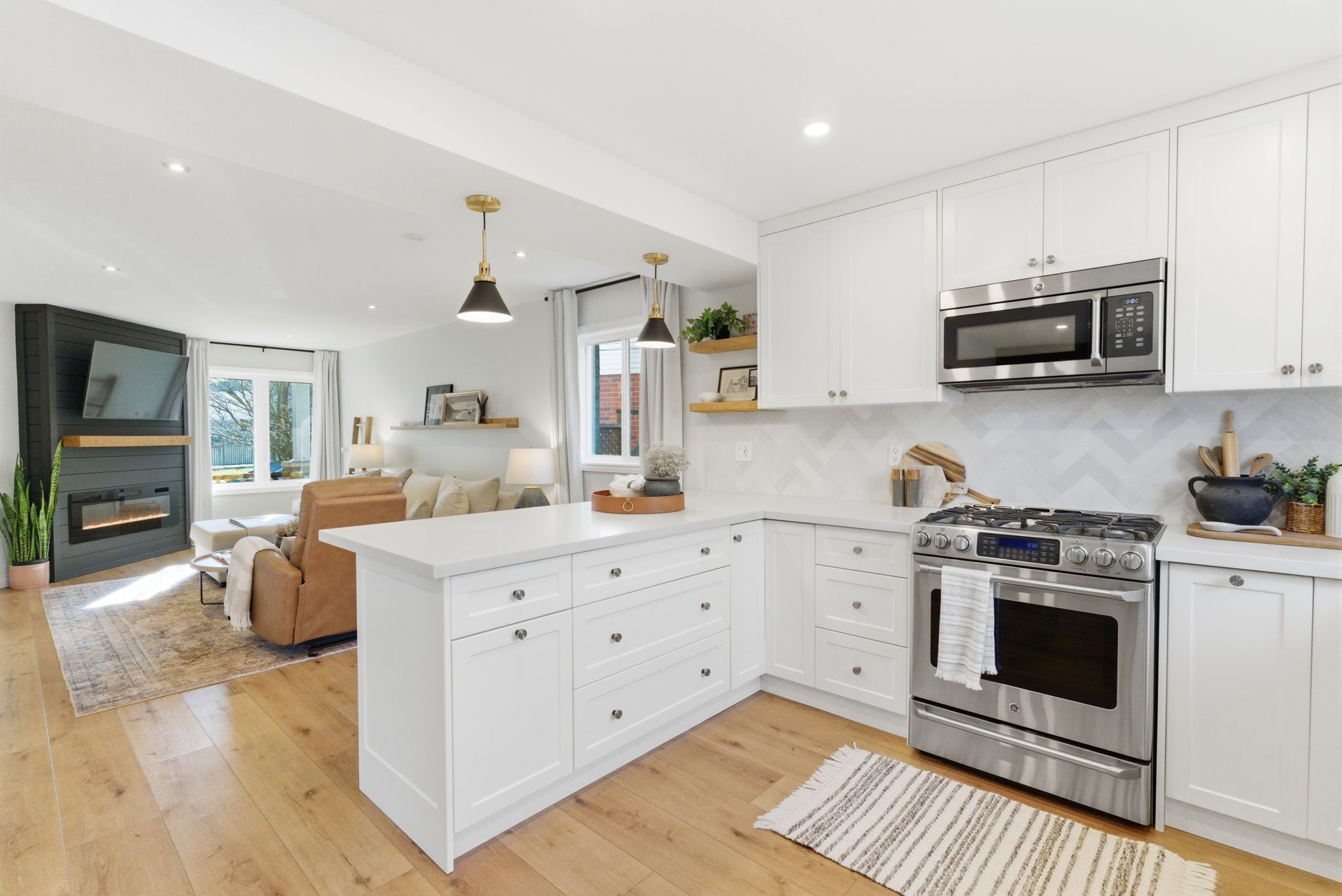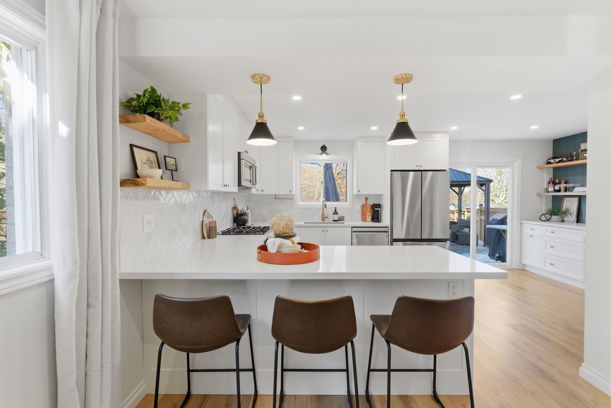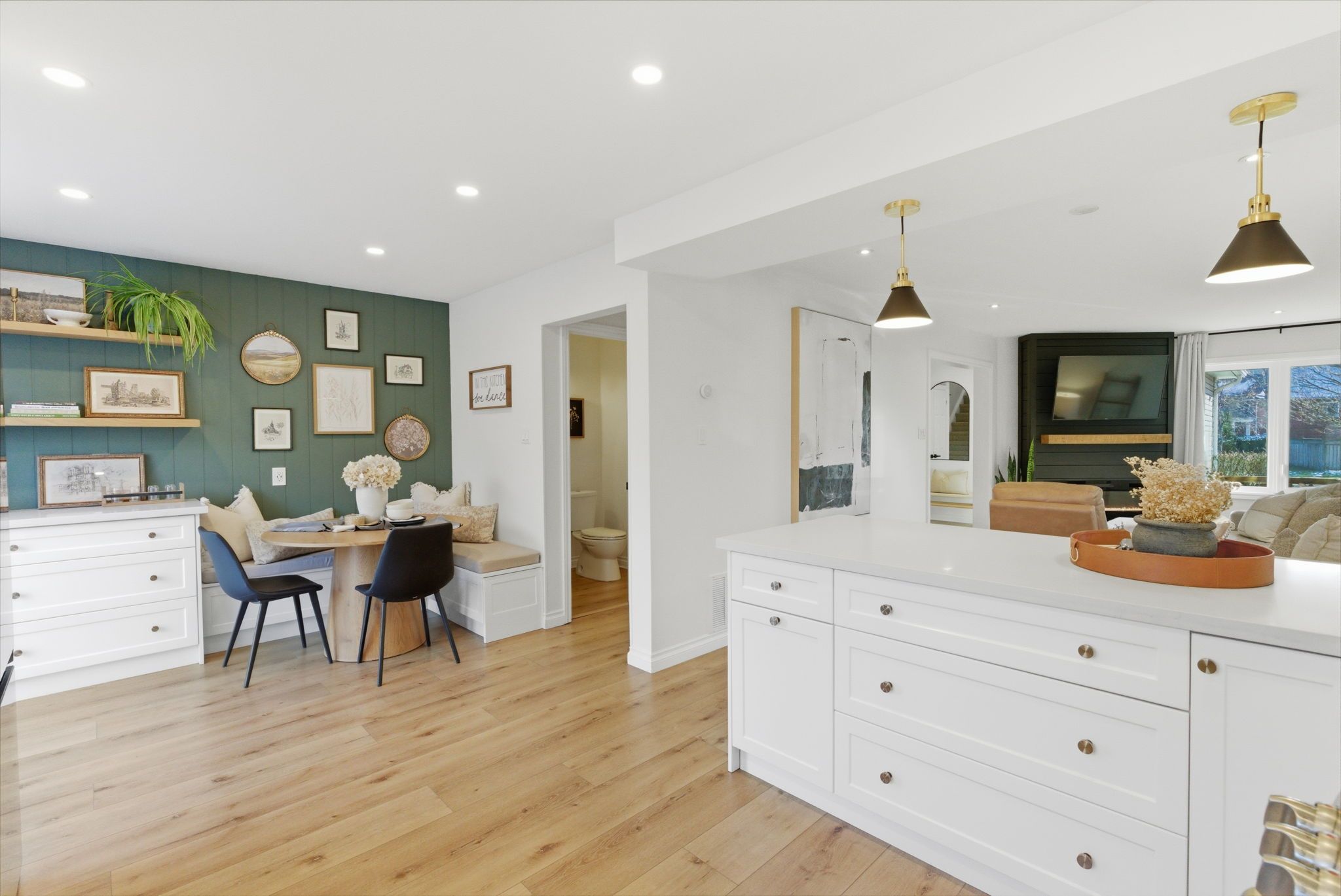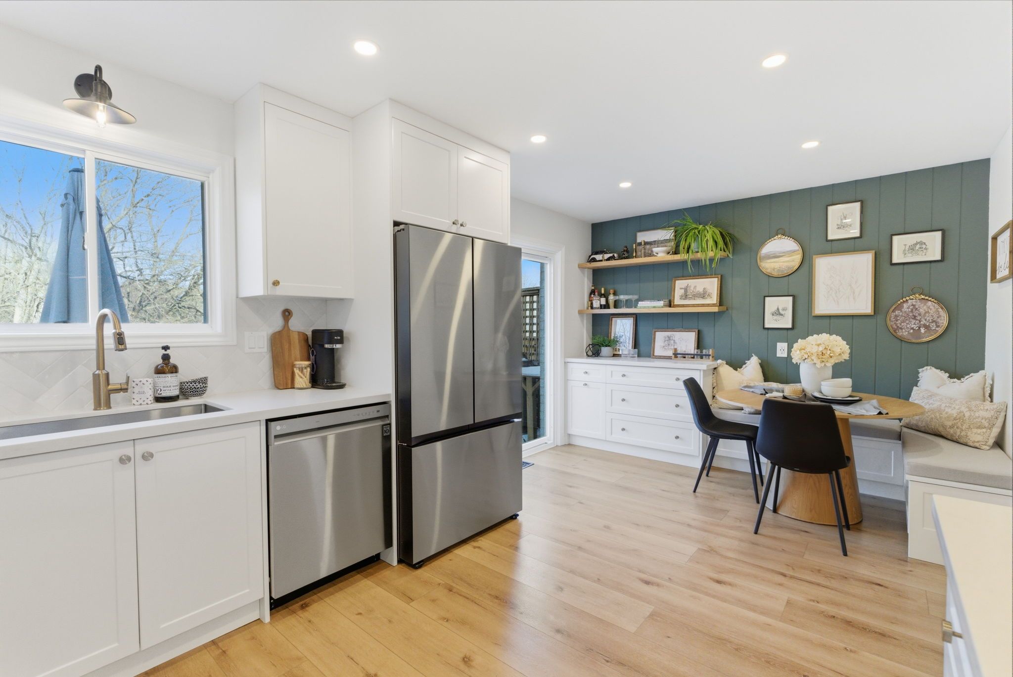 • Stylish open-concept kitchen with custom cabinetry and vintage accents.