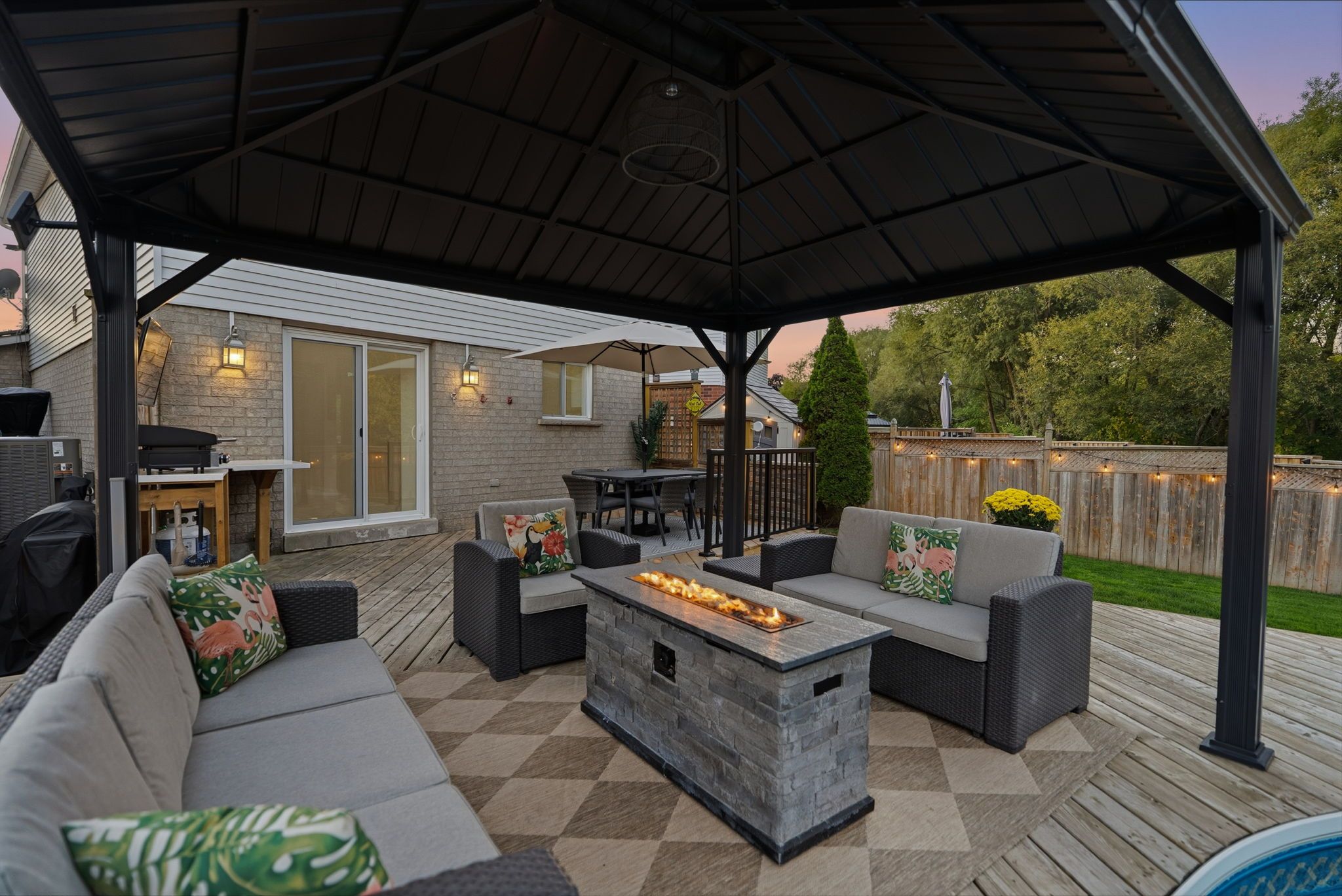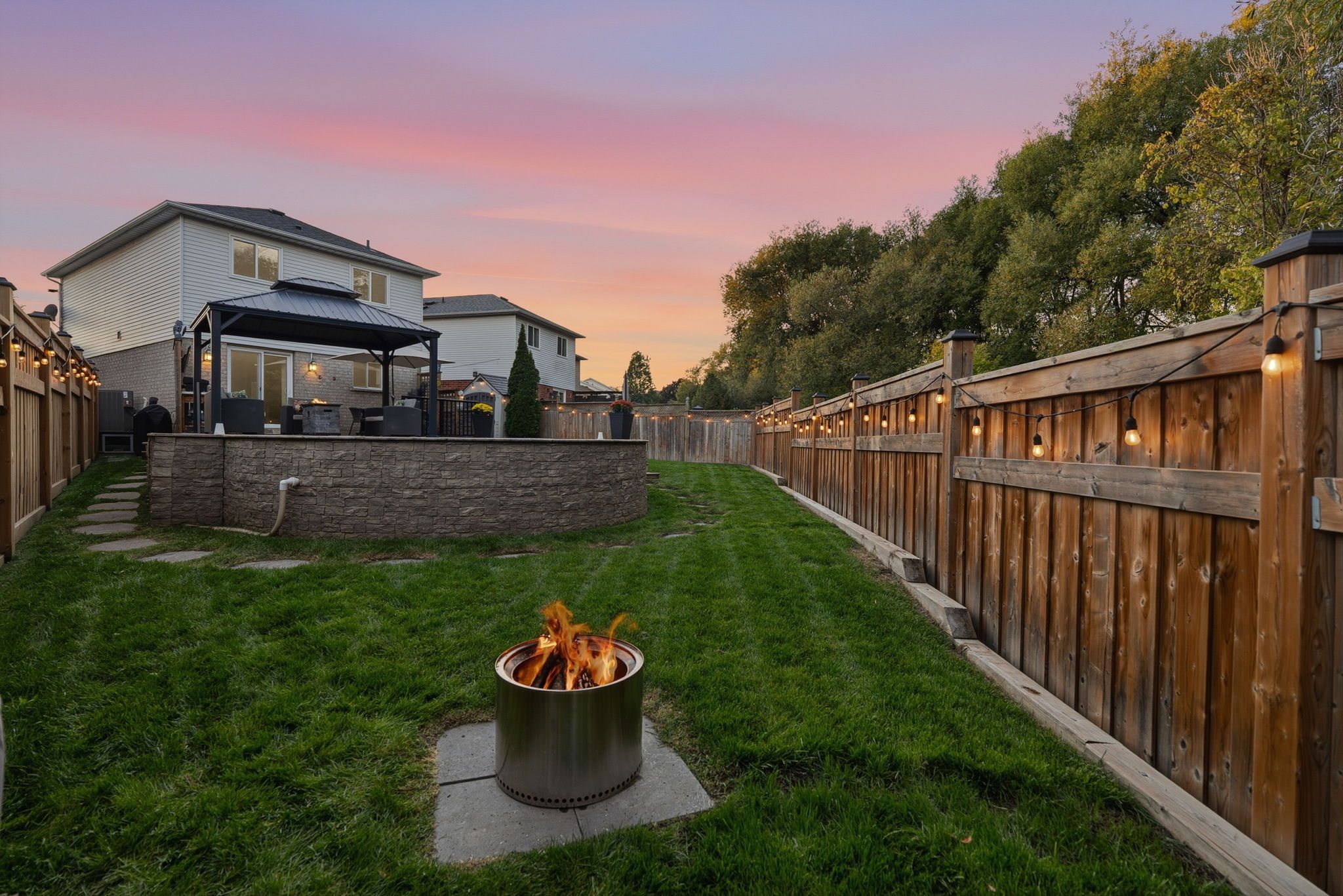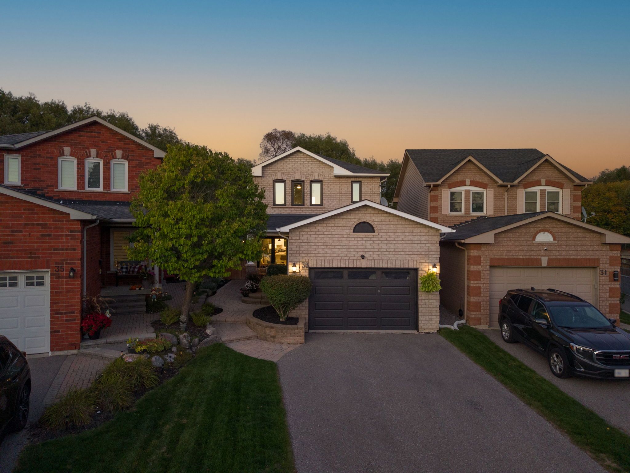 Set on a rare pie-shaped lot backing onto permanent green space, this fully reimagined home delivers a level of design & setting rarely seen at this price point. The backyard is layered & intentional, anchored by an on-ground pool (half inground) & expansive deck with uninterrupted views & trail access. It feels like an escape, without ever leaving home! Curb appeal hits instantly with grey brick, new black windows (2023) & garage door, plus an oversized driveway for 6. Inside, every finish feels considered. Light oak lvp flooring (2023) runs throughout, paired with a scandinavian-meets-vintage aesthetic that feels both fresh & grounded. The open-concept kitchen & living space is anchored by a striking black shiplap electric fireplace. The kitchen, redesigned in 2023, blends function & character with custom cabinetry, quartz counters & a herringbone backsplash that leans vintage in the best way. A built-in banquette dining nook & coffee bar create a space that feels curated, not cookie-cutter, framed by full-height vertical shiplap in a deep, moody green. Walkout to the backyard extends the entire experience. Main floor includes a renovated 2-pc bath. Upstairs, the primary suite is bright & calm with a walk-in closet & fully updated ensuite with glass shower. Two additional bedrooms feature custom built-ins, plus an updated 4-pc bath. The finished lower level continues the same vibe with lvp flooring, offering a family room, play zone & separate flex space for gym, office or guest suite, plus laundry with built-ins. Major updates incl heat pump & furnace (2023), roof (2017), windows & garage door (2023) & garage door opener (2025). Pool sand filter (2025), new liner scheduled may 2026 & partial fence (2024). Set in one of bowmanville's most sought-after pockets, walkable to future go, schools, shops & transit, with easy hwy access!