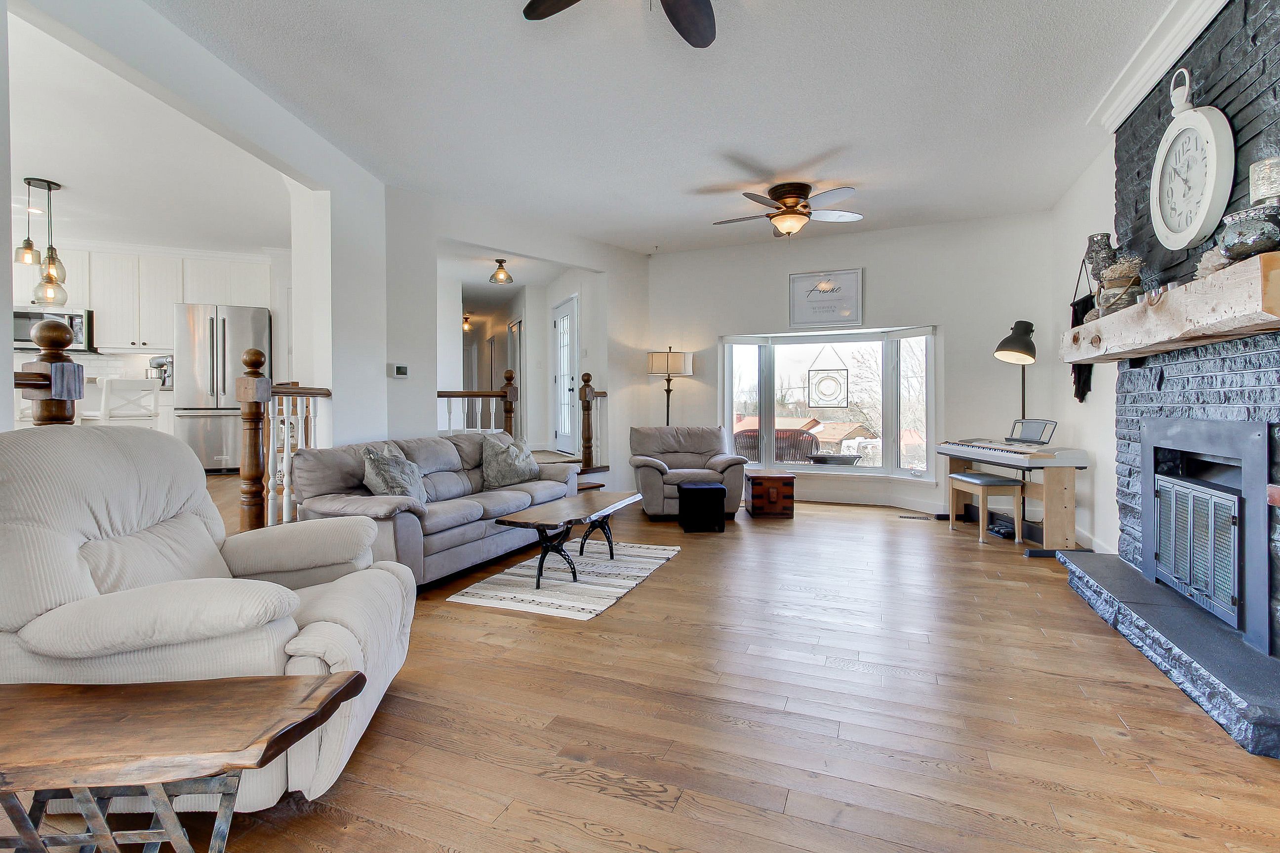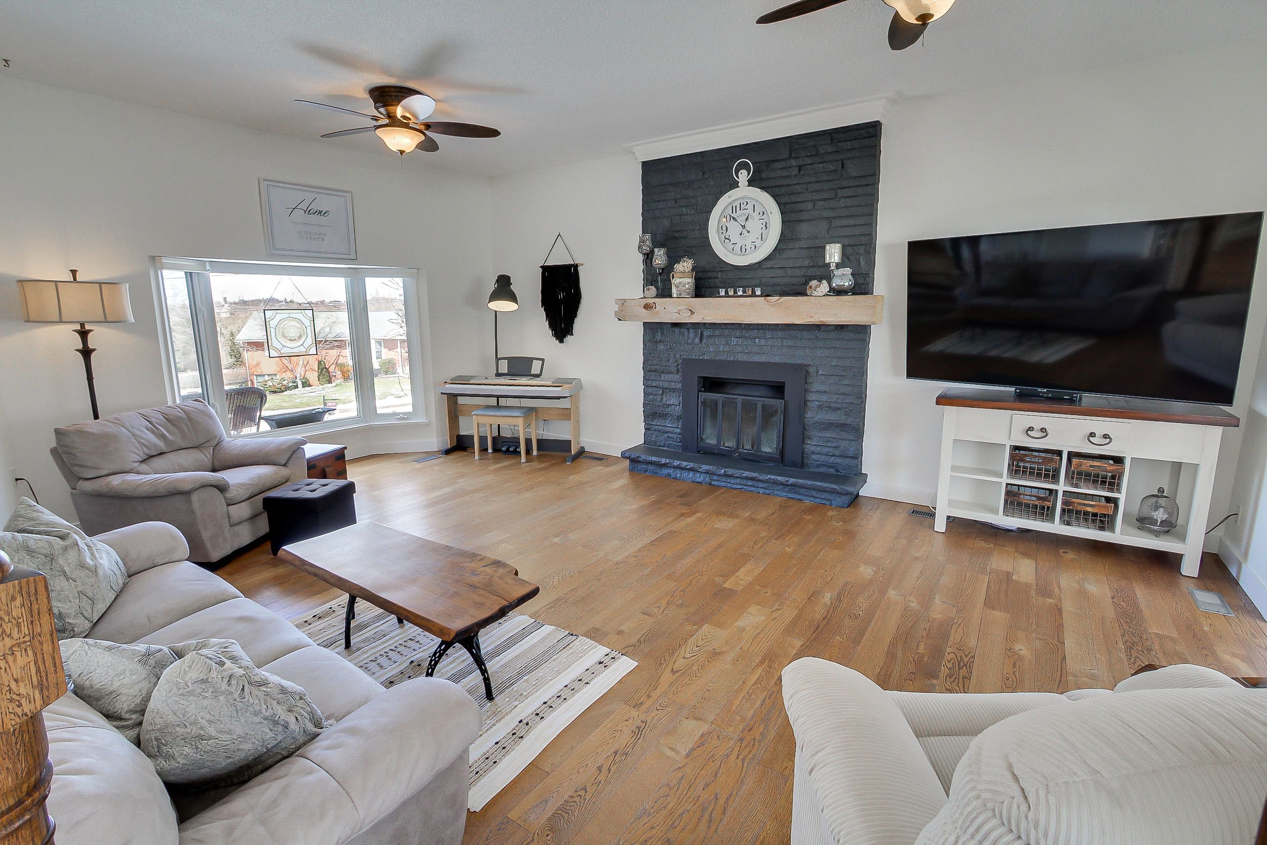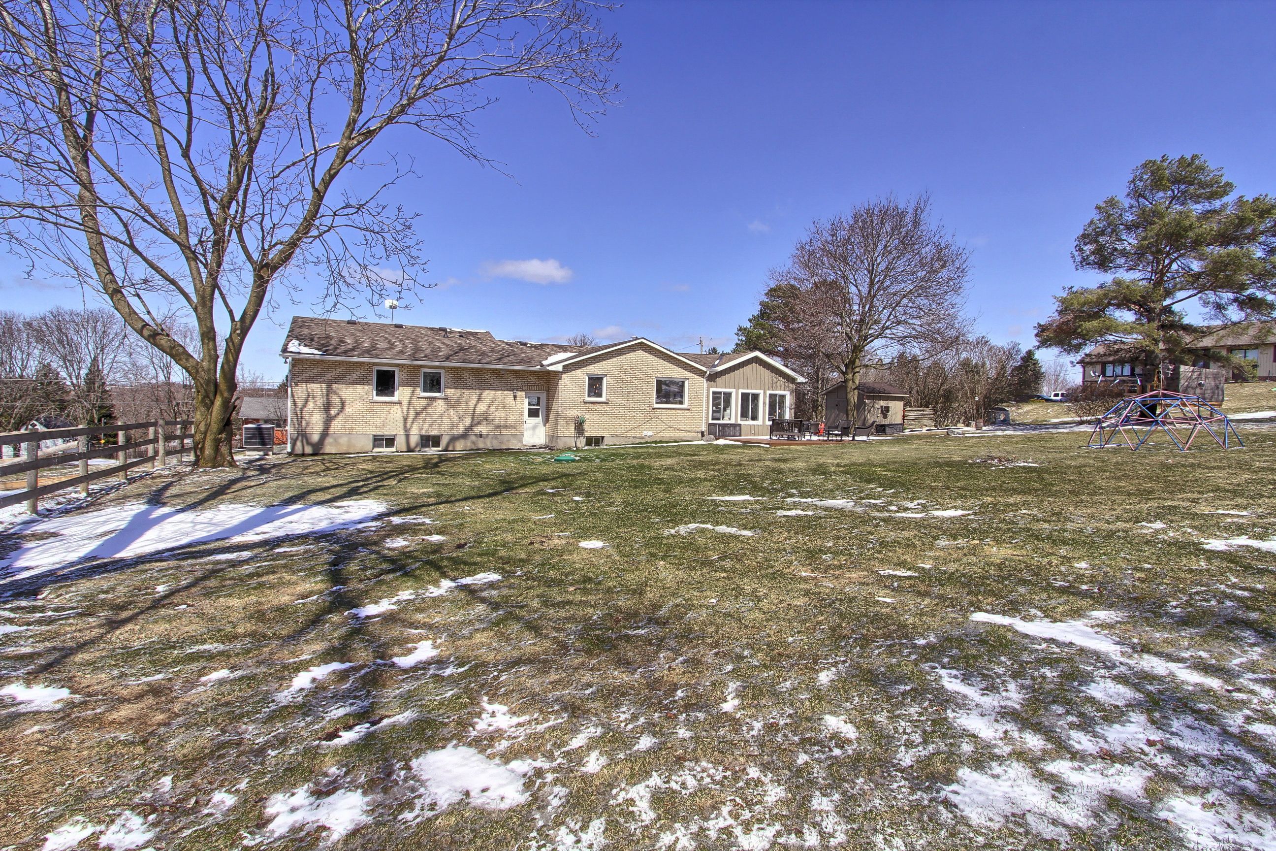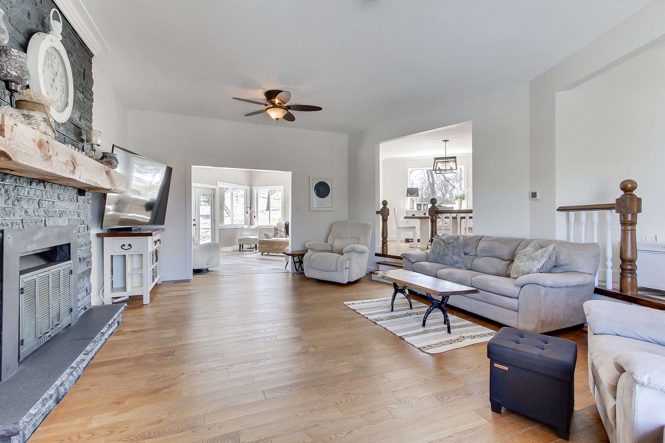Welcome home to this immaculate two-family home! Beautiful bungalow situated on over 1/2 acre backing onto farm fields & adjacent to vacant twnshp lot provides tons of room to live/play/enjoy! Circular paved driveway with parking for 9 vehicles (+ double car garage); 14 ft x 15 ft front deck; professionally landscaped with armour stone; come inside to hardwood & tile throughout; 3 bdrms on main floor; master with w/i closet & 4 pc ensuite; large updated kitchen with quartz counters & centre island, large sunken living room with fireplace opens up to a bright 4-season sunroom/family room; main floor laundry; 2 walk outs to yard & 14' x 19' composite deck with calming & private views; downstairs is a 4-yr-old/2 bedroom apartment with full eat-in kitchen with quartz counters, family room, separate laundry & 4 pc w/room; separate entrance allows for $$$$ rental income; or bring your extended family to join you; electrical panel 2021, furnace & heat pump 2021; survey attached; this home shows true pride of ownership exuding warmth & beauty; a must see to appreciate!