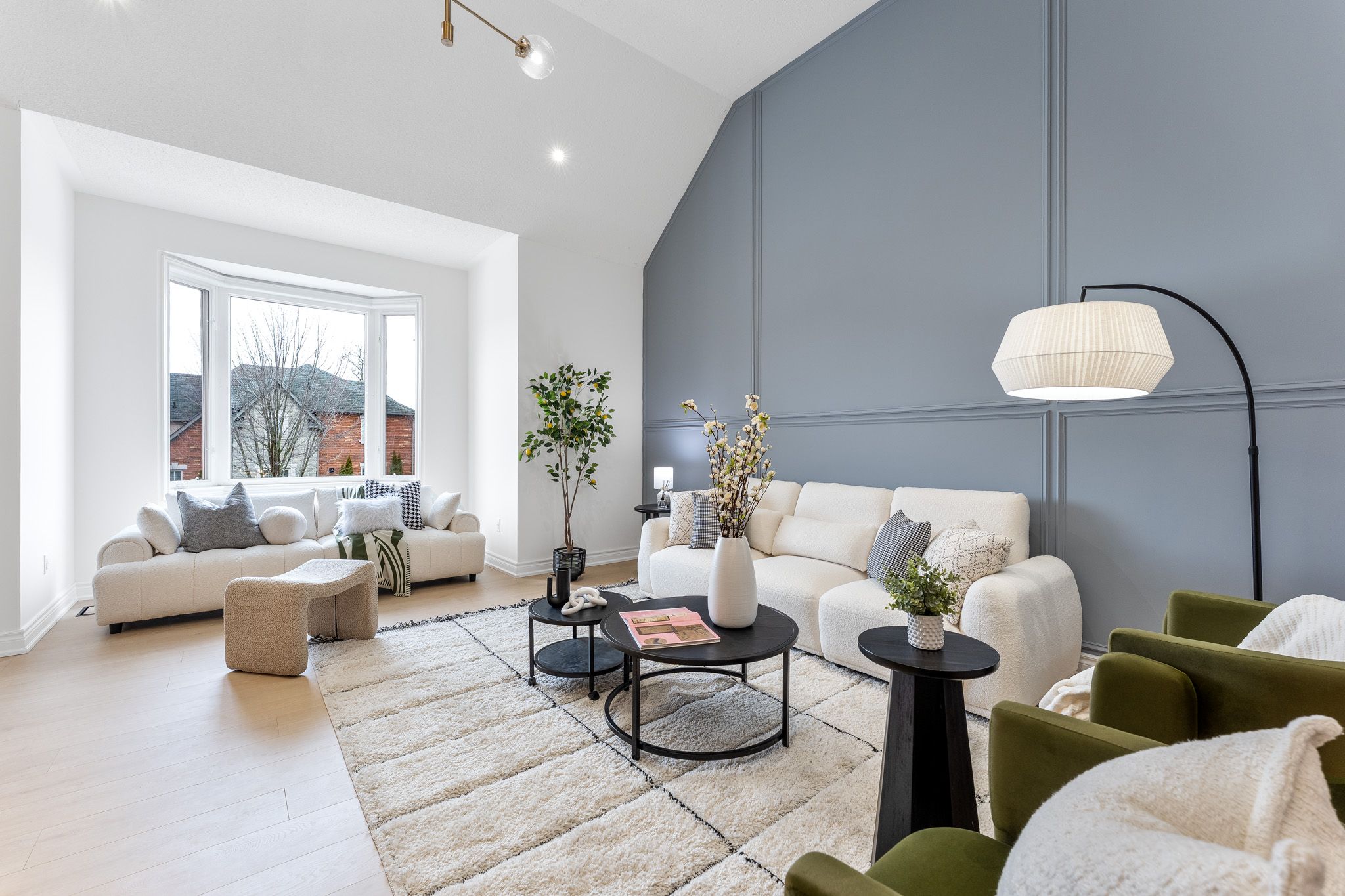 • High-ceiling living room filled with natural light.