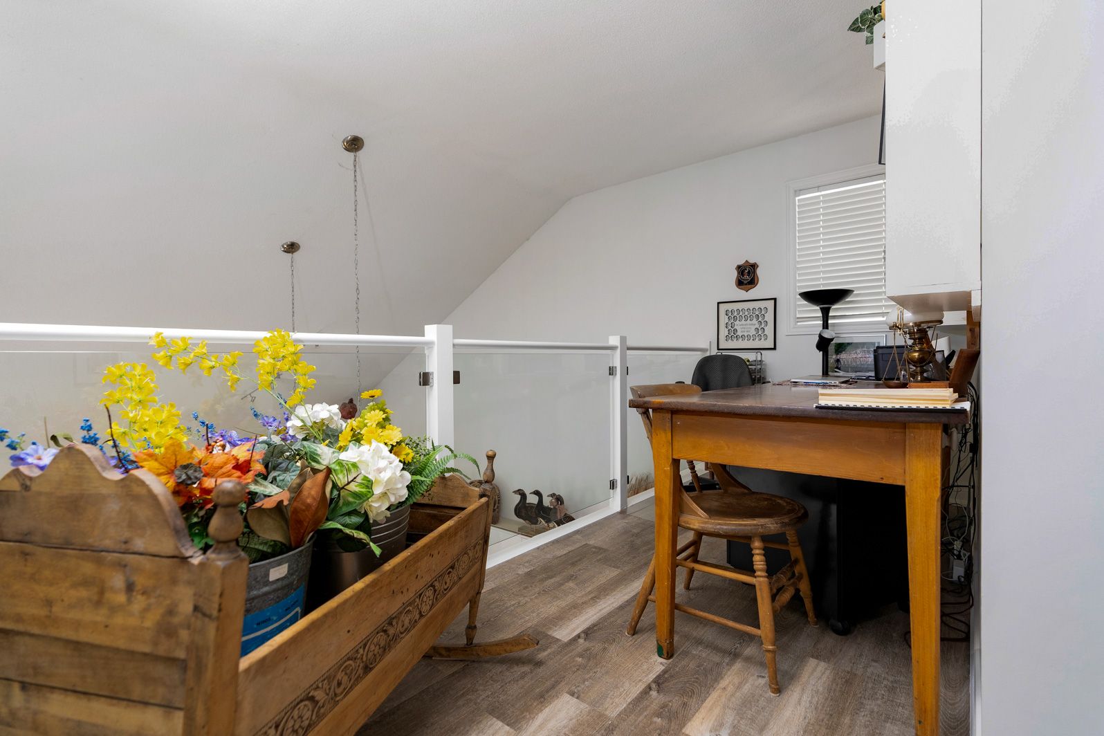 • Backyard deck with garden area full of colorful perennials.