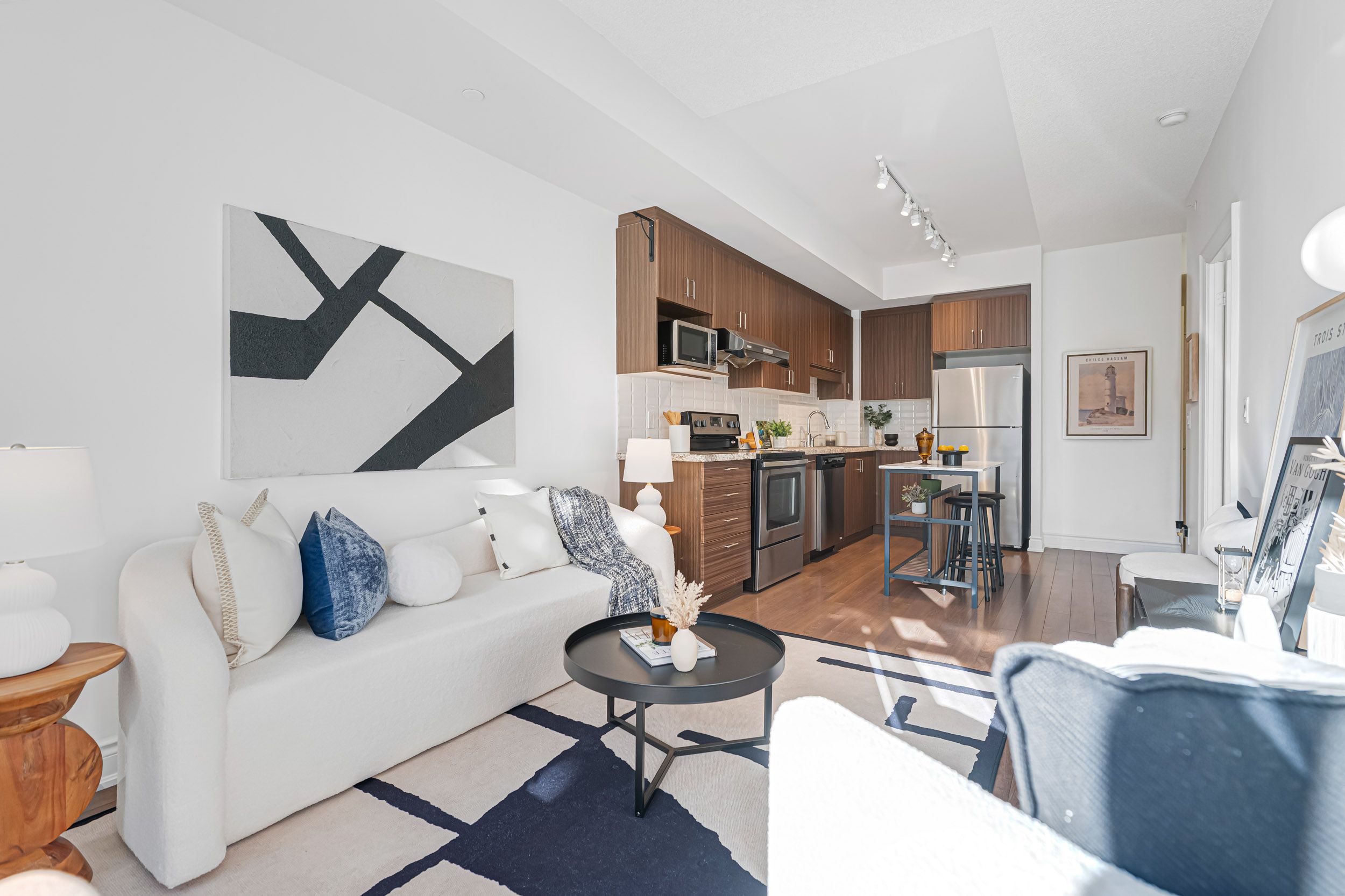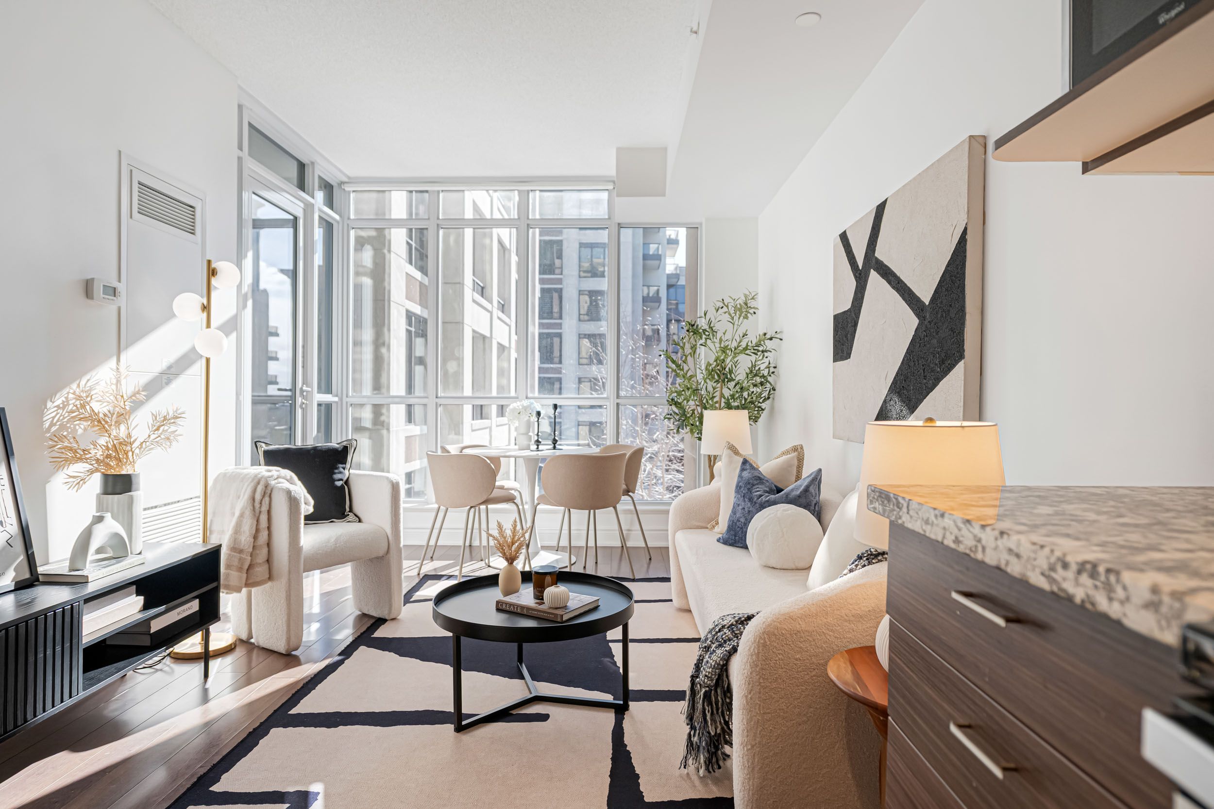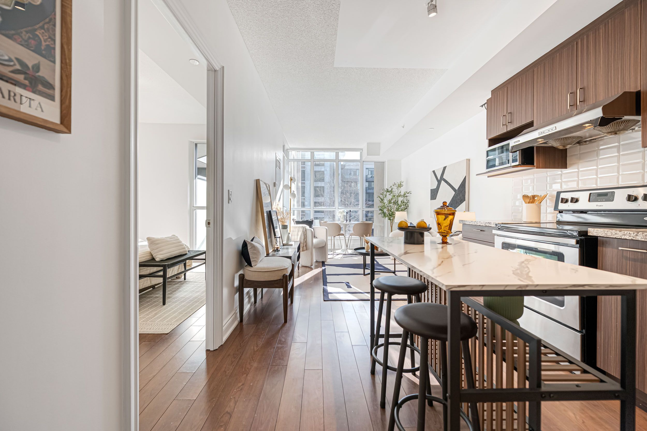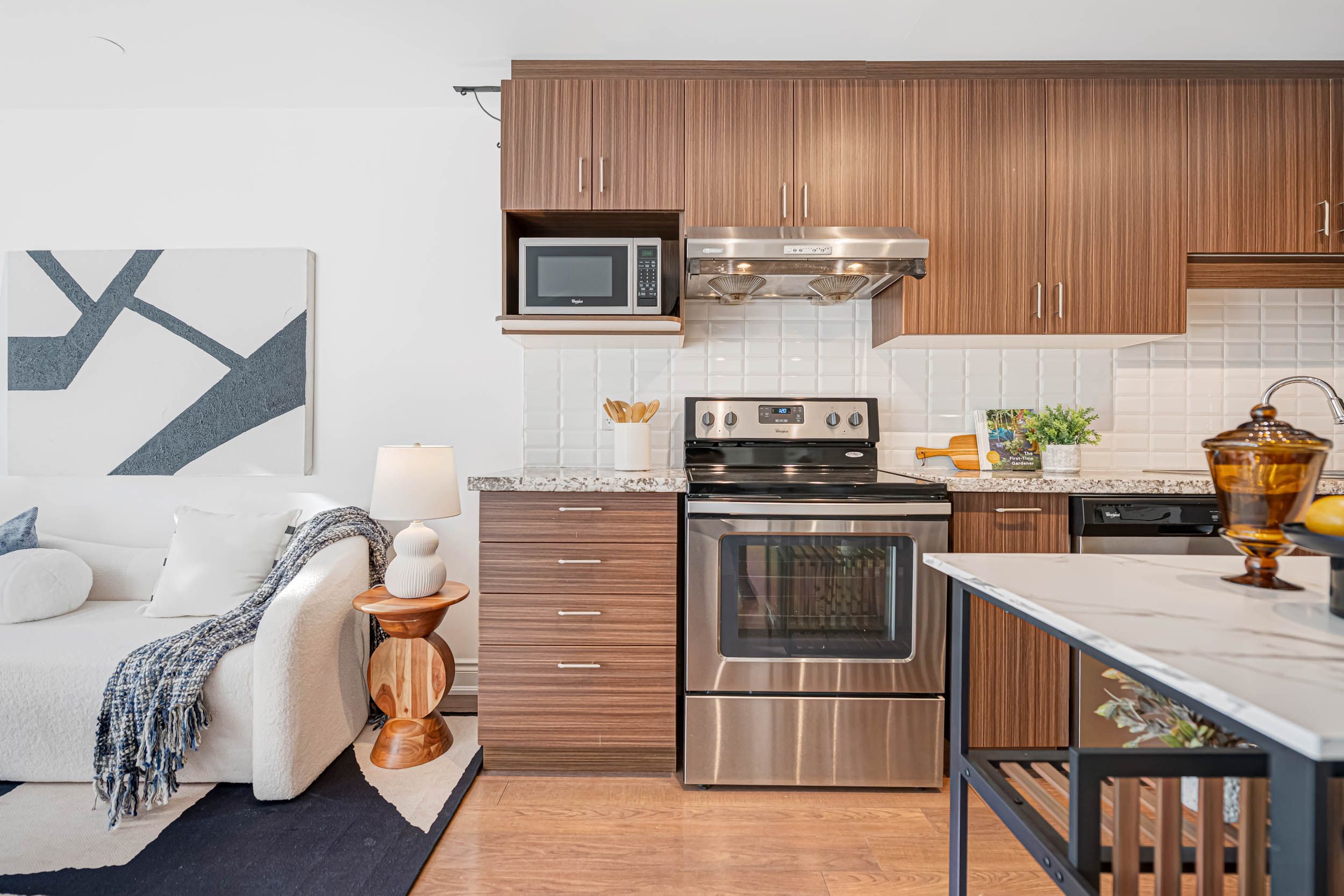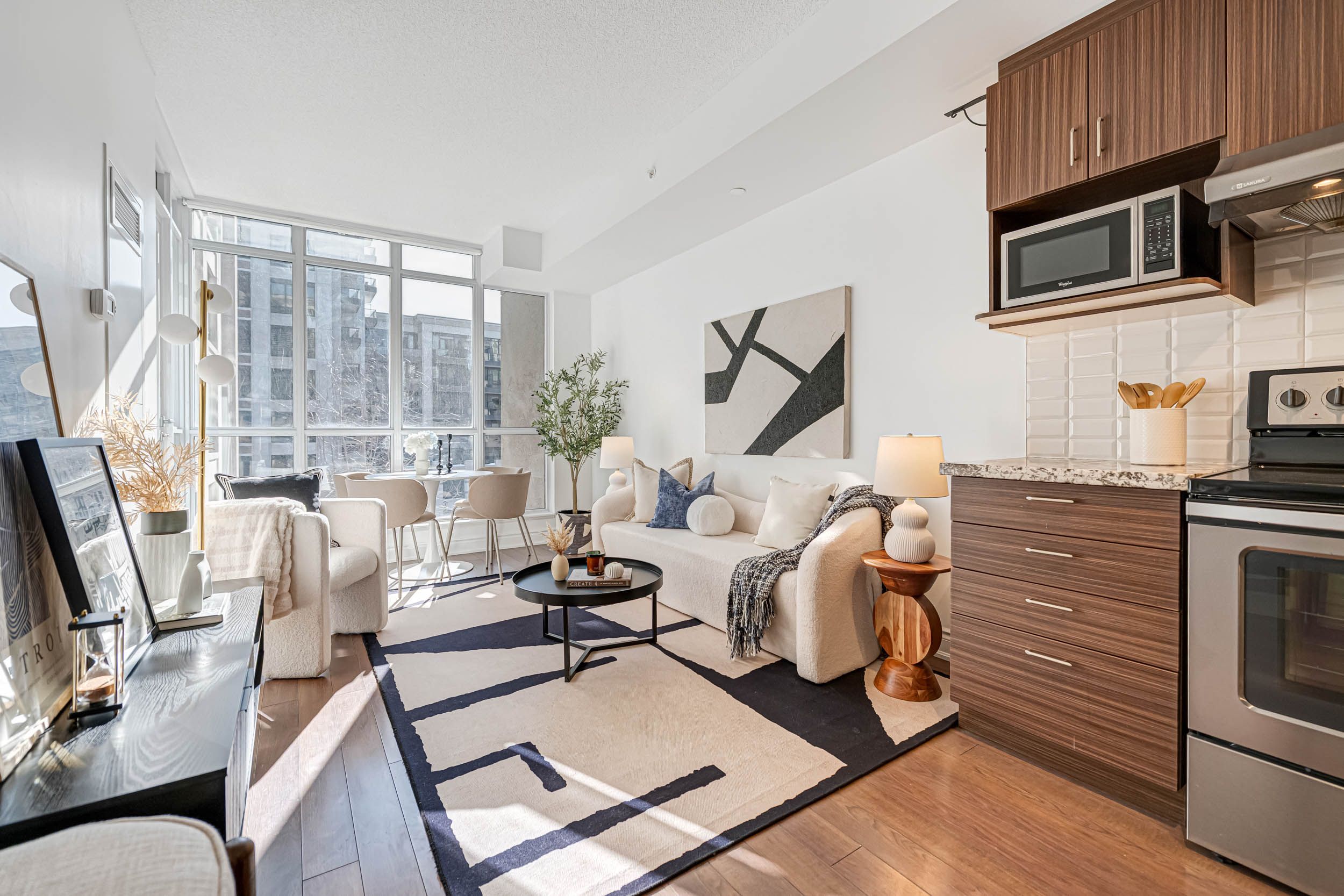 • Spacious 1-bedroom layout with 9-foot ceilings for a luxurious feel.